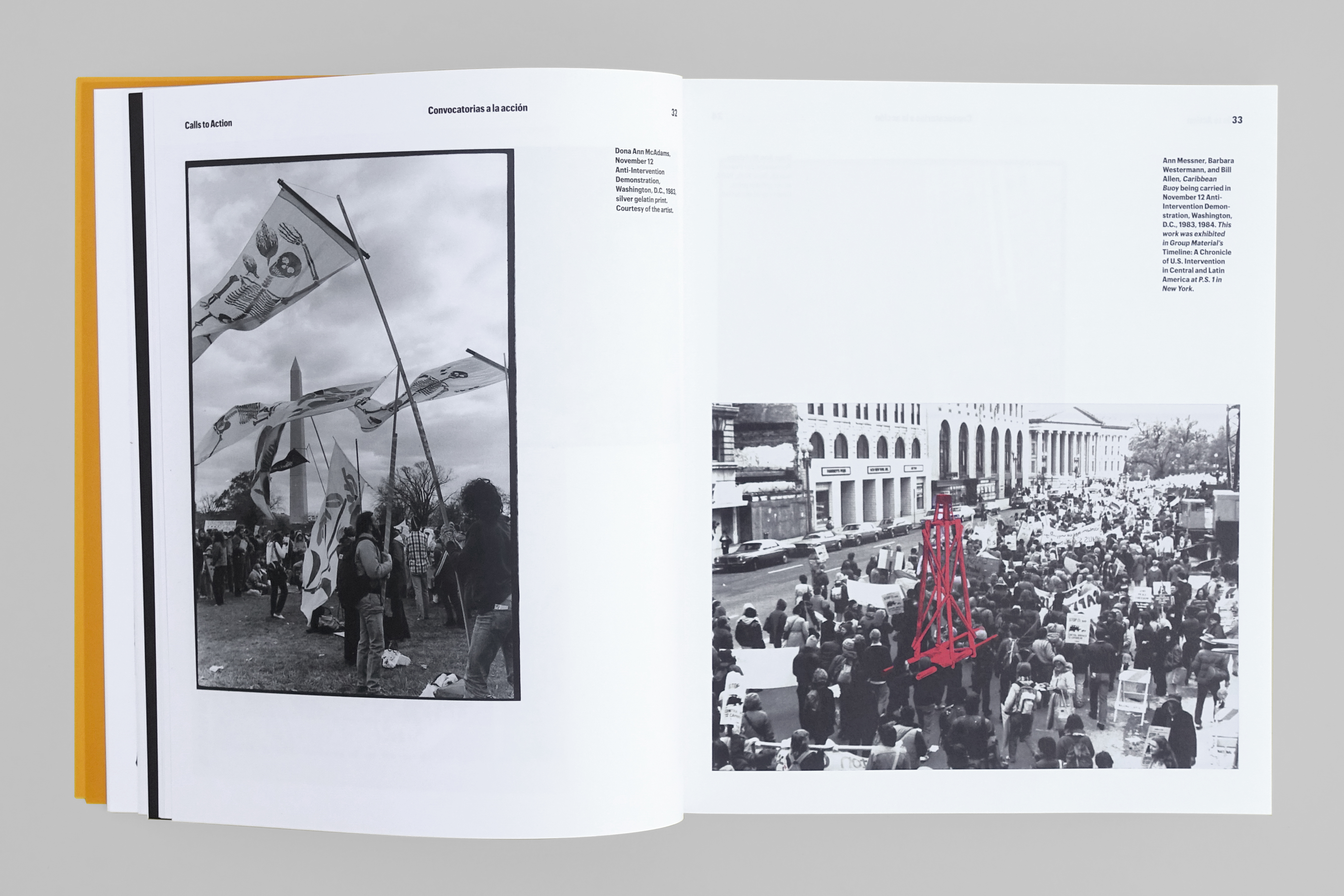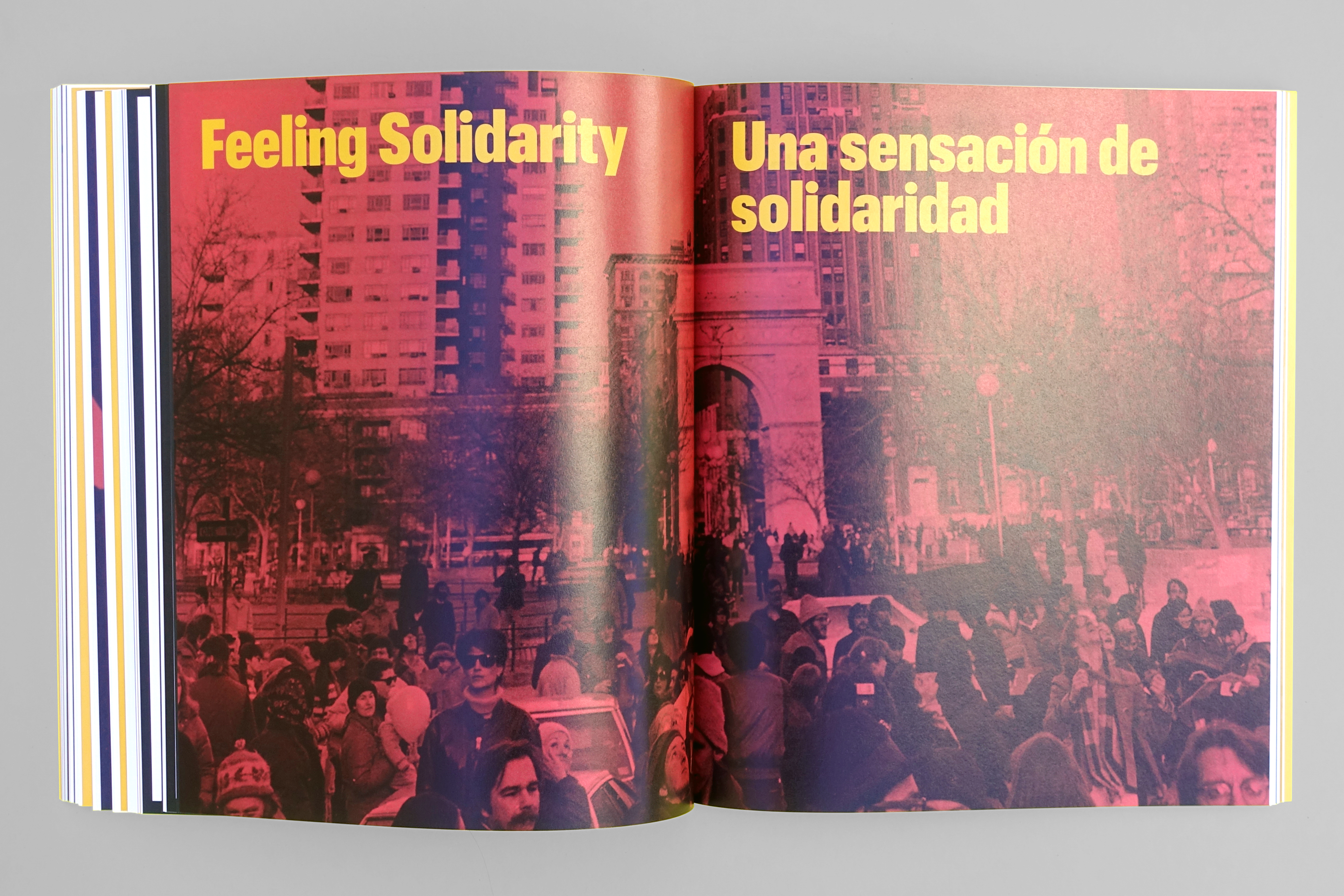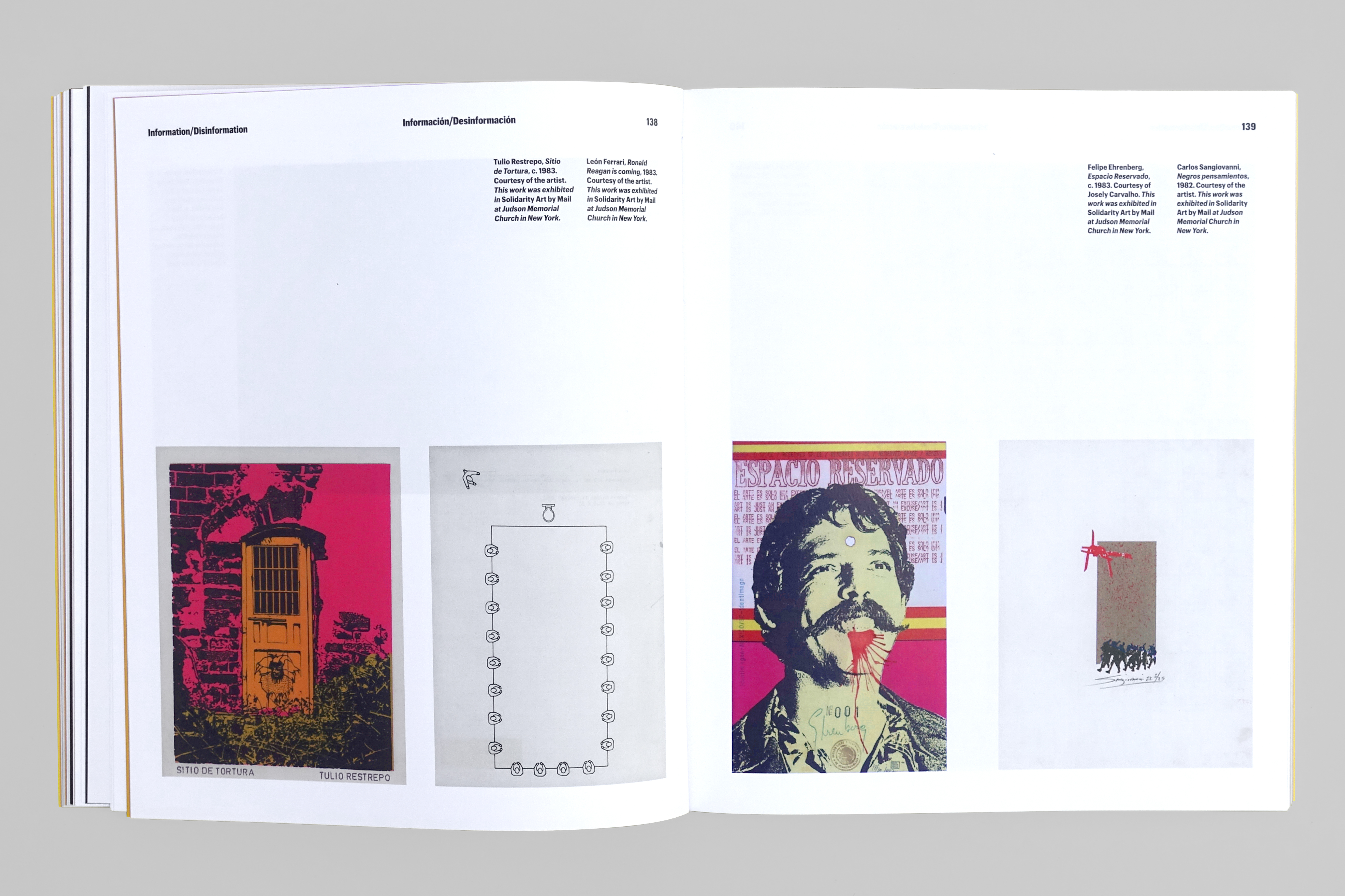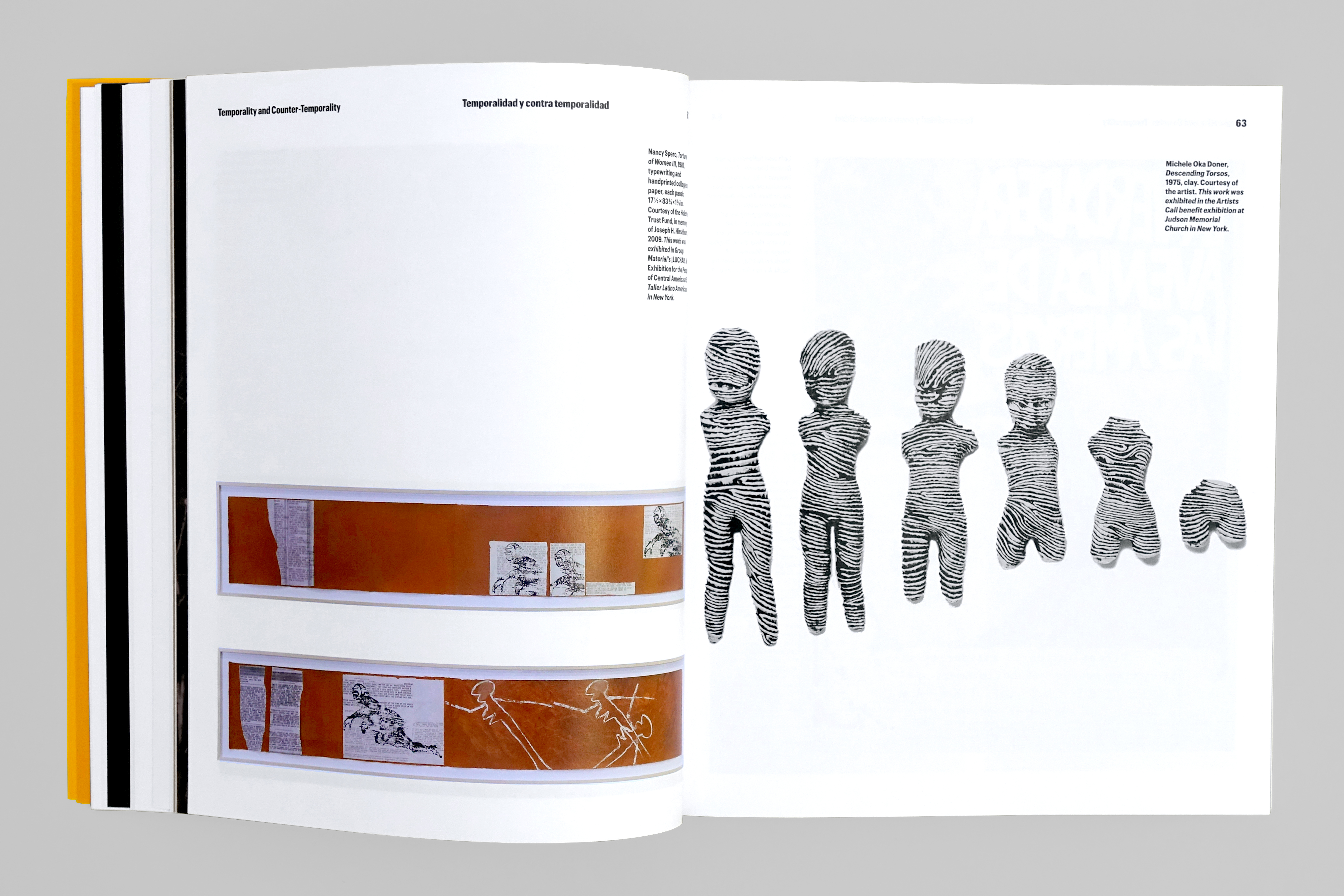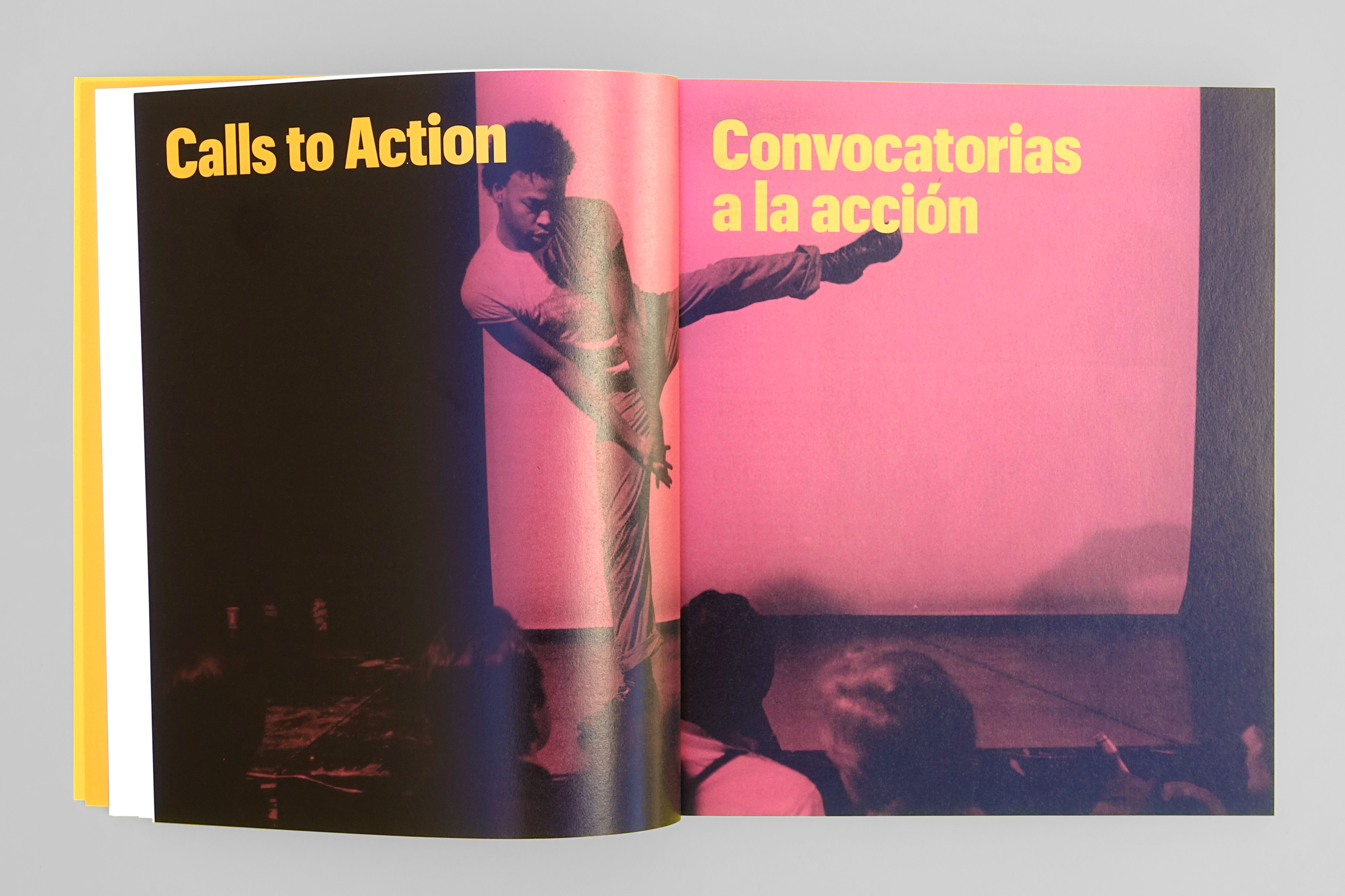 The bilingual catalogue has split text pages between English and Spanish translations, giving essays a mirroring-like quality. The book is divided into an accessible and identifiable framing system in which interviews are framed in gold and artists’ contributions in black. The cover also approaches this duality with an inversion of standard uncoated and coated paper that adds a softness to the uncoated front cover with an embossed bright yellow title.
