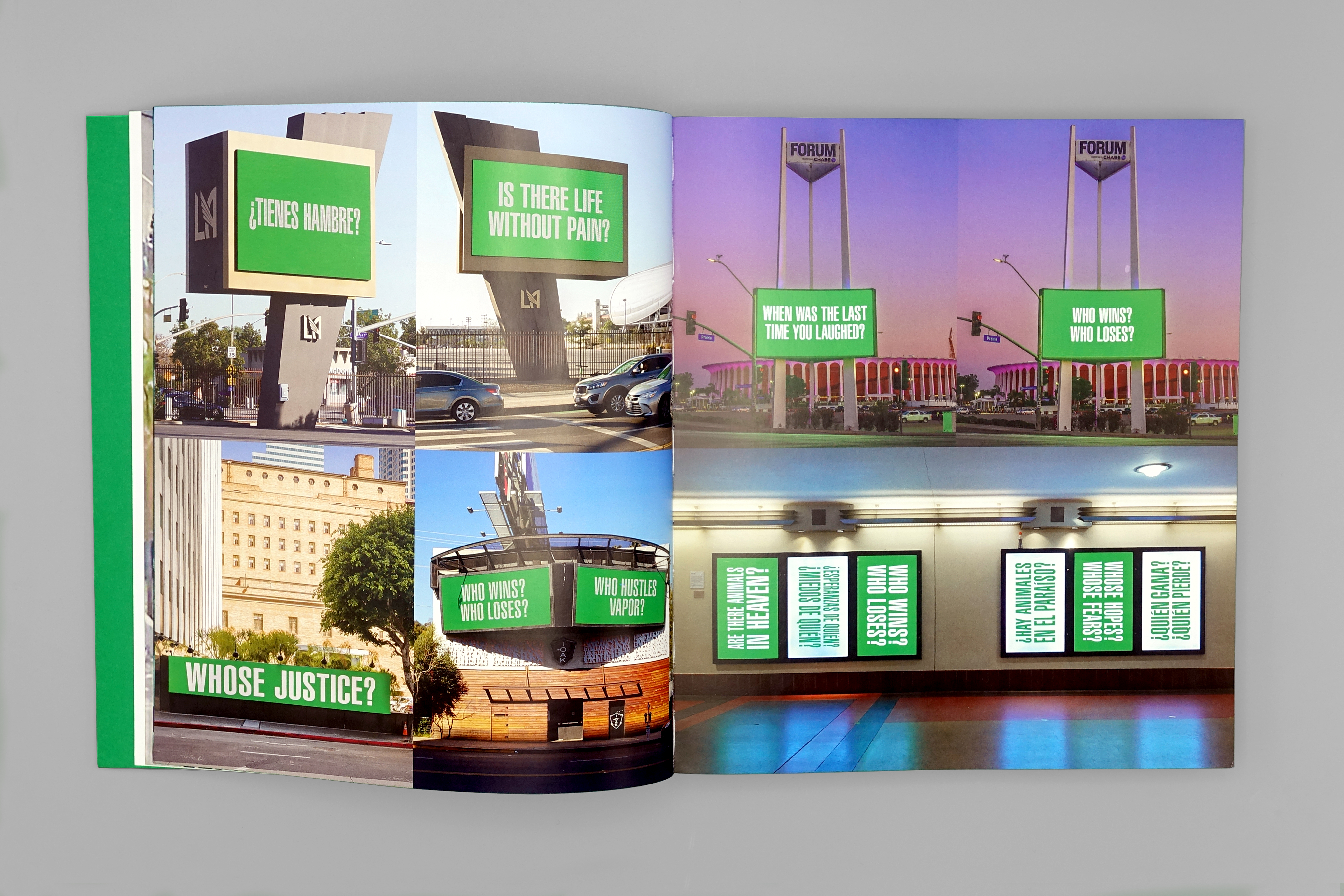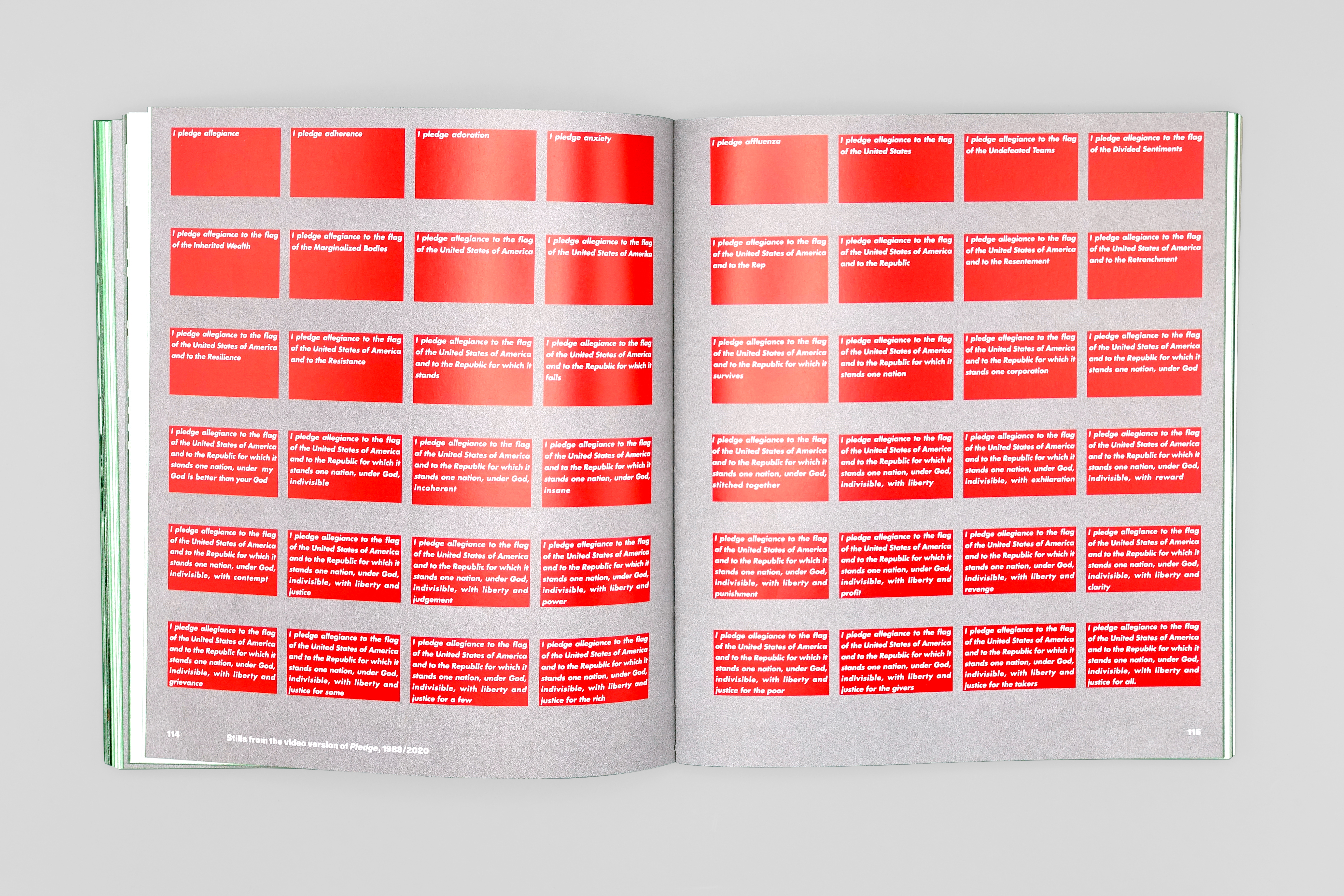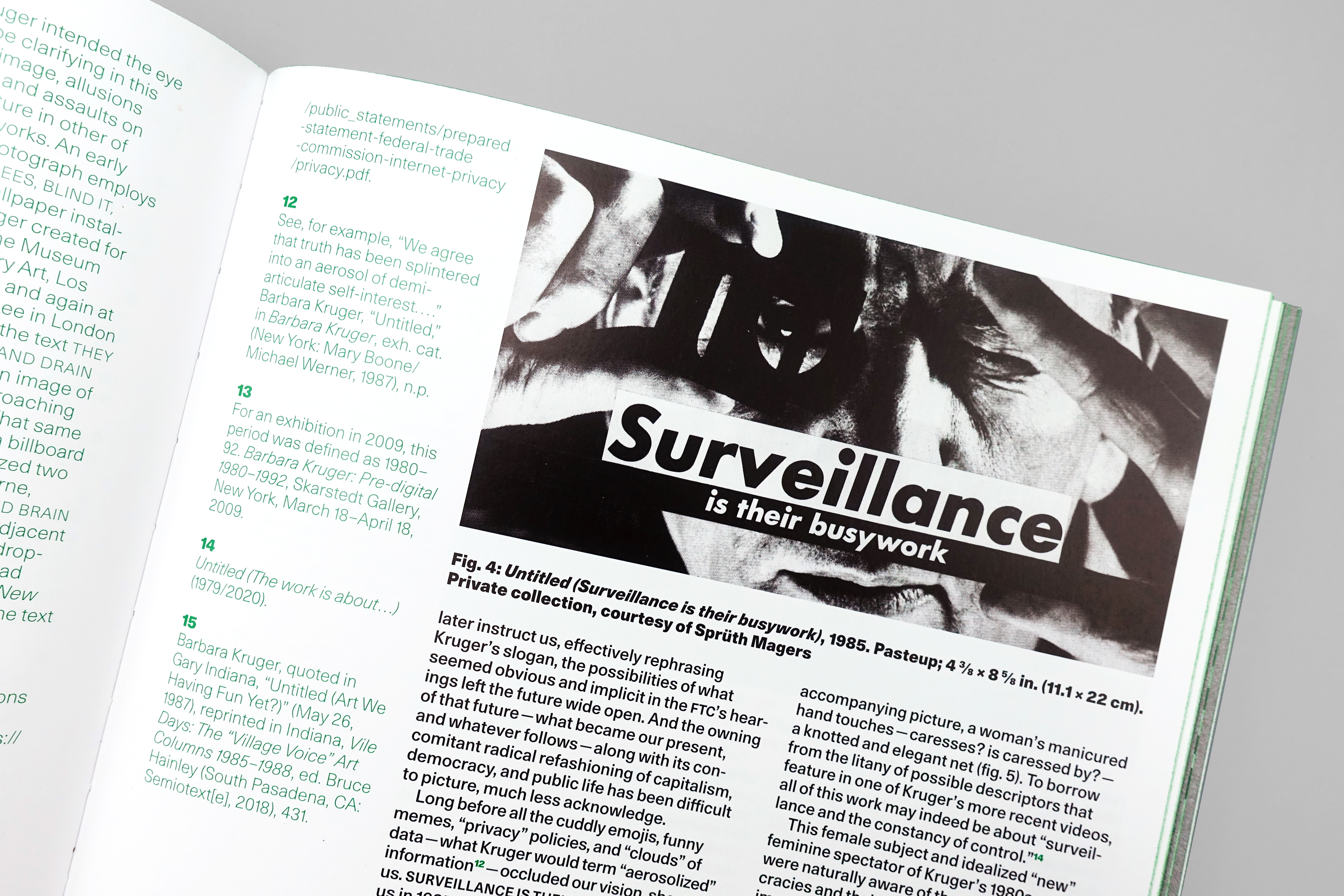 Thinking of You. I Mean Me. I Mean You. showcases Kruger’s site-specific works as reconceived for each venue, and includes a section of reprinted texts drawn from her teaching curriculum. Designed by IN-FO.CO in close communication with Kruger, the book’s flush-trimmed boards, green-tinted page edges, and bold typography extend the visceral impact of the work itself. Created in 2020 amidst a vast array of political and public health unknowns, the publication includes up-to-the-minute images of Kruger’s public work in the world alongside the year’s widespread protests, as well as renderings (designed by IN-FO.CO using Kruger’s vector art and venue snapshots) that show future museum installations, framing the book and work within and beyond institutional settings.