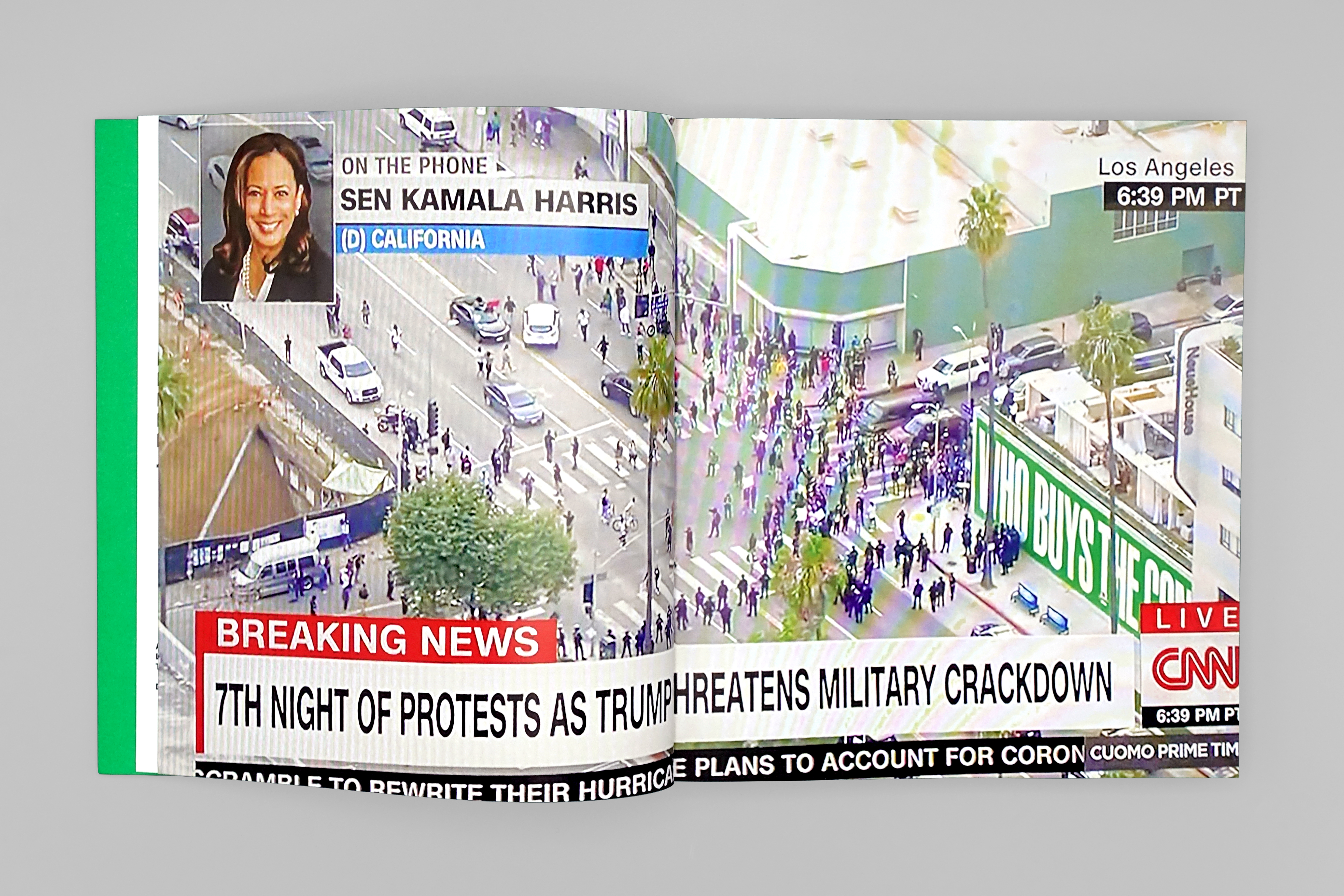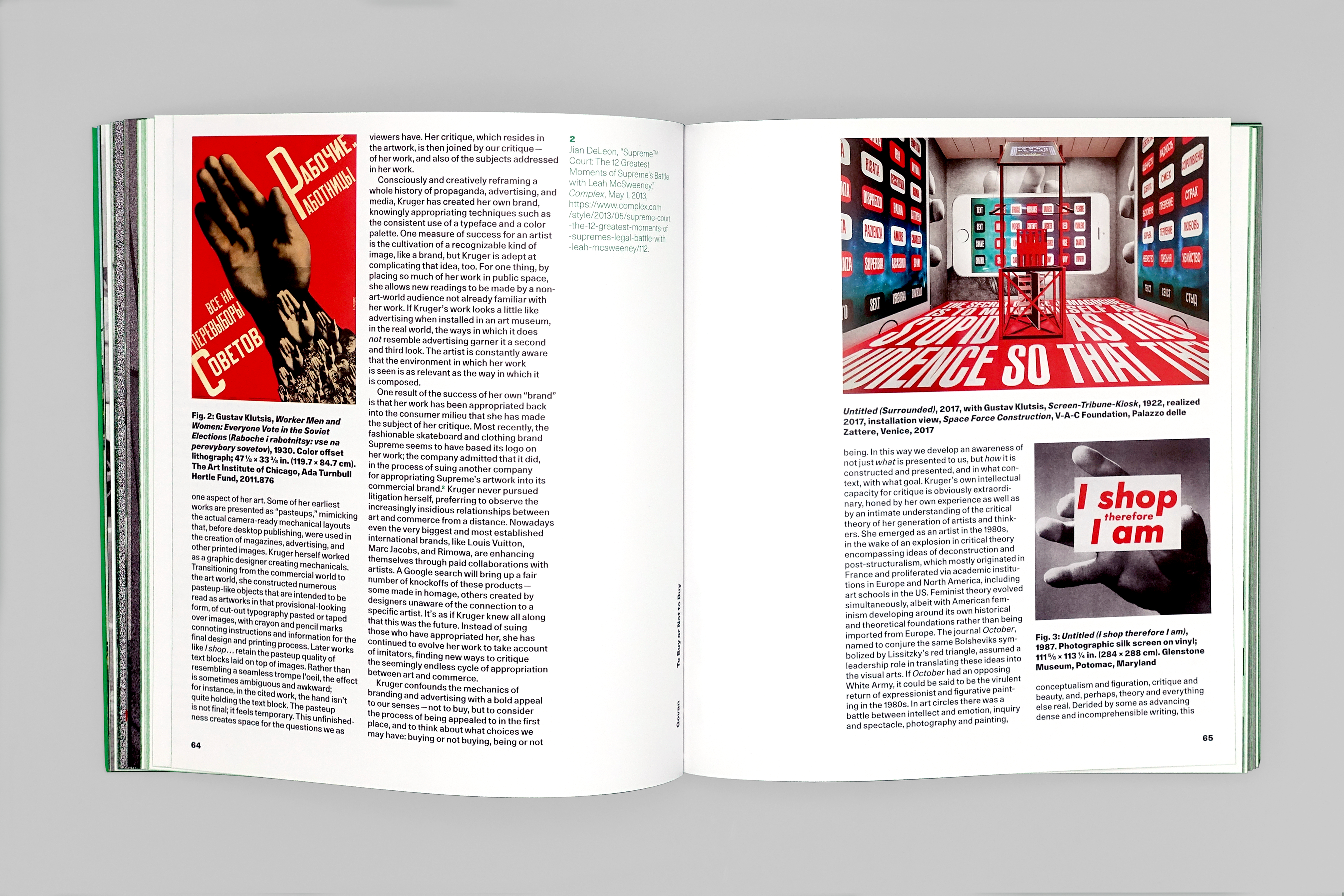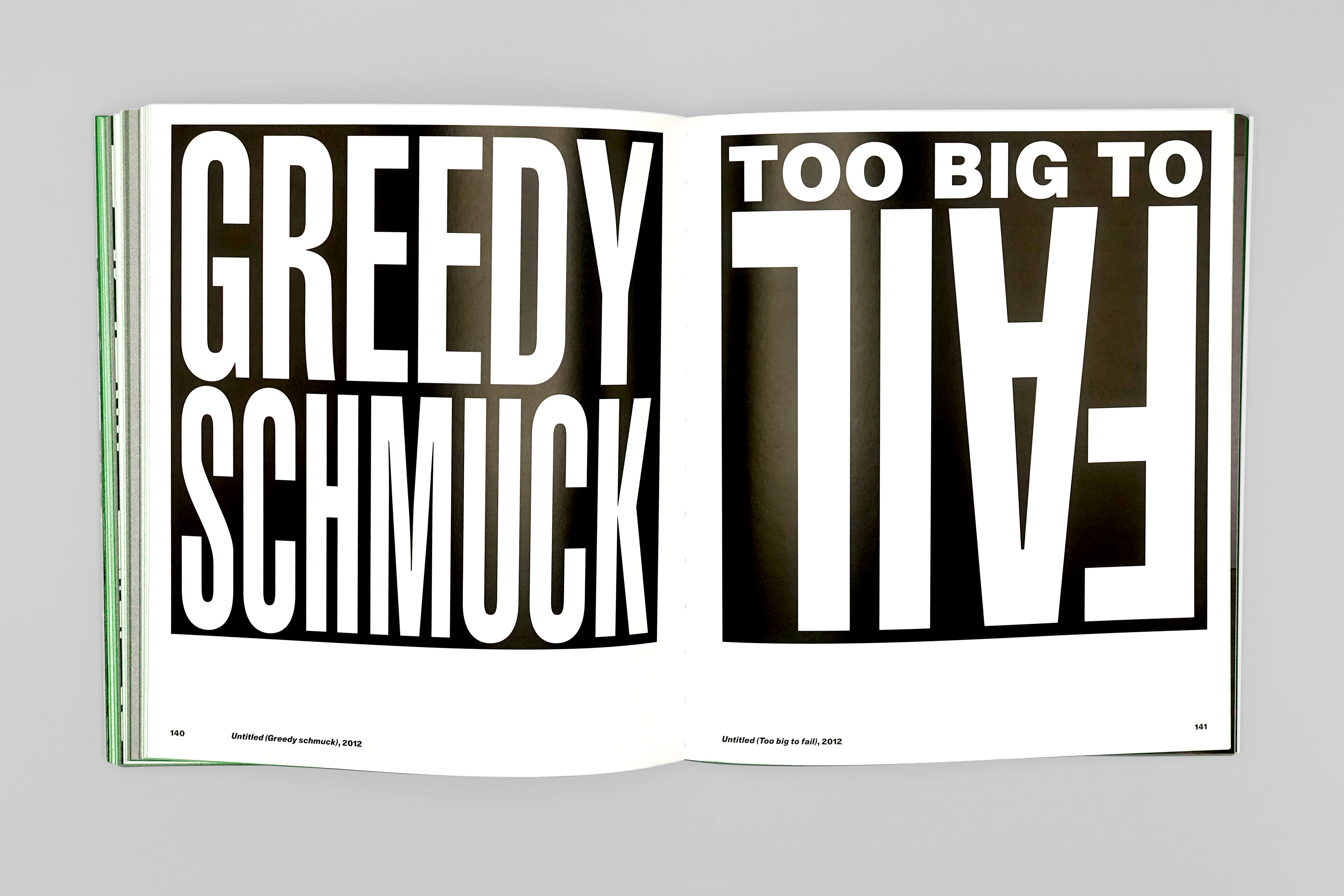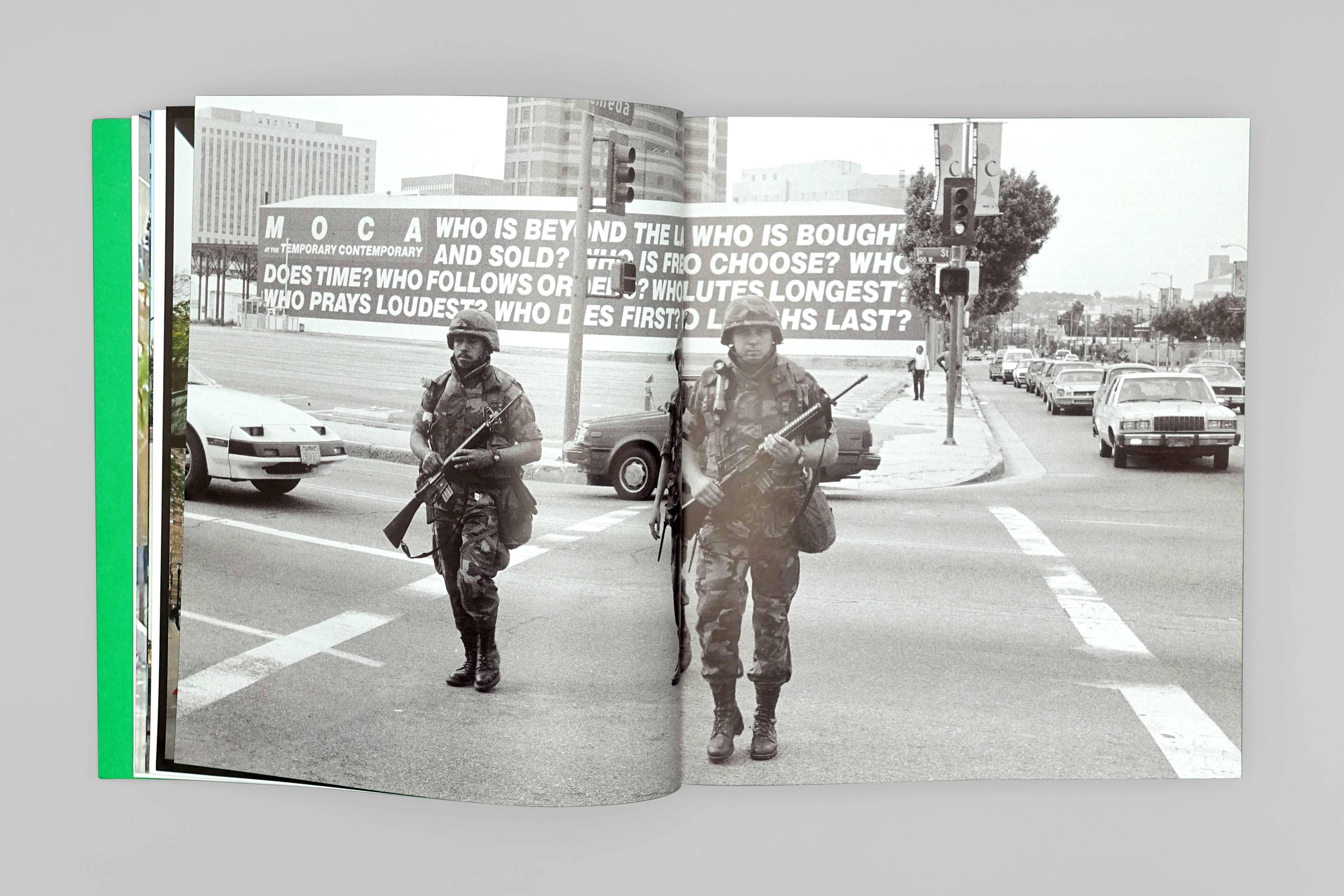 Thinking of You. I Mean Me. I Mean You. showcases Kruger’s site-specific works as reconceived for each venue, and includes a section of reprinted texts drawn from her teaching curriculum. Designed by IN-FO.CO in close communication with Kruger, the book’s flush-trimmed boards, green-tinted page edges, and bold typography extend the visceral impact of the work itself. Created in 2020 amidst a vast array of political and public health unknowns, the publication includes up-to-the-minute images of Kruger’s public work in the world alongside the year’s widespread protests, as well as renderings (designed by IN-FO.CO using Kruger’s vector art and venue snapshots) that show future museum installations, framing the book and work within and beyond institutional settings.