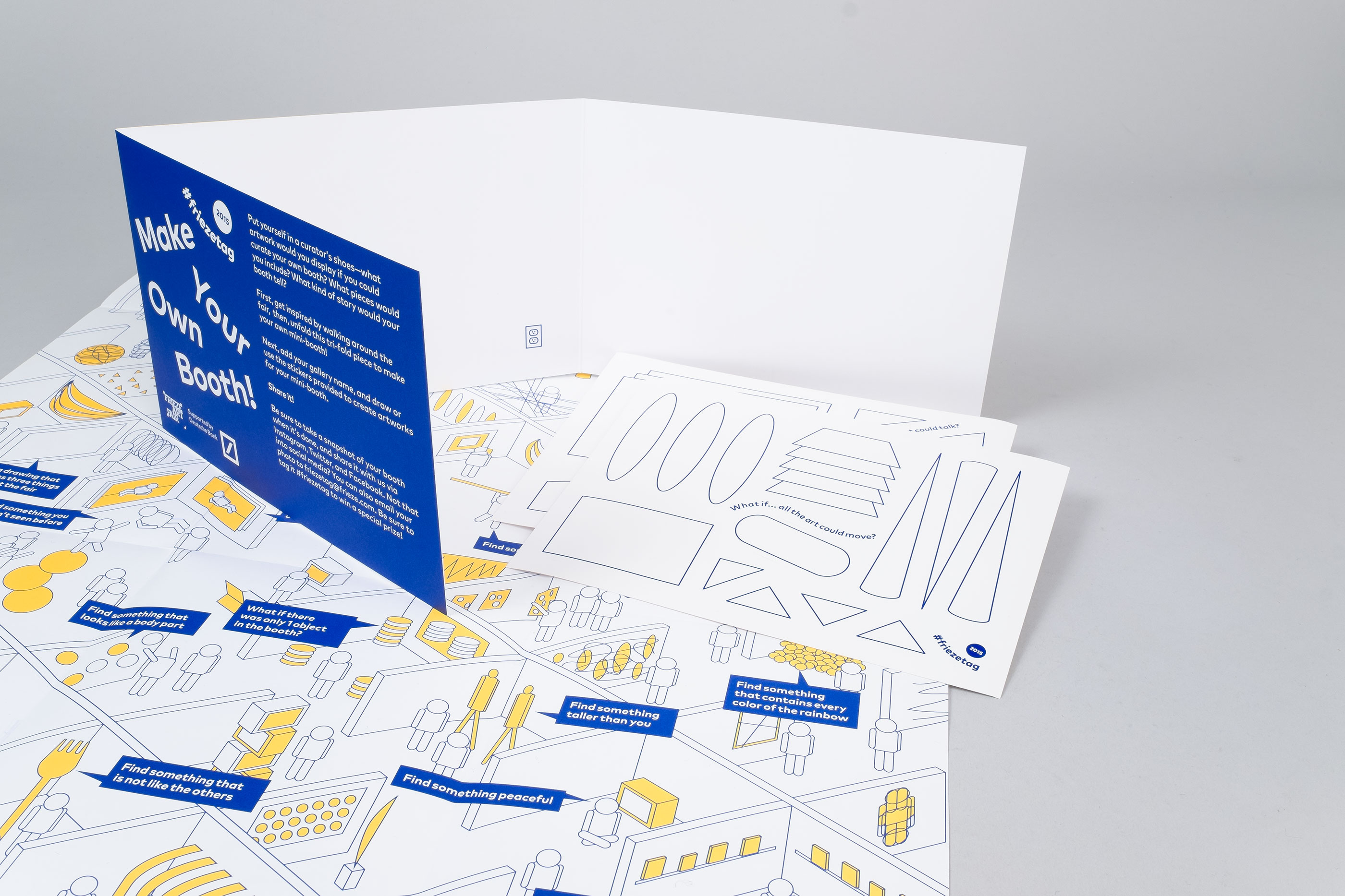 The 2016 guide functions as a notebook that can be used by young people during and after the art fair. It comprises fifteen exercises that encourage fair participants to engage their “seeing muscles” by prompting them to consider negative space, framing, reflection, and shadows, both at the fair and beyond. The Guide also includes a “viewfinder,” expressed as die-cut holes on the book’s front and back covers, suggestions for further reading; a map of other youth-friendly cultural institutions in New York; and coloring book pages with designs by artists Jonas Wood, Kenny Scharf, and Saya Woolfalk.