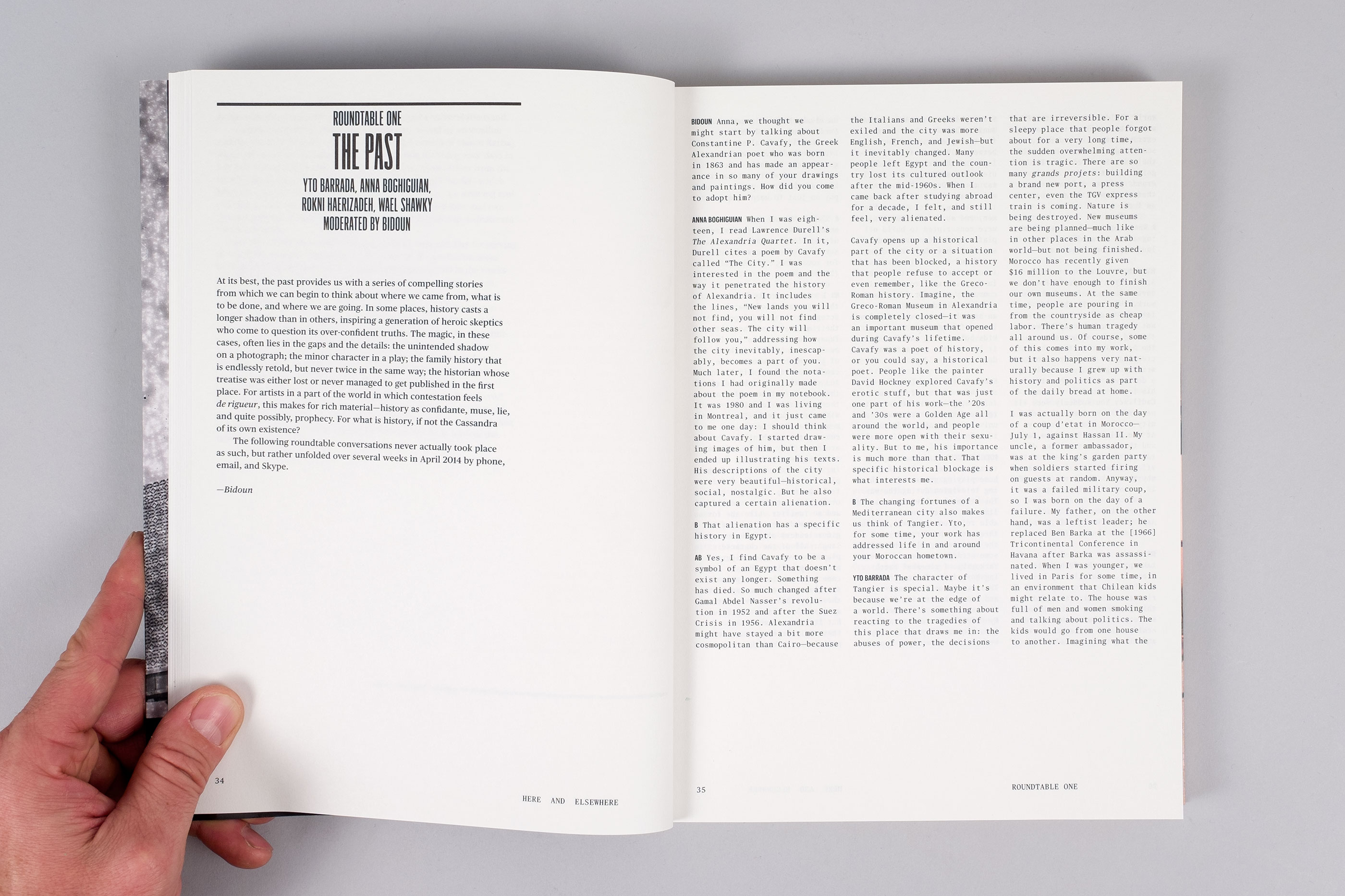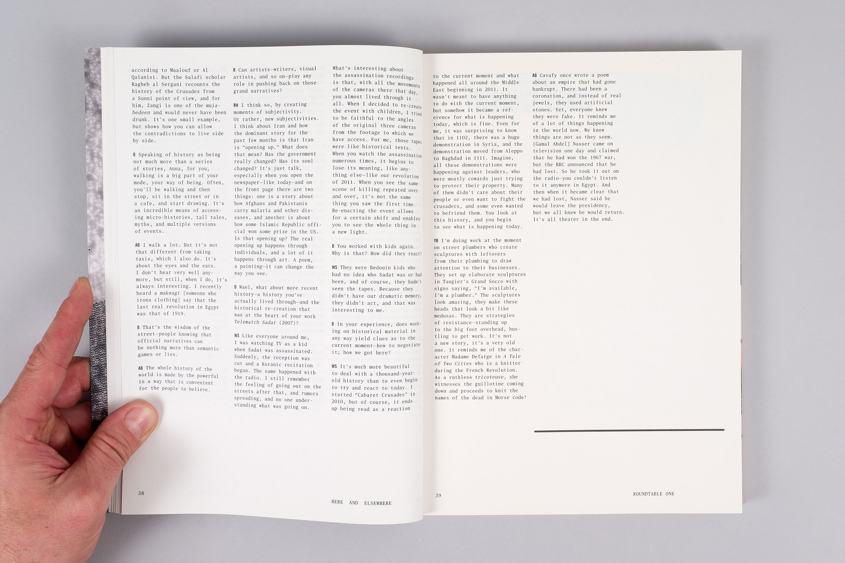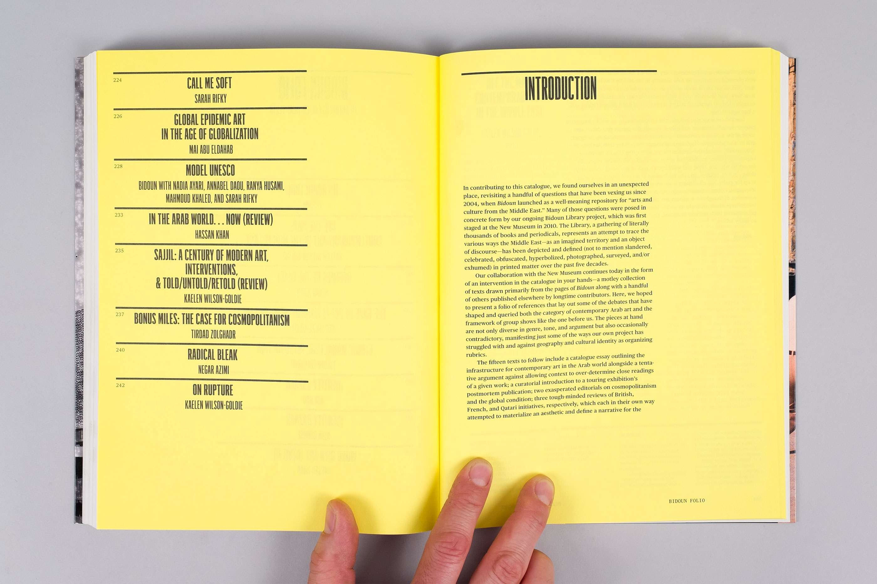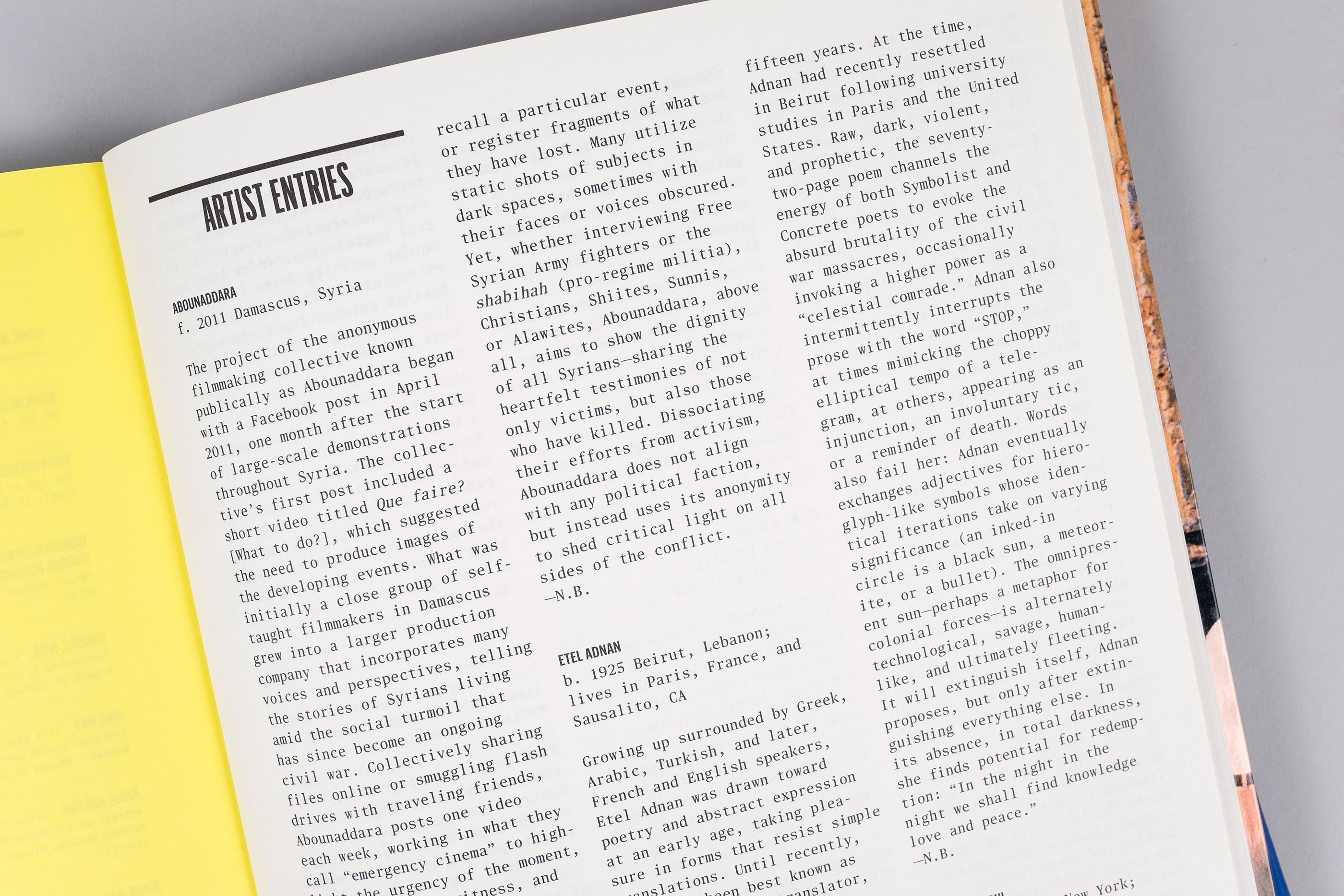 A major 2014 exhibition at the New Museum surveying contemporary art from the Arab world, Here and Elsewhere focused on the role of the artist in the face of the region’s social and political upheaval. The design conveys this sense of urgency and directness through bold typography and dynamic layouts. In addition to image spreads, the catalogue features a special section edited by Arab-world arts publication Bidoun, providing contextualizing resources for the exhibited work, including reference texts and transcripts of roundtable discussions.