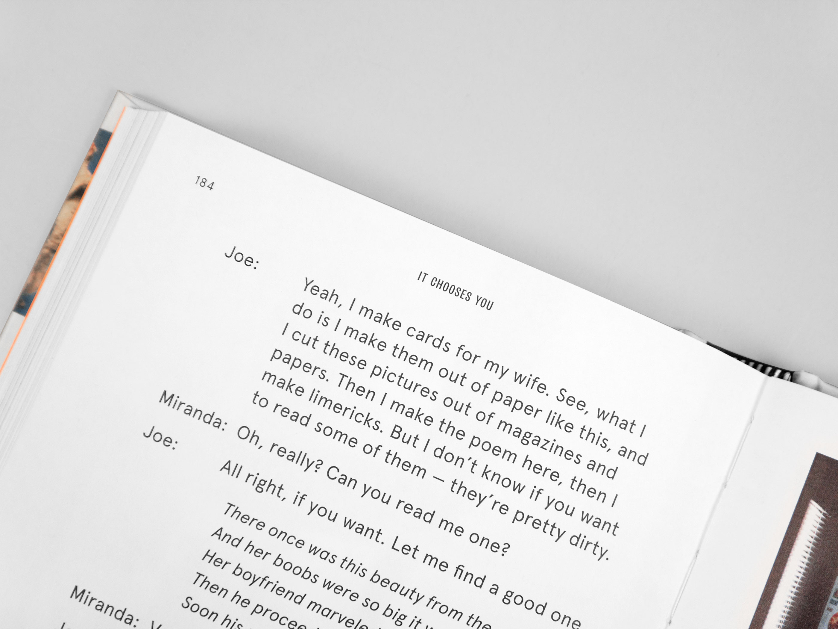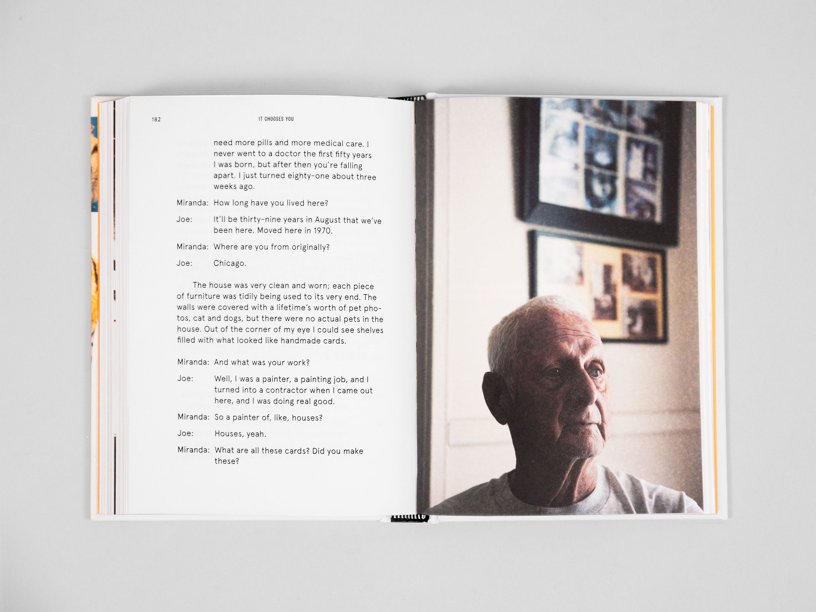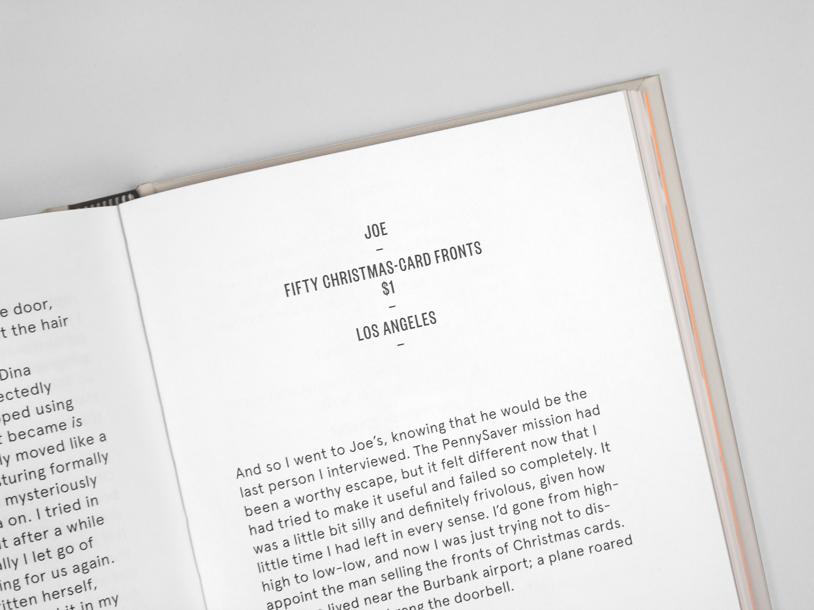 It Chooses You, published by McSweeney’s, is an account of how Miranda July spent her time while directly and indirectly working on the screenplay for her second feature film, The Future. Teaming up with photographer Brigitte Sire, July meets and interviews a range of Los Angeles residents found via sellers’ ads in the classifieds booklet PennySaver. Adam Michaels designed the book’s cover and interior template.