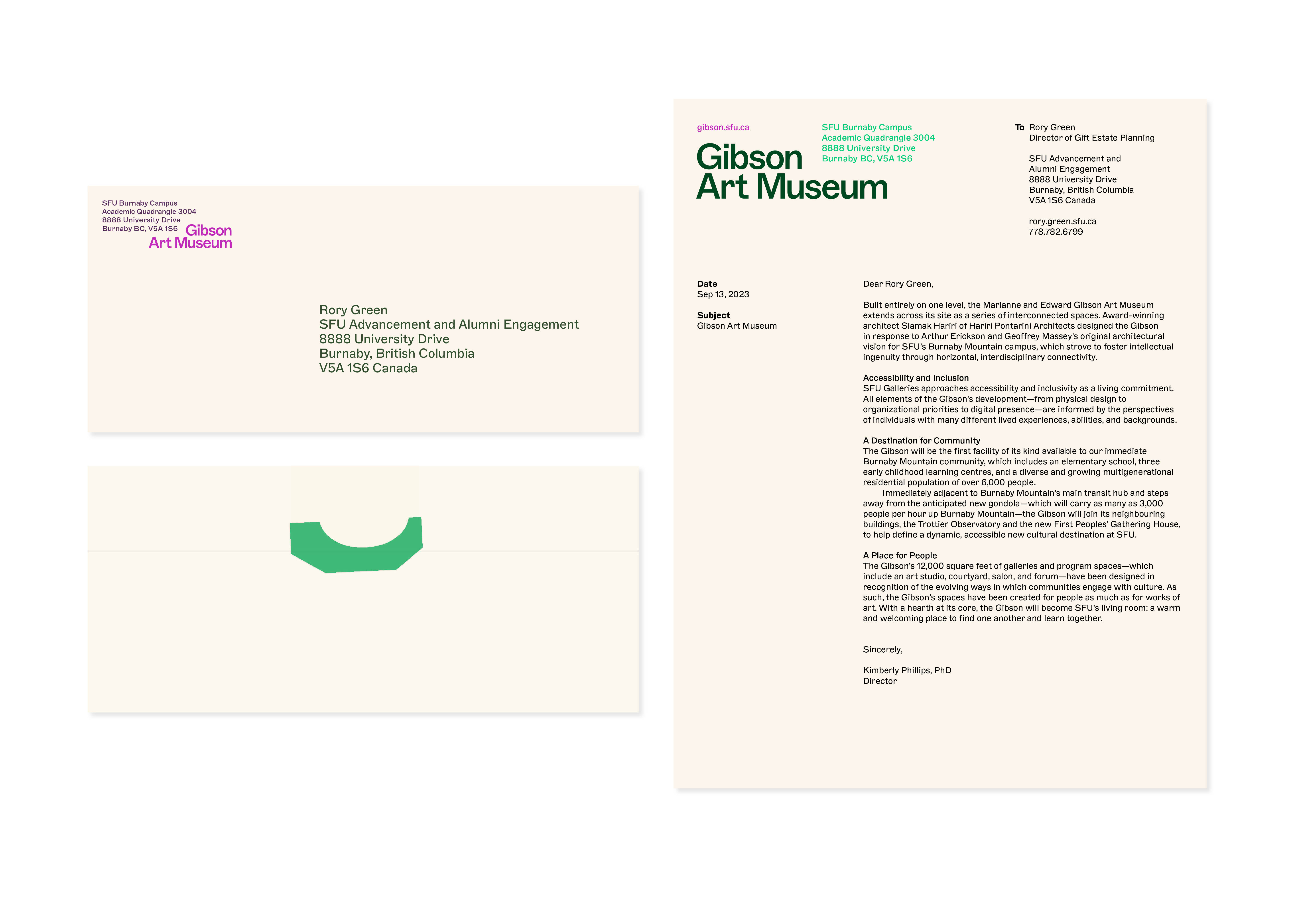The Marianne and Edward Gibson Art Museum is a new cultural space dedicated to inclusive learning and critical inquiry through the visual arts at Simon Fraser University. The Gibson Art Museum wordmark is typeset in Marfa by Dinamo, and set in a bottom-aligned configuration, providing a rooted stability, while texts, images, and other messaging are dynamically placed above the mark in a gesture of support and embrace. A secondary mark inspired by the building’s plan forms a bowl, an outstretched hand, or a water droplet, invites further interpretation. The overall inversion of typical institutional alignments—putting collaborators, images, and other messaging first—embodies the concept of making space for ideas, and holds space for collaboration and partnership above all.