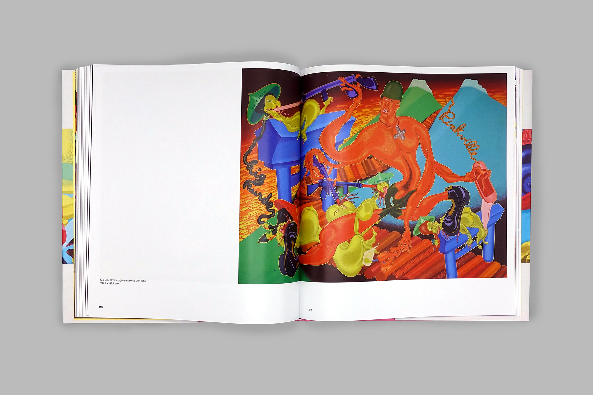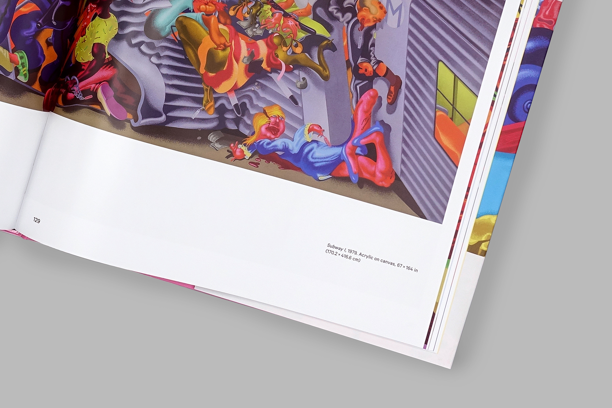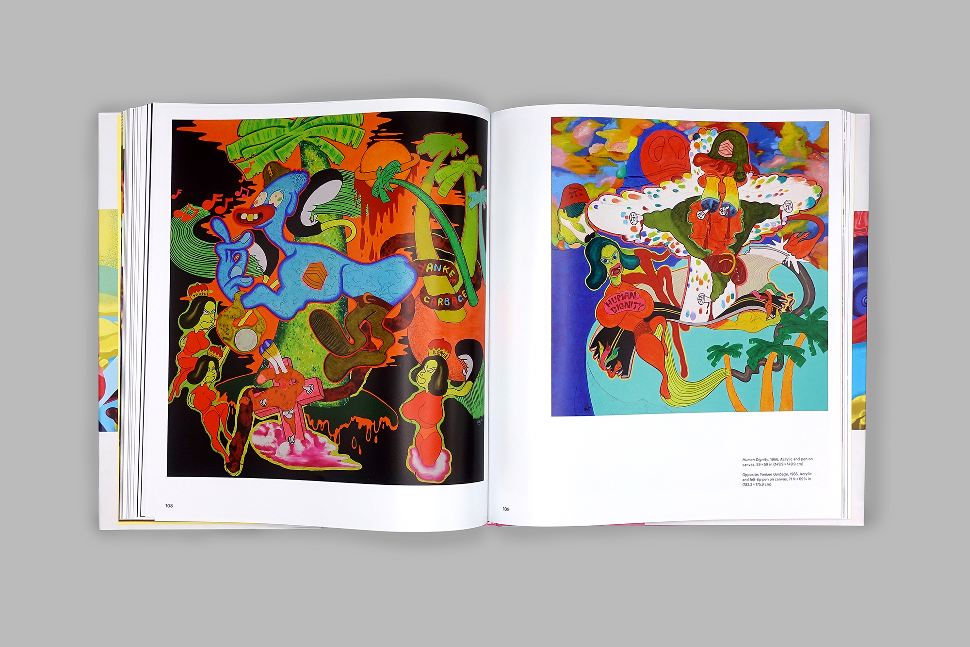 Peter Saul: Crime and Punishment is a comprehensive monograph accompanying the artist’s first New York museum survey at the New Museum. The large format catalog is housed in a jacket that folds out to poster scale. Designed by IN-FO.CO, published by Phaidon and the New Museum, and edited by Massimiliano Gioni and Gary Carrion-Murayari, the volume also includes new written contributions from Robert Cozzolino, Matthew Israel, Dan Nadel, Nicole Rudick, and John C. Welchman, and interviews with Peter Saul and Thomas Crow.