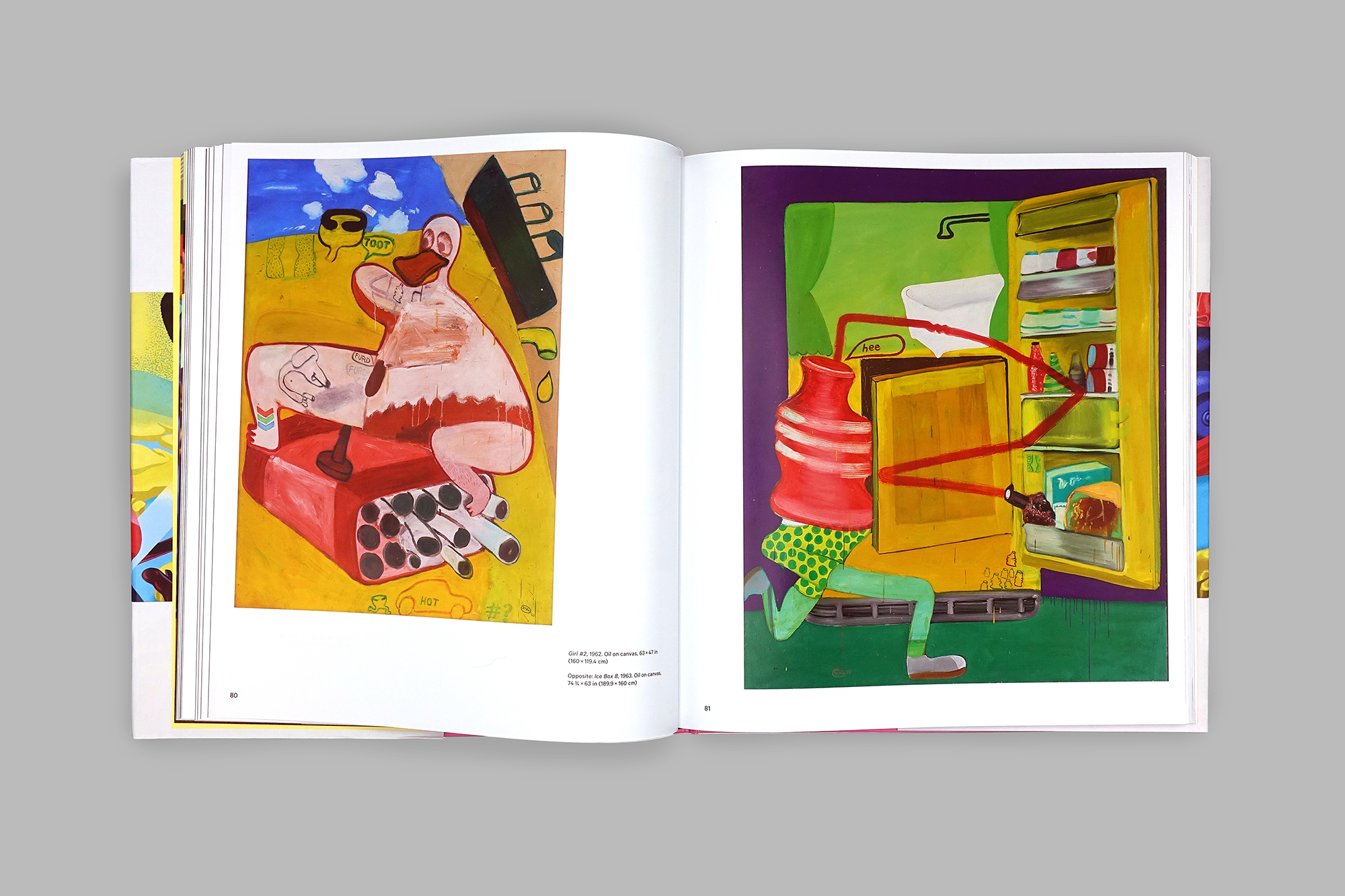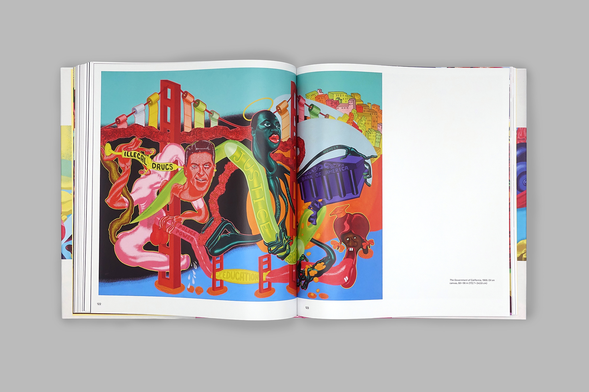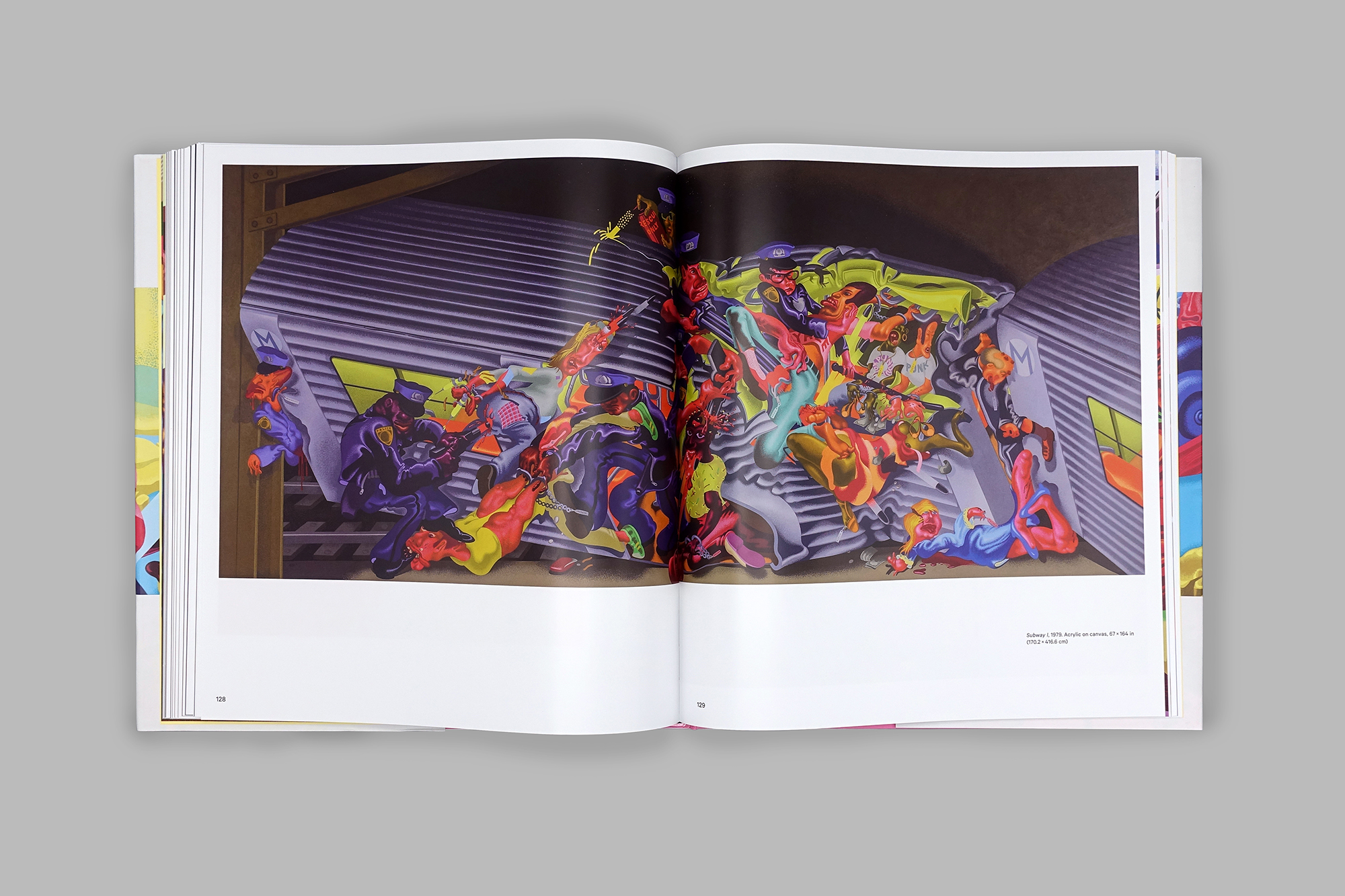 Peter Saul: Crime and Punishment is a comprehensive monograph accompanying the artist’s first New York museum survey at the New Museum. The large format catalog is housed in a jacket that folds out to poster scale. Designed by IN-FO.CO, published by Phaidon and the New Museum, and edited by Massimiliano Gioni and Gary Carrion-Murayari, the volume also includes new written contributions from Robert Cozzolino, Matthew Israel, Dan Nadel, Nicole Rudick, and John C. Welchman, and interviews with Peter Saul and Thomas Crow.
