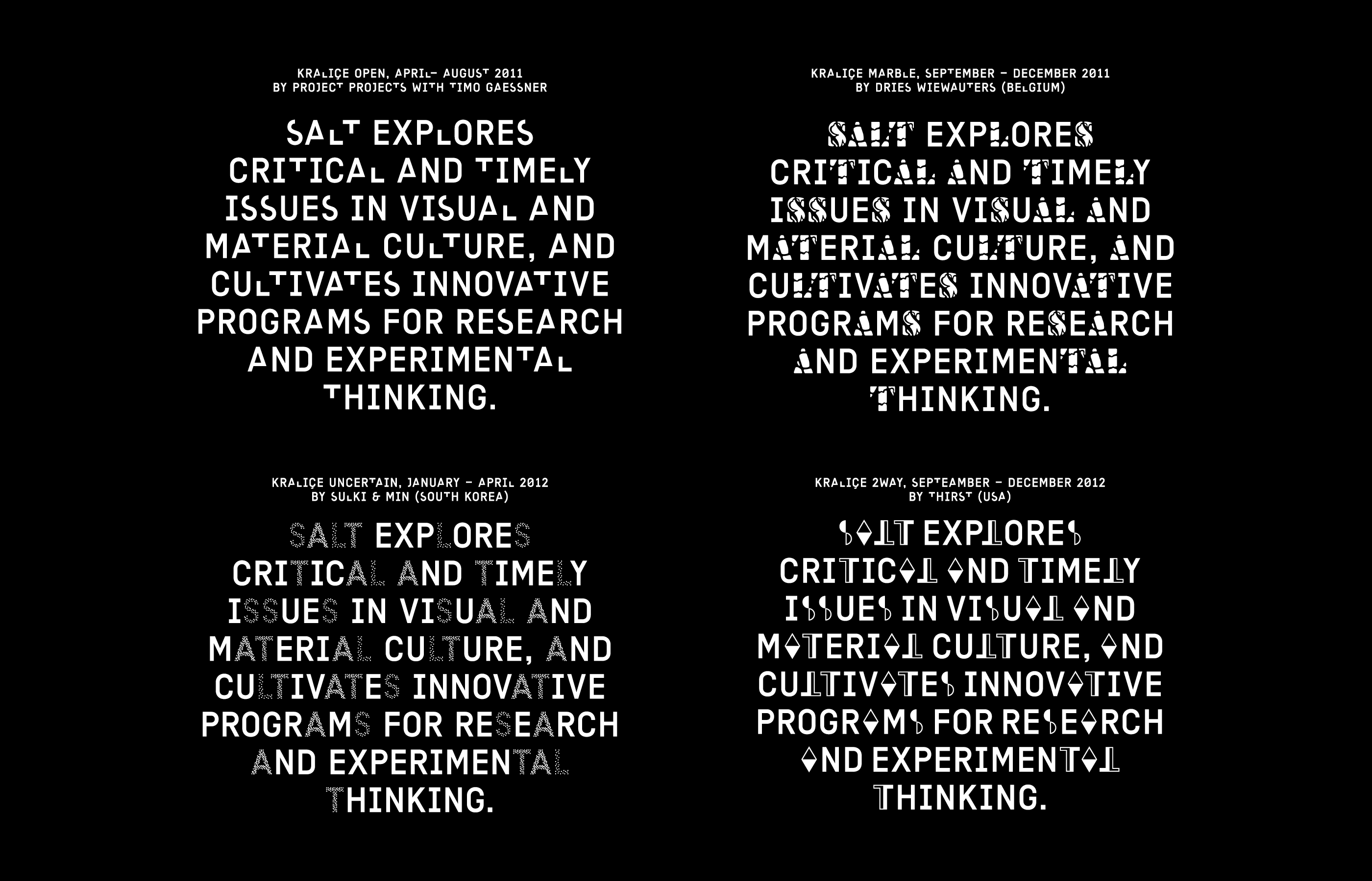 Finally, an ongoing curatorial program initiated by Project Projects takes the identity system itself as a distributed exhibition space. Every four months, a new designer will be invited to reimagine the letters S-A-L-T and thereby modulate the identity’s look across all media. The first designer selected was Dries Wiewauters, followed by Thirst, ECAL/Anna Bitzer, and Abäke among others. In this way the typeface may come to find usages and audiences beyond its original context for SALT.