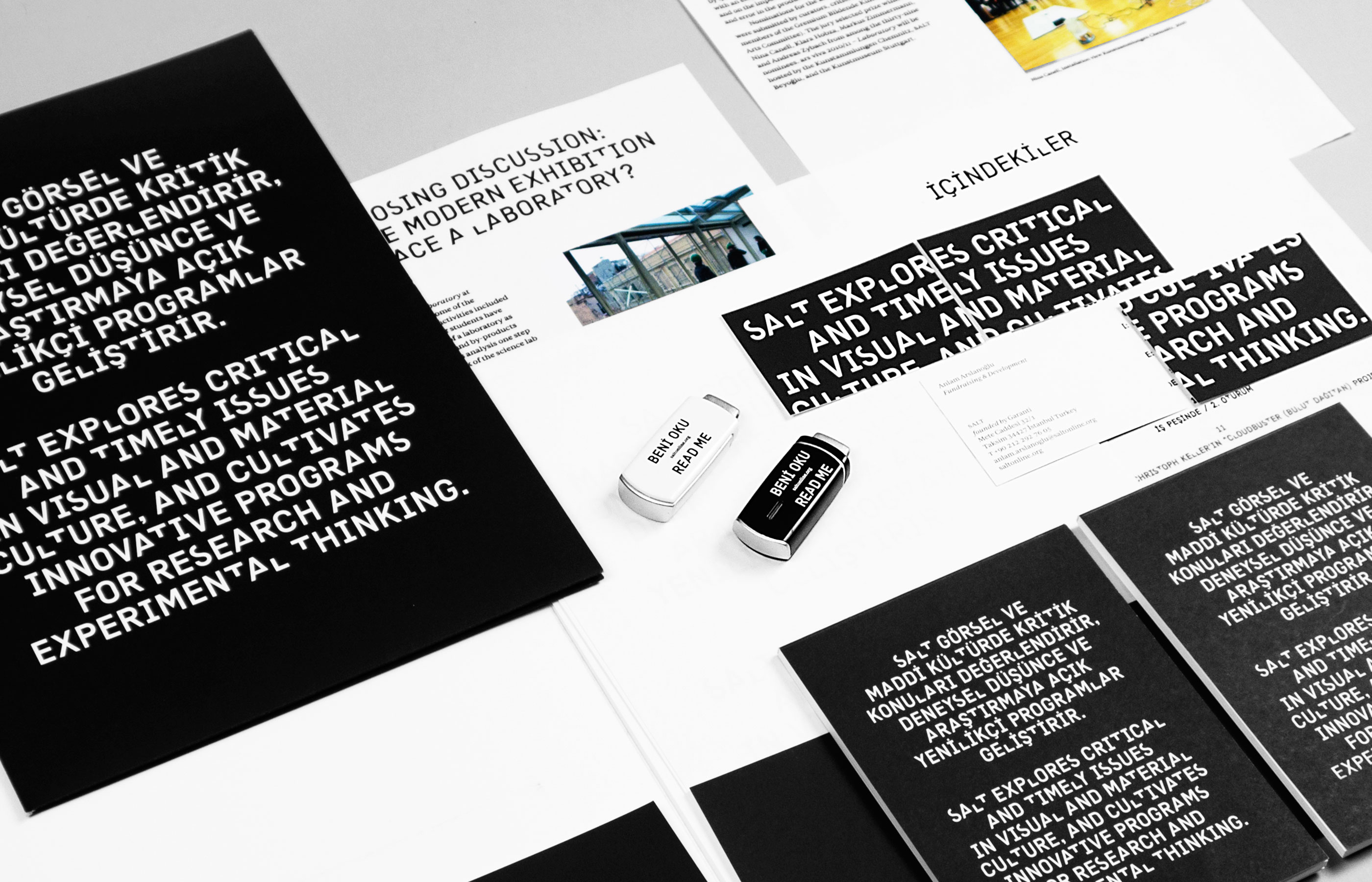 The institution’s name has a unique position within the identity system. The letters S-A-L-T are not represented as a formal logo mark; instead, they are embedded within a custom-designed typeface, Kraliçe, which was created by type designer Timo Gaessner for Project Projects. With this typeface, the institution strategically disperses its name within the language it uses everyday.