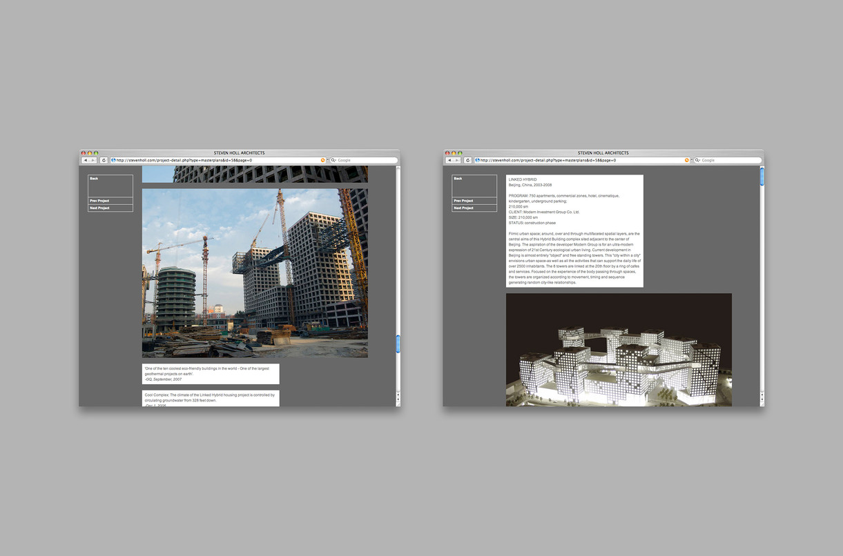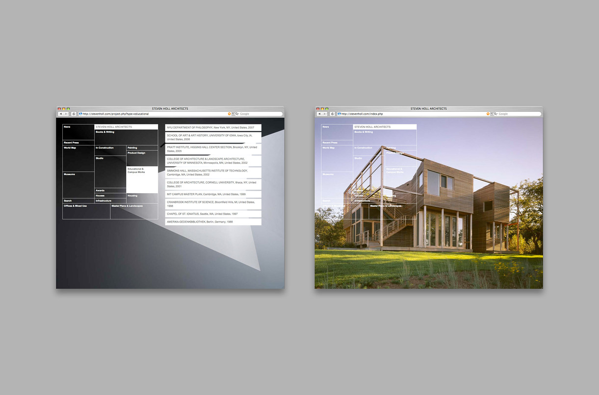 The graphic identity and website for Steven Holl Architects features detailed typography and rich photography which draws focus to the phenomenological experience of Holl’s architecture.