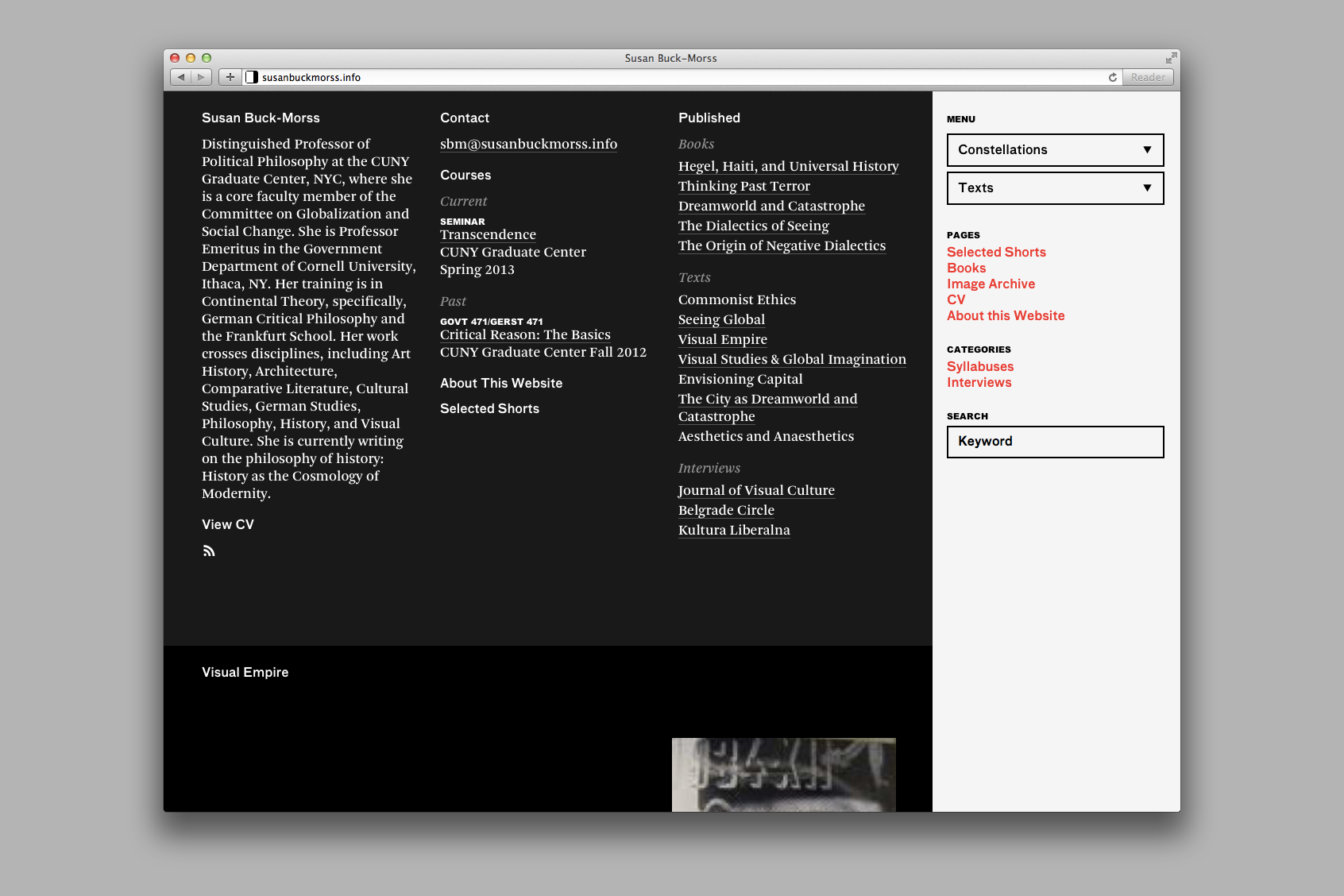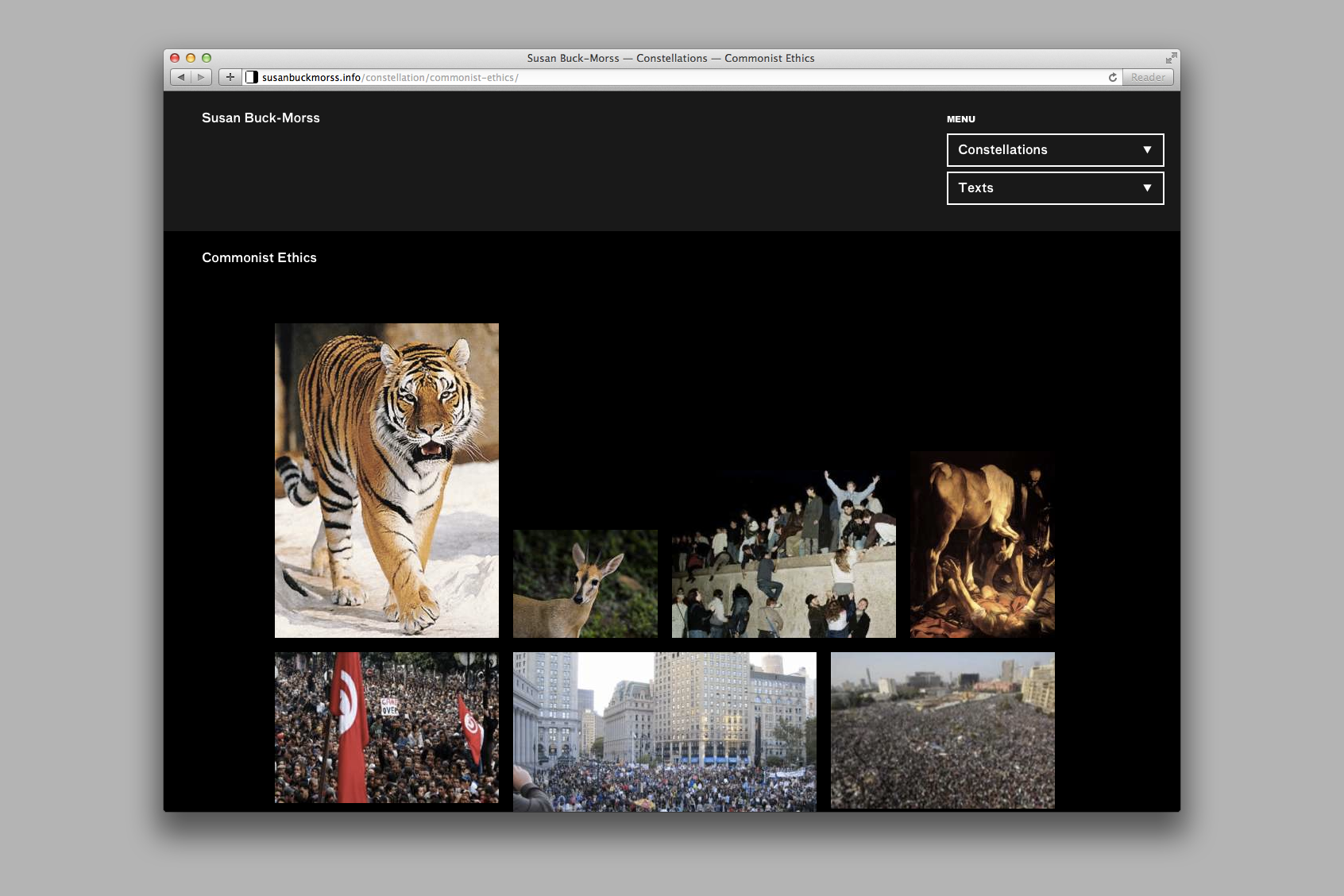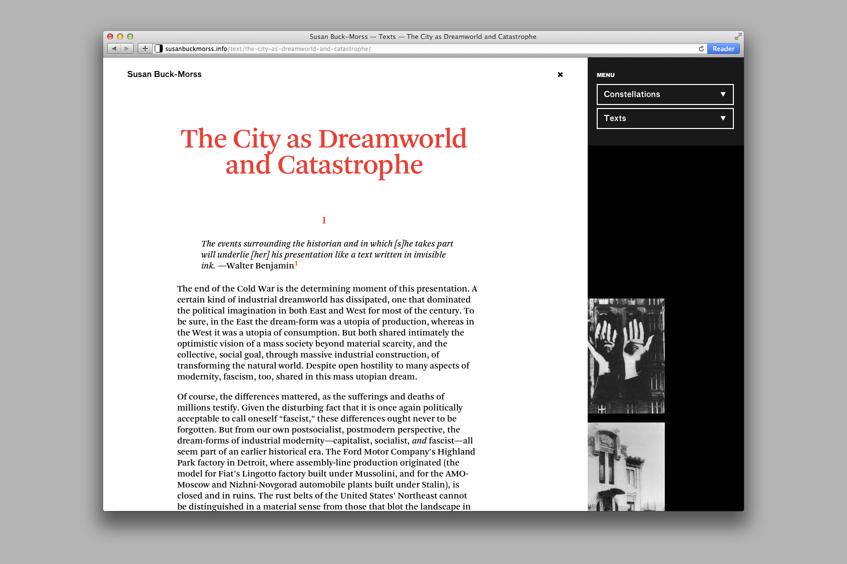 The work of professor and political philosopher Susan Buck-Morss employs Walter Benjamin’s broad theory of the image as a methodology of research and exploration. Taking these ideas as guiding principles, the website serves as a distinct archive and platform for the development of her ongoing work.