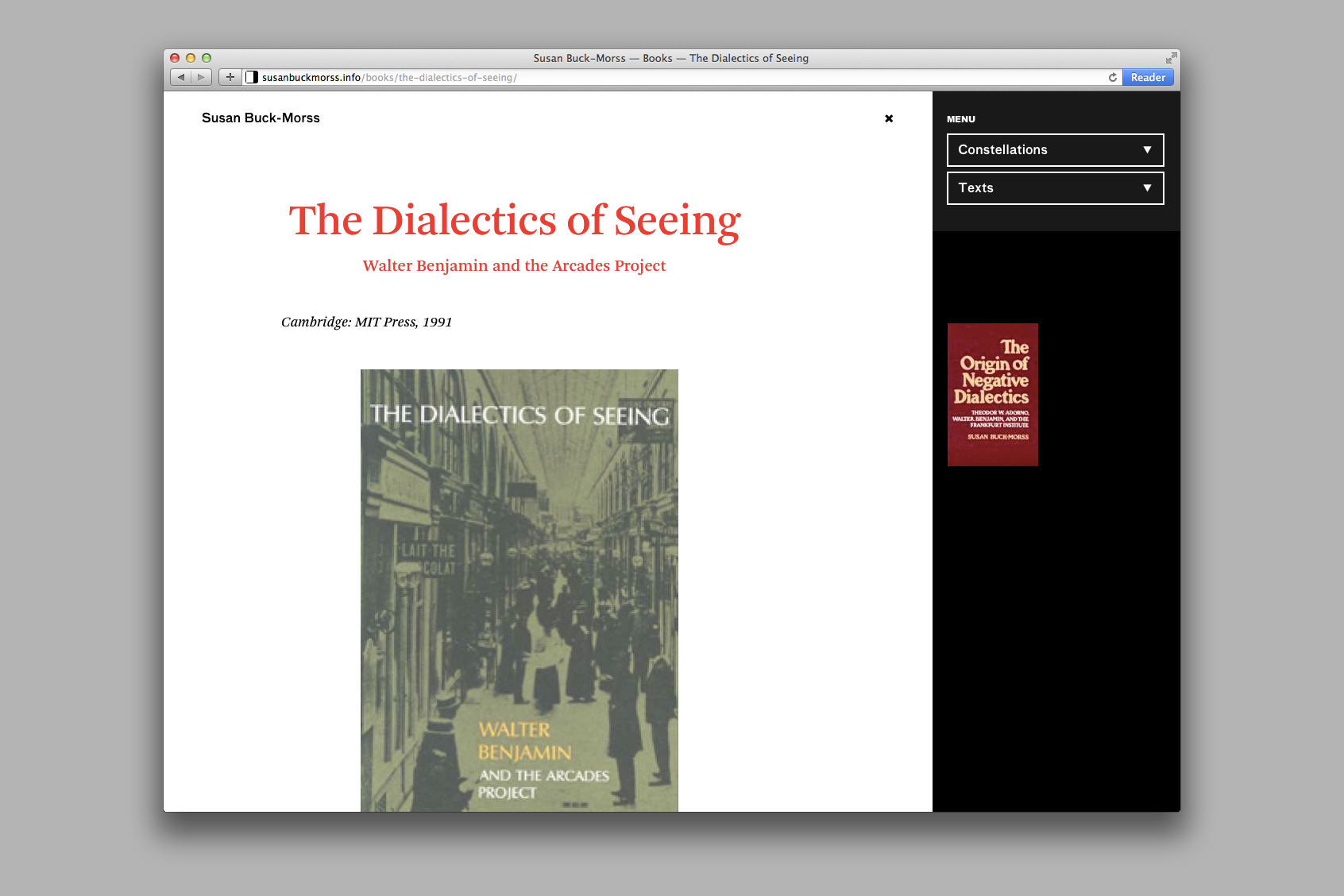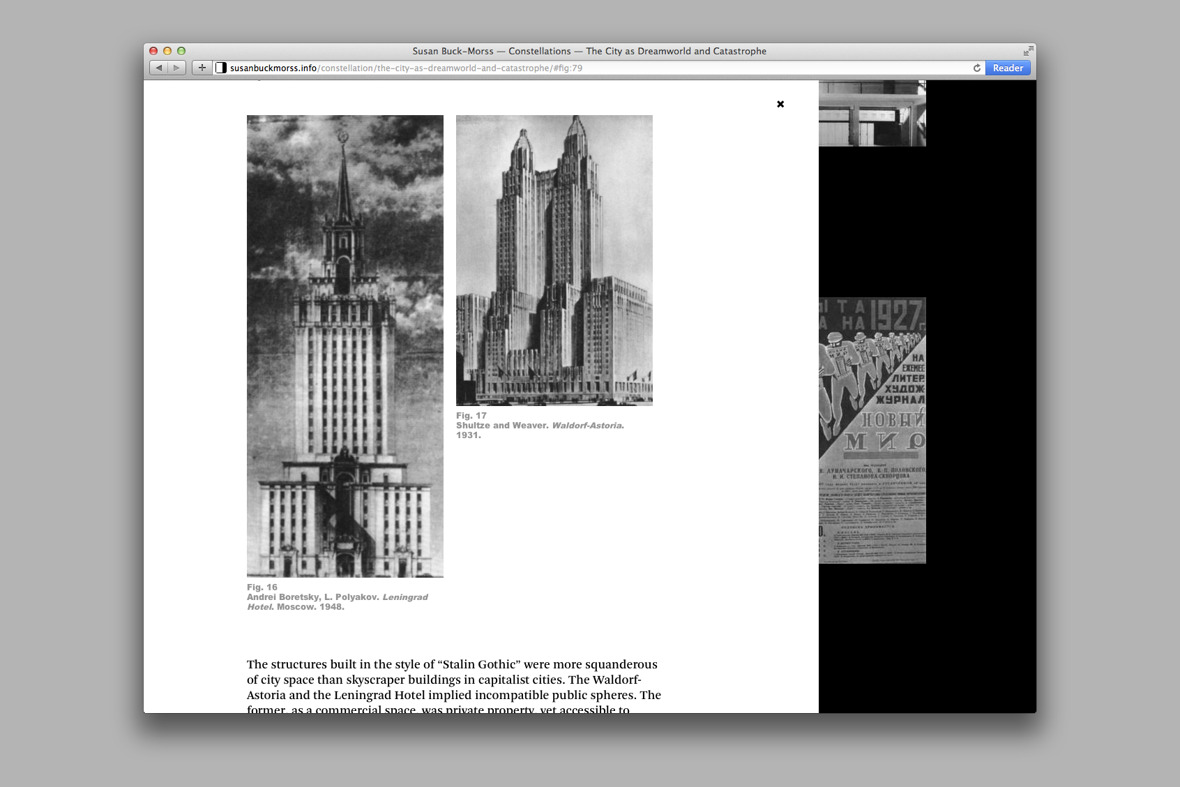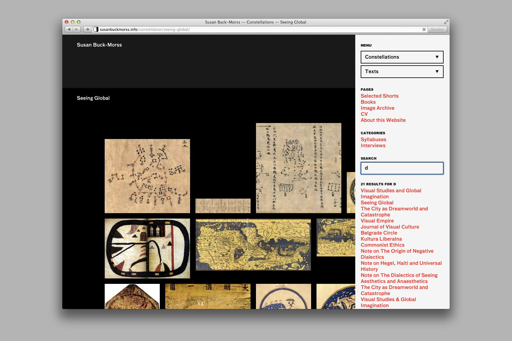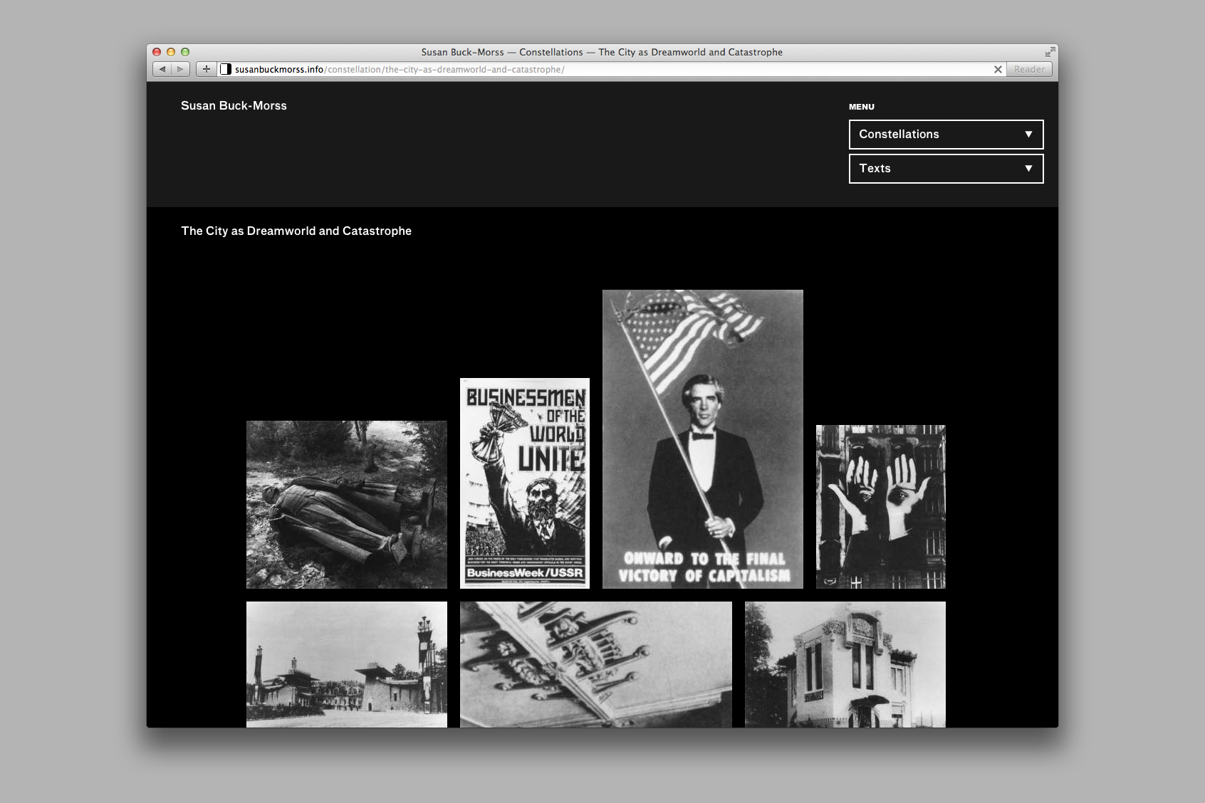 Two main axes comprise the backbone of the site. Buck-Morss’ constellations of selected images frame a spatial and associative navigation, while her texts follow a more traditional, linear structure. These two axes are then hyperlinked: clicking an image within a constellation scrolls the page to its position within the corresponding text, and closing a text panel brings the corresponding constellation back to the fore.