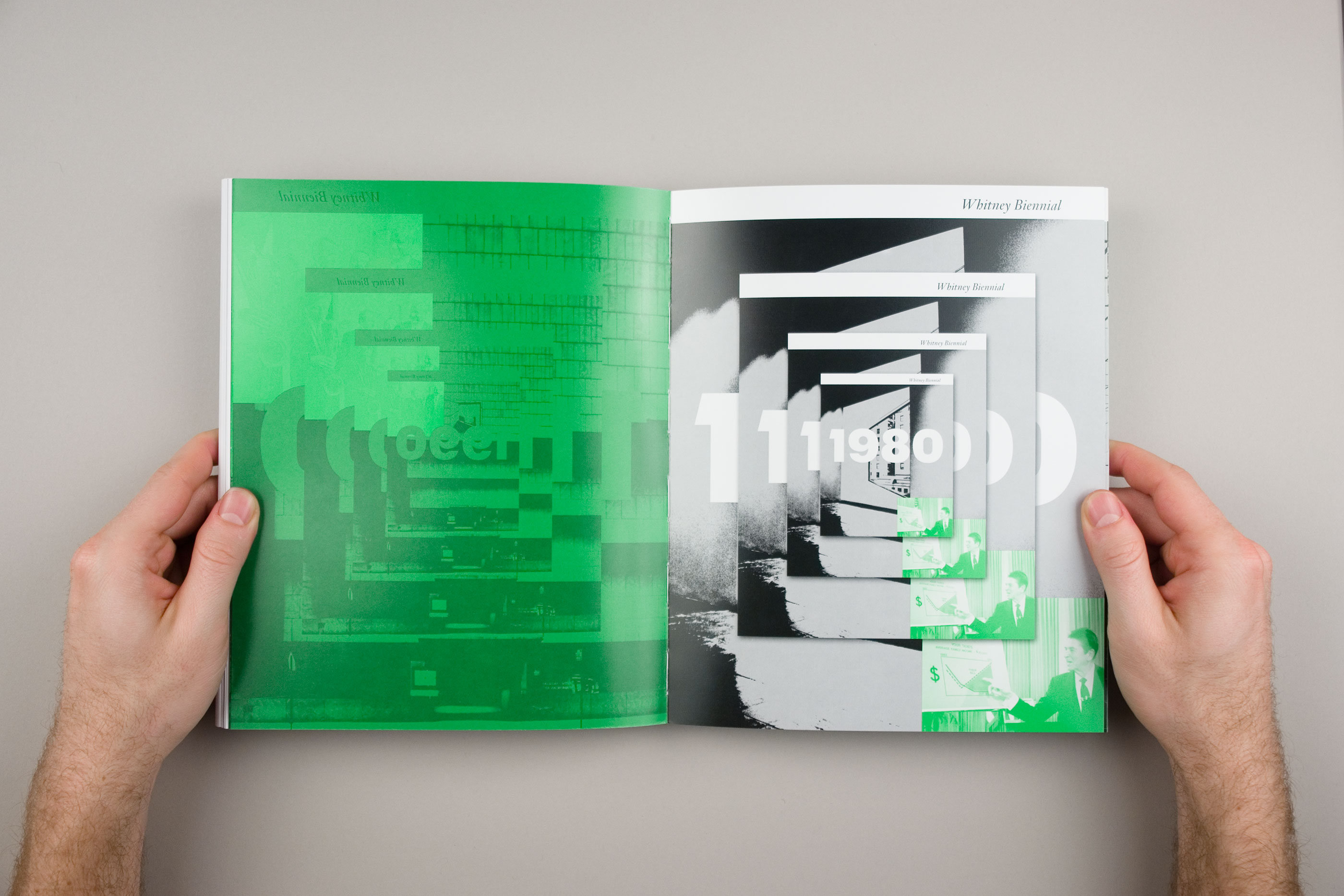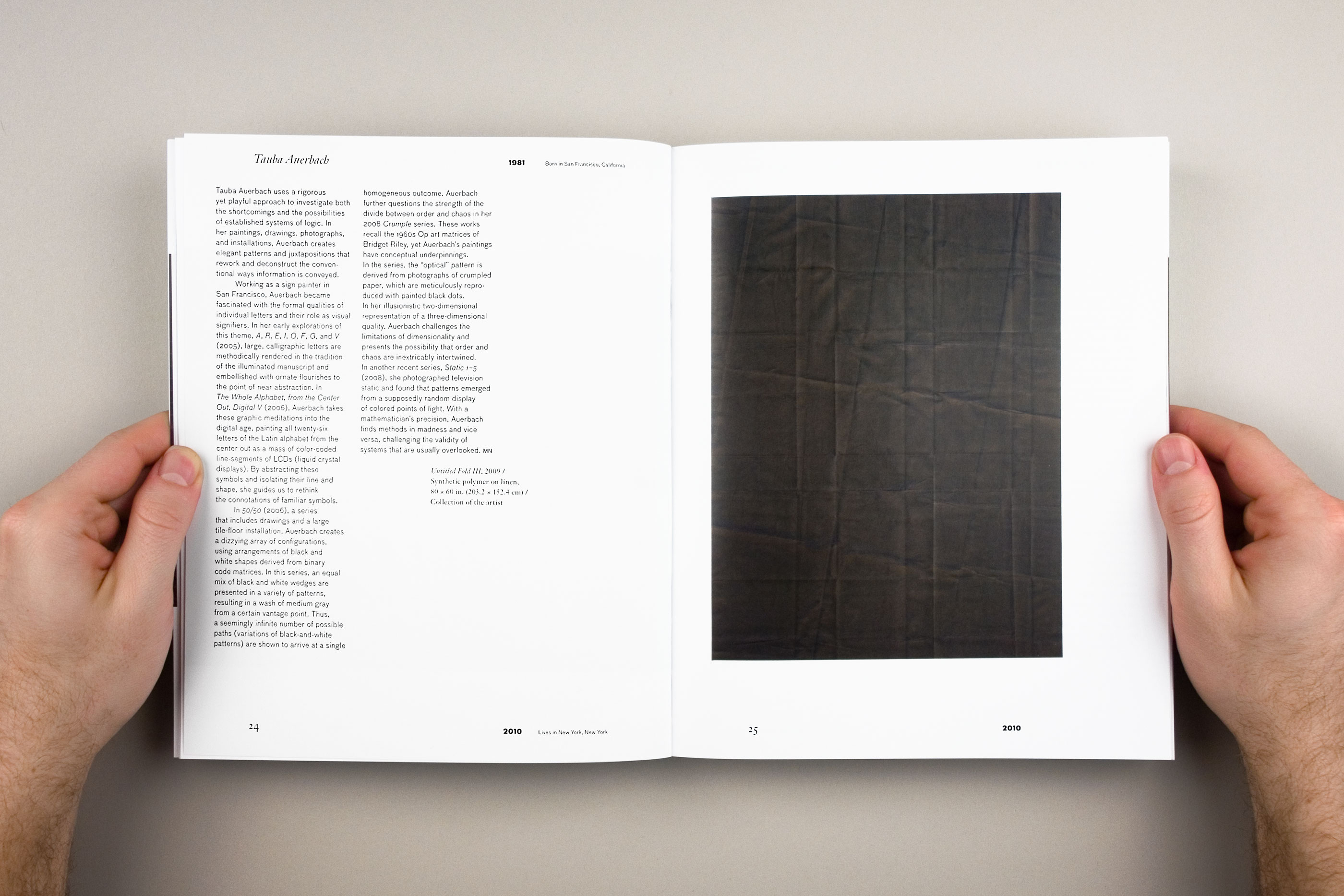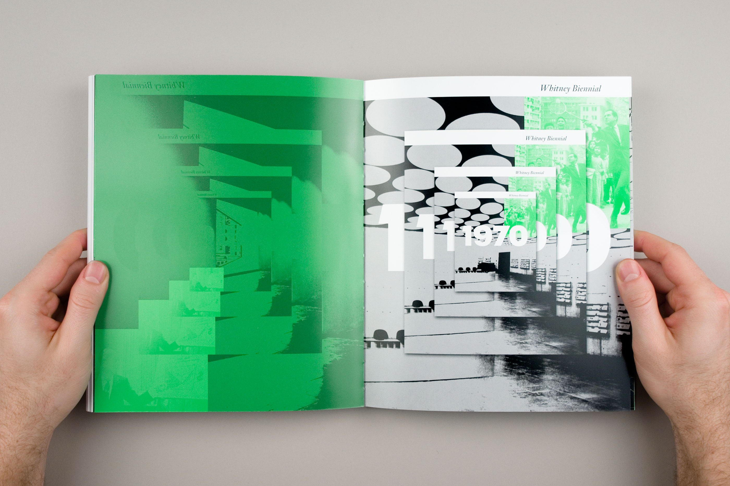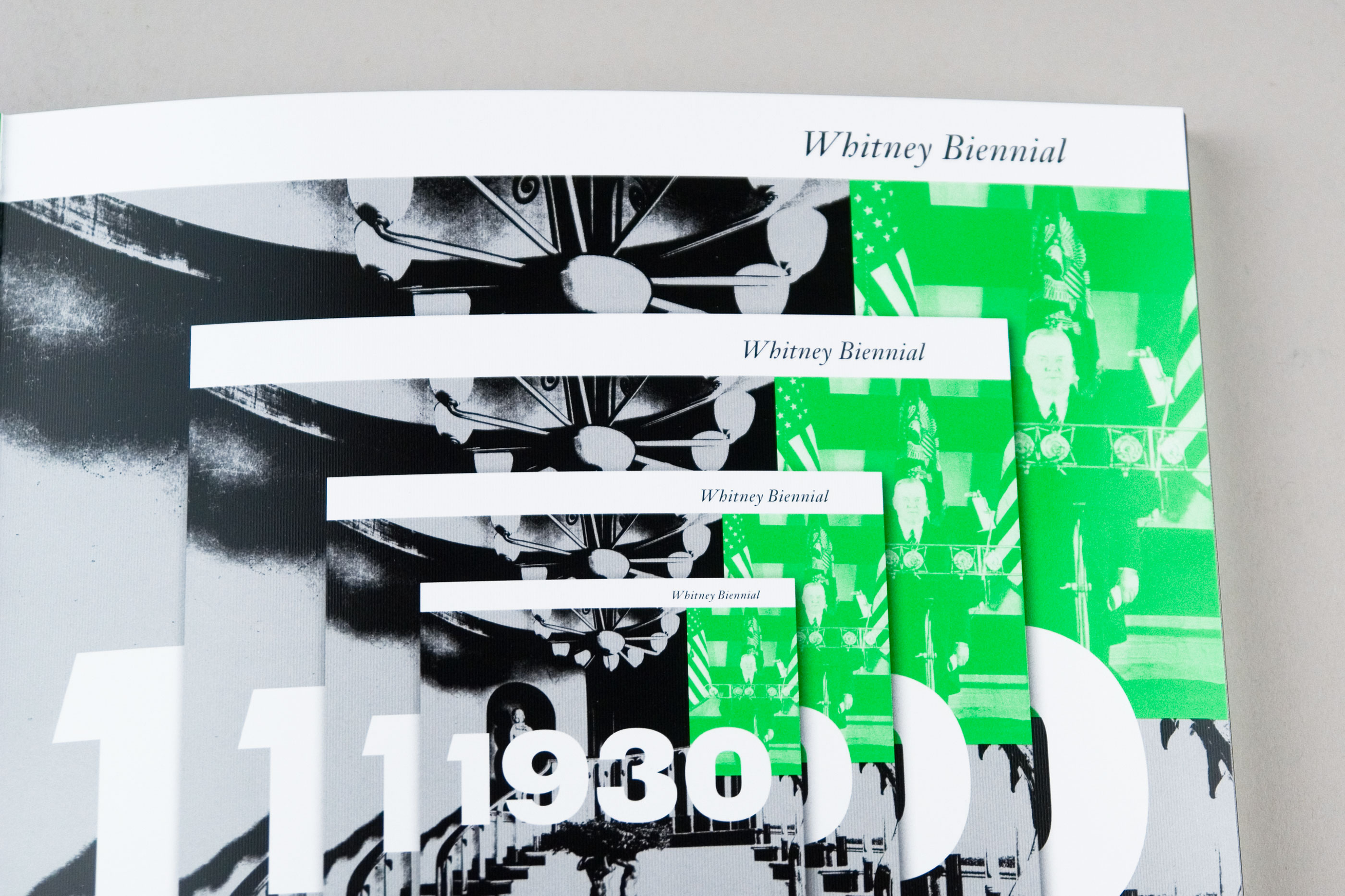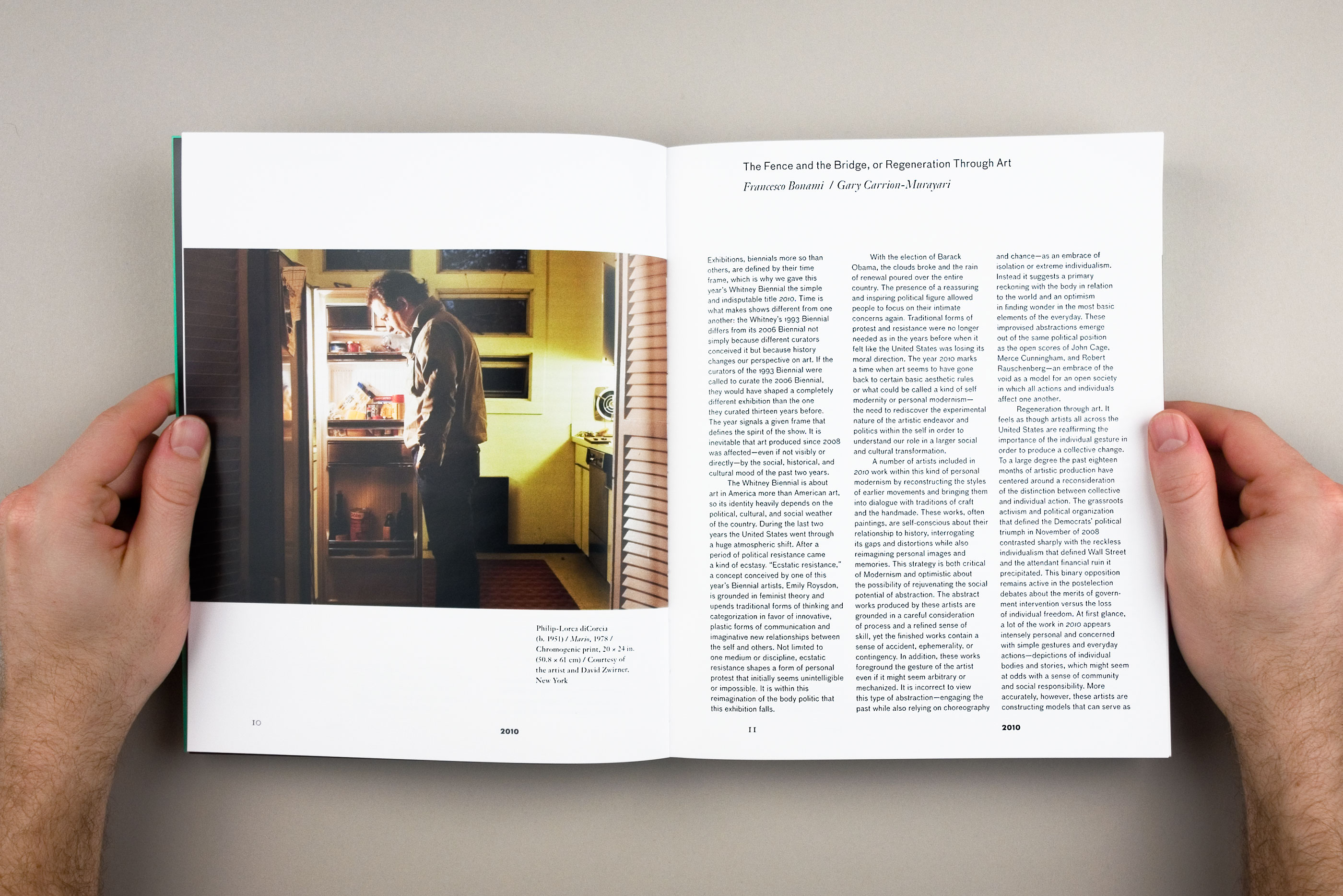 The design of the 2010 Whitney Biennial catalogue builds upon the history and logic of the exhibition series, in which a set of related frameworks is periodically applied as a means of representing recent contemporary American art.