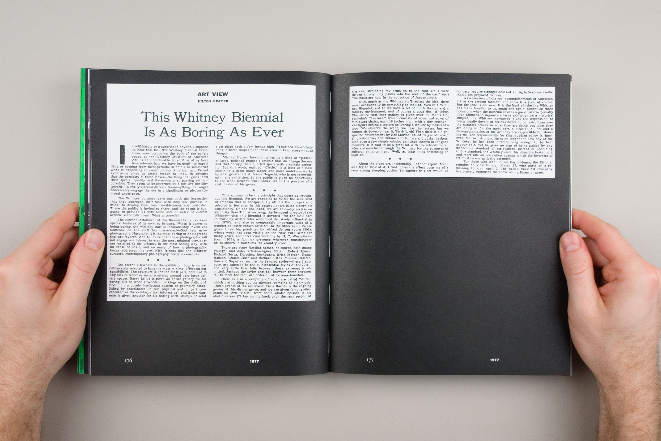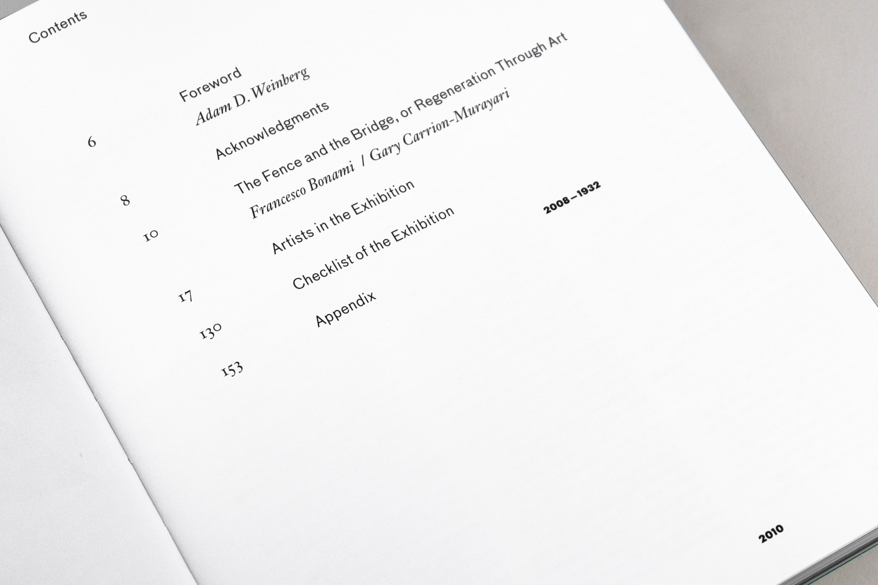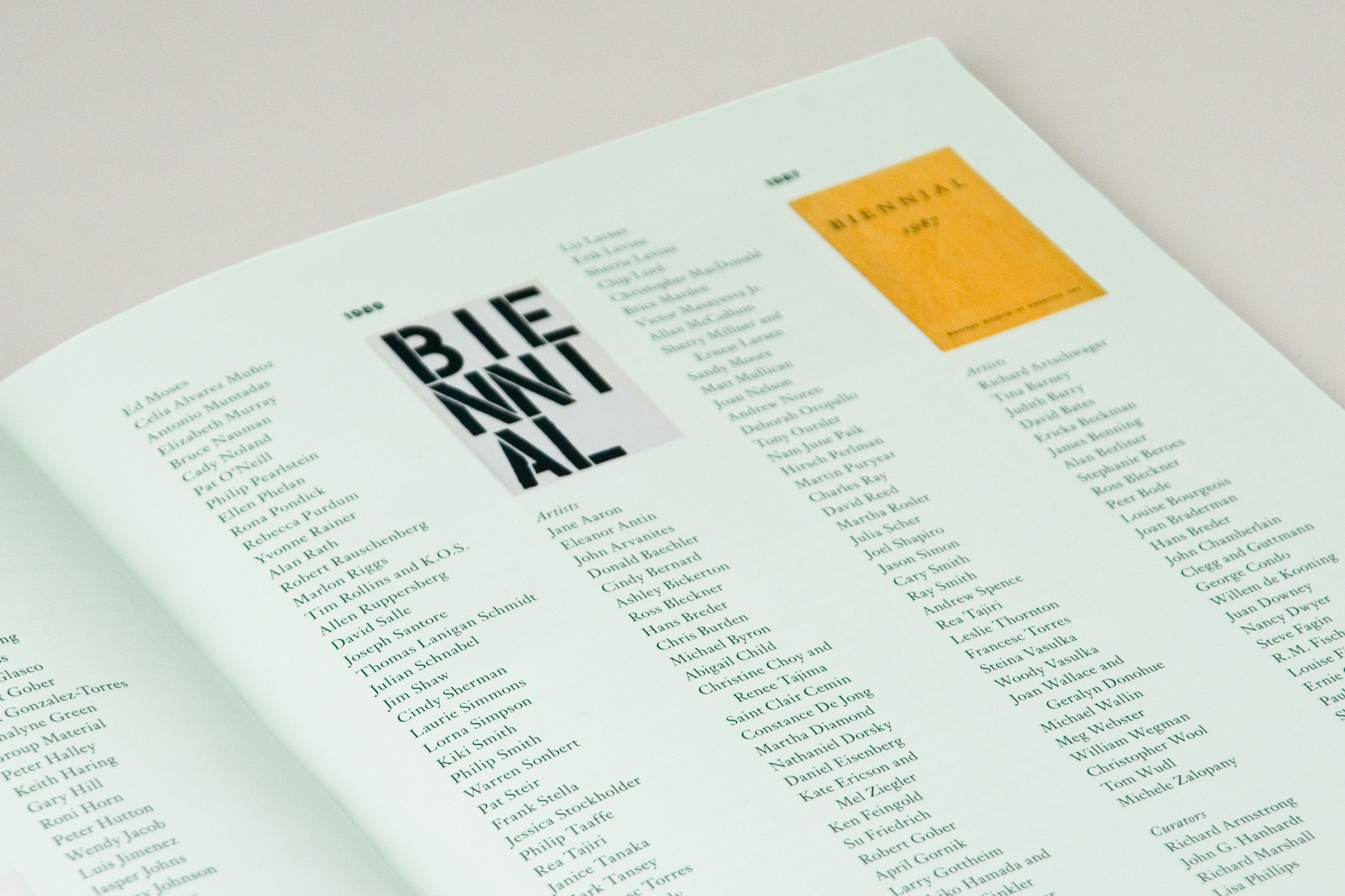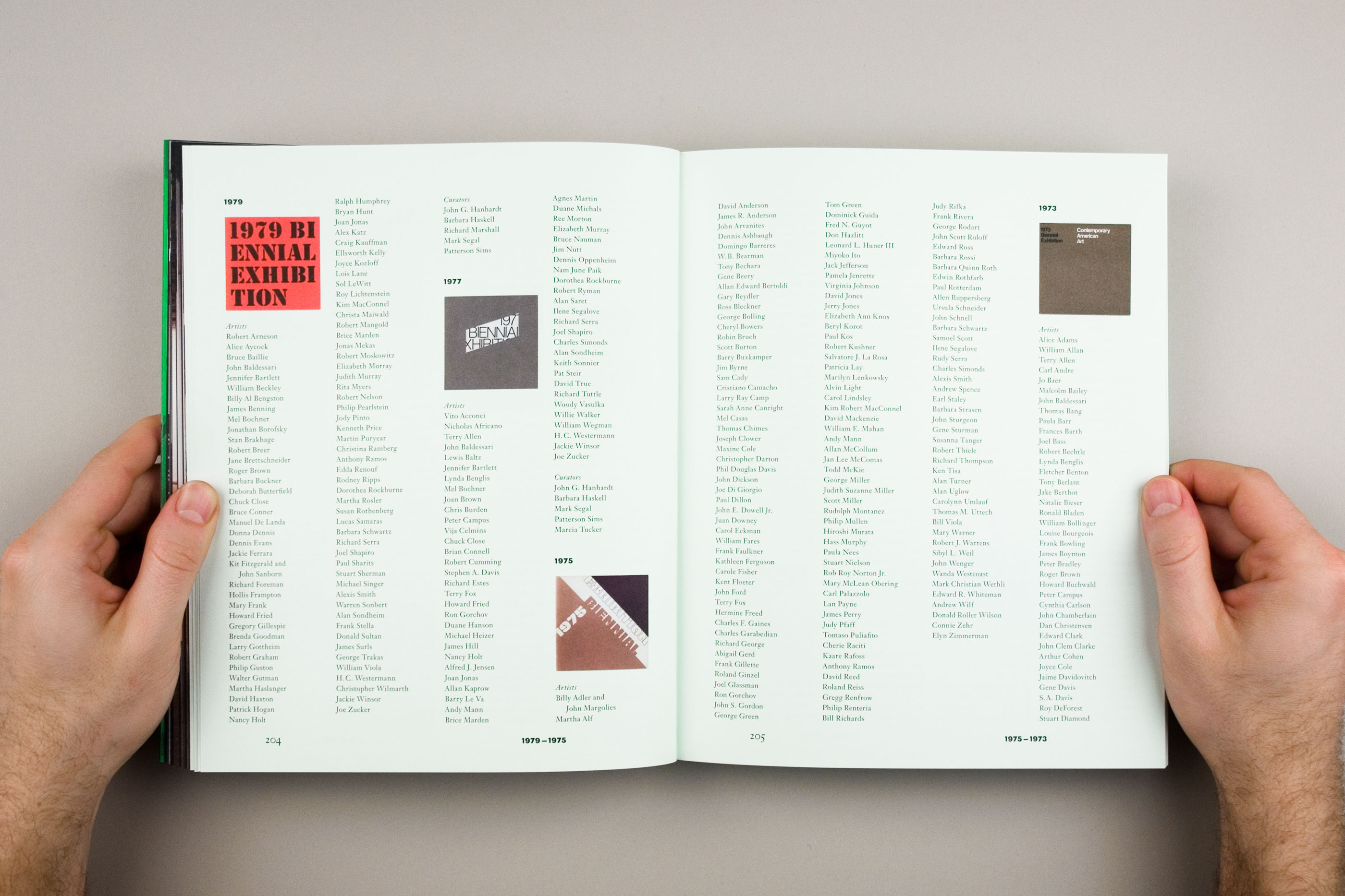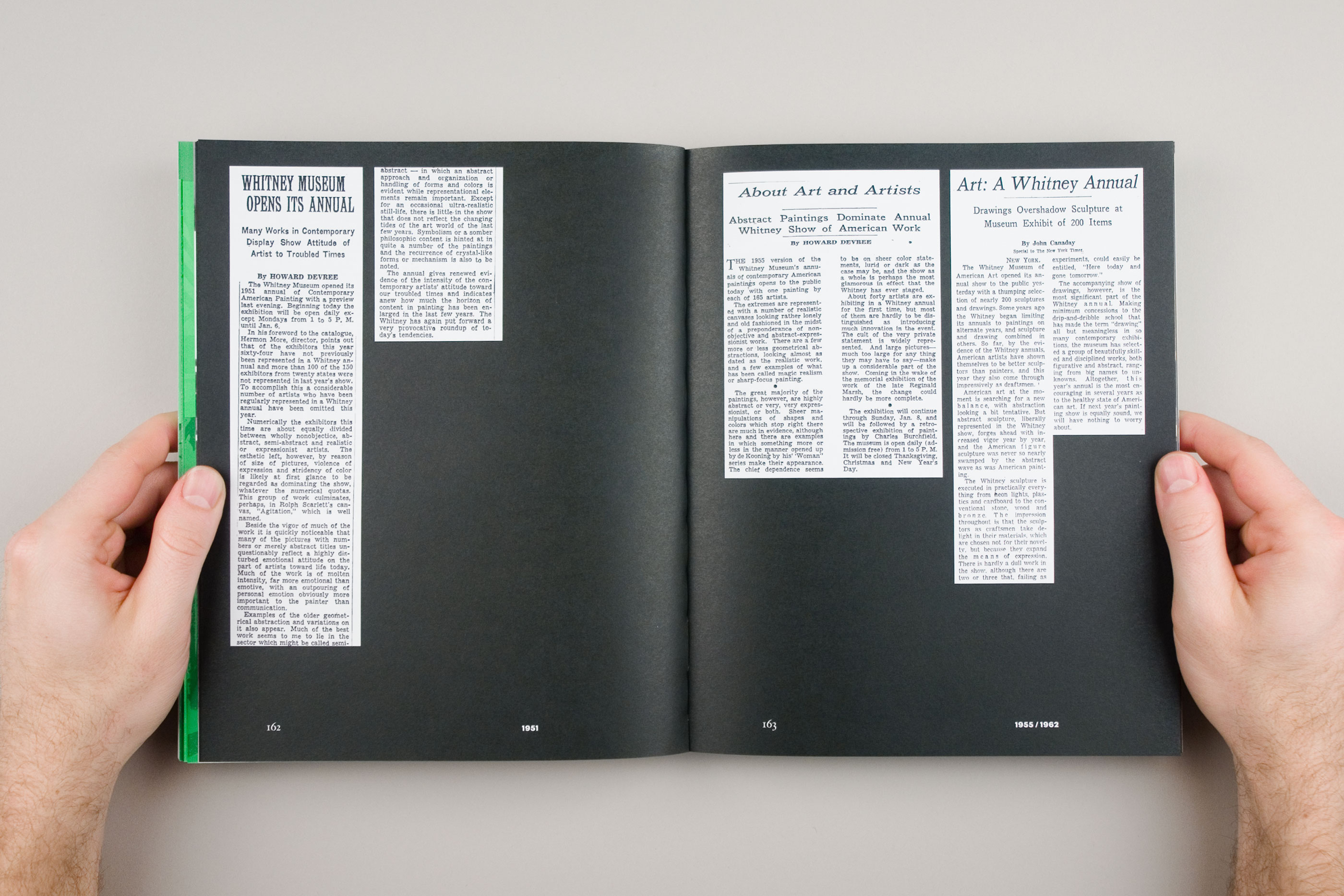 The design of the 2010 Whitney Biennial catalogue builds upon the history and logic of the exhibition series, in which a set of related frameworks is periodically applied as a means of representing recent contemporary American art.