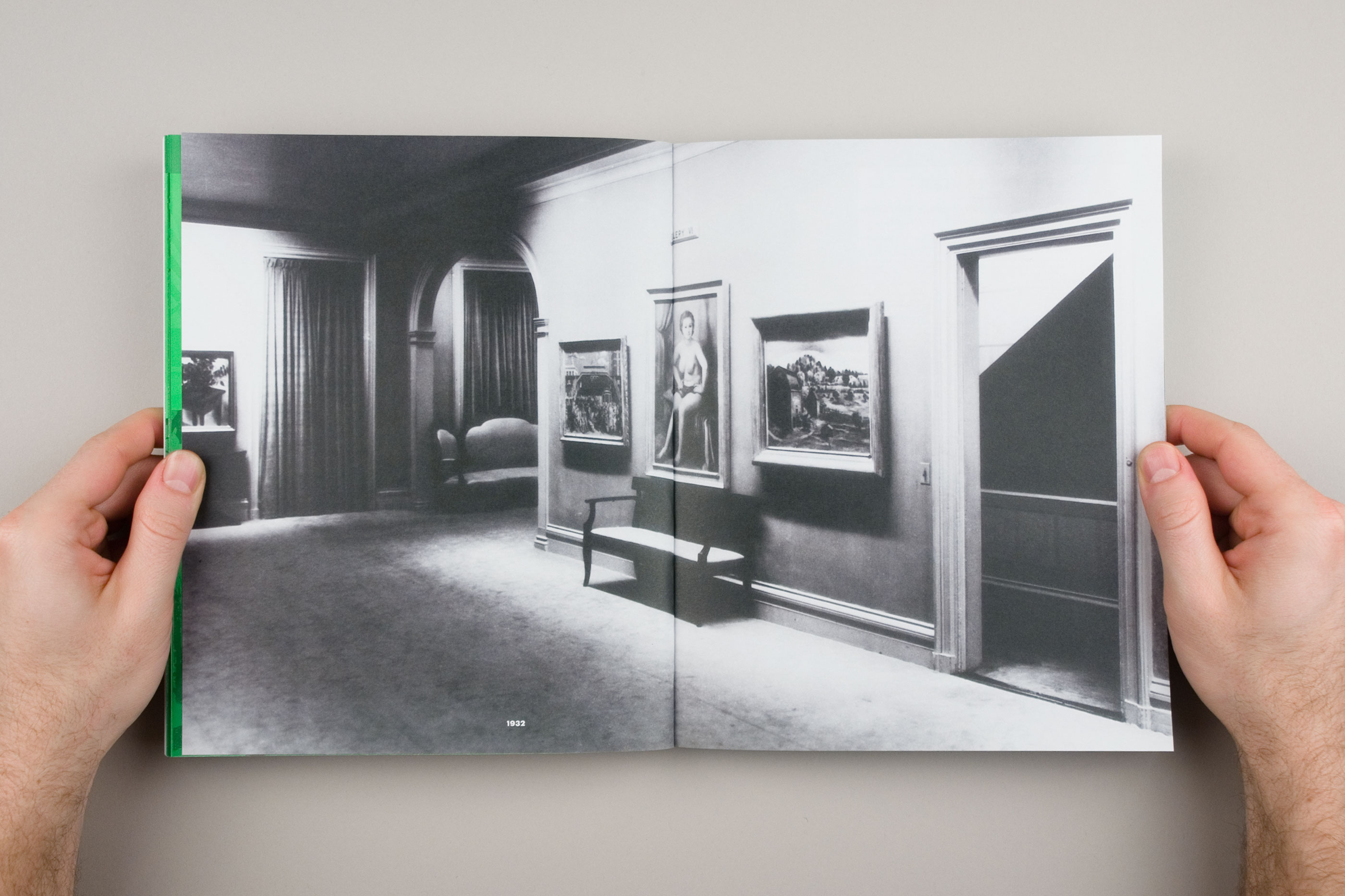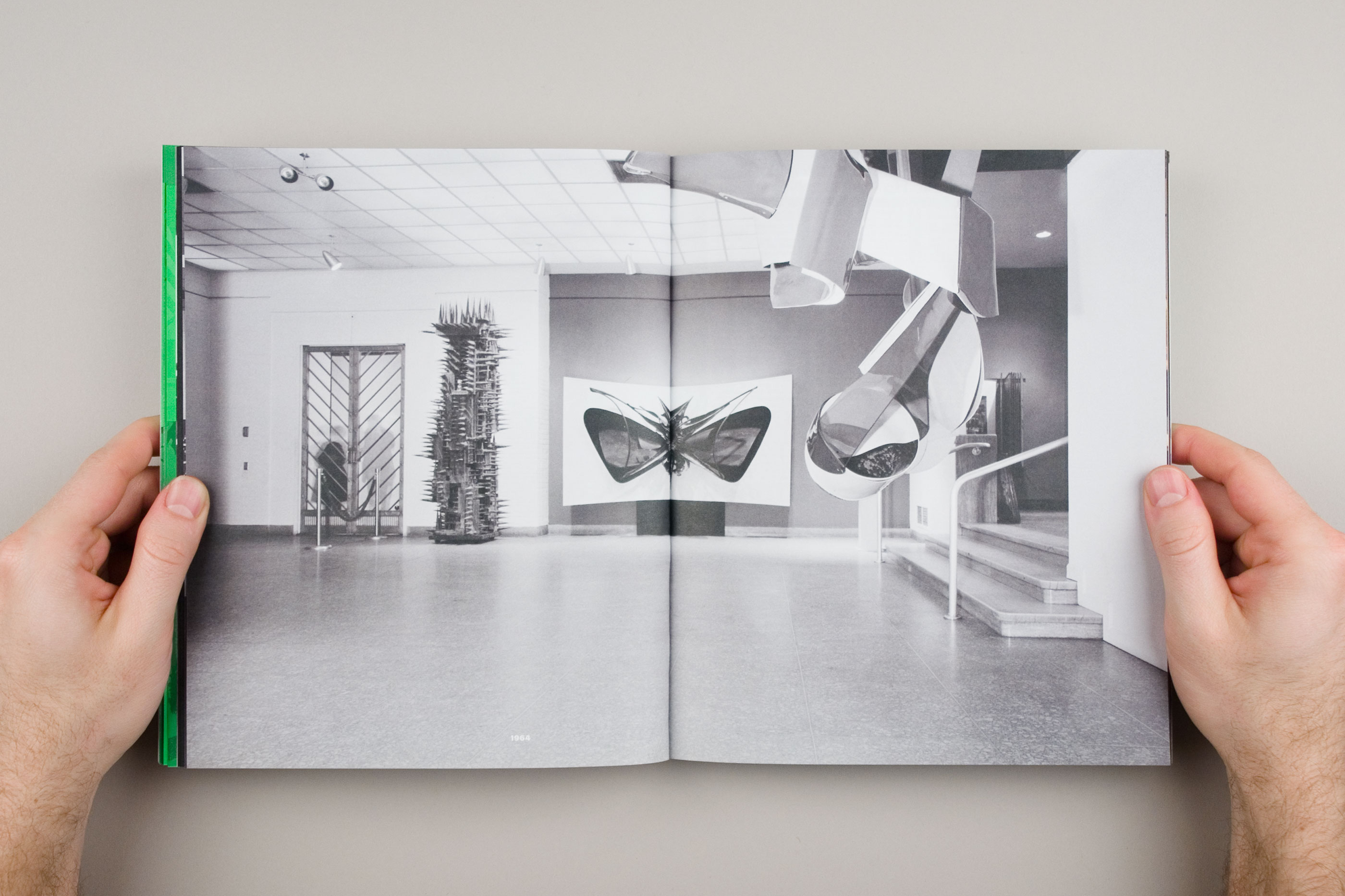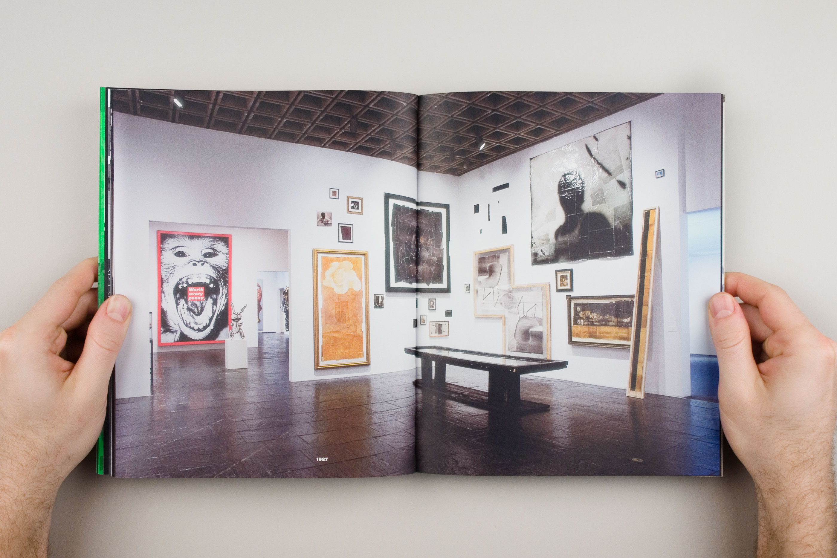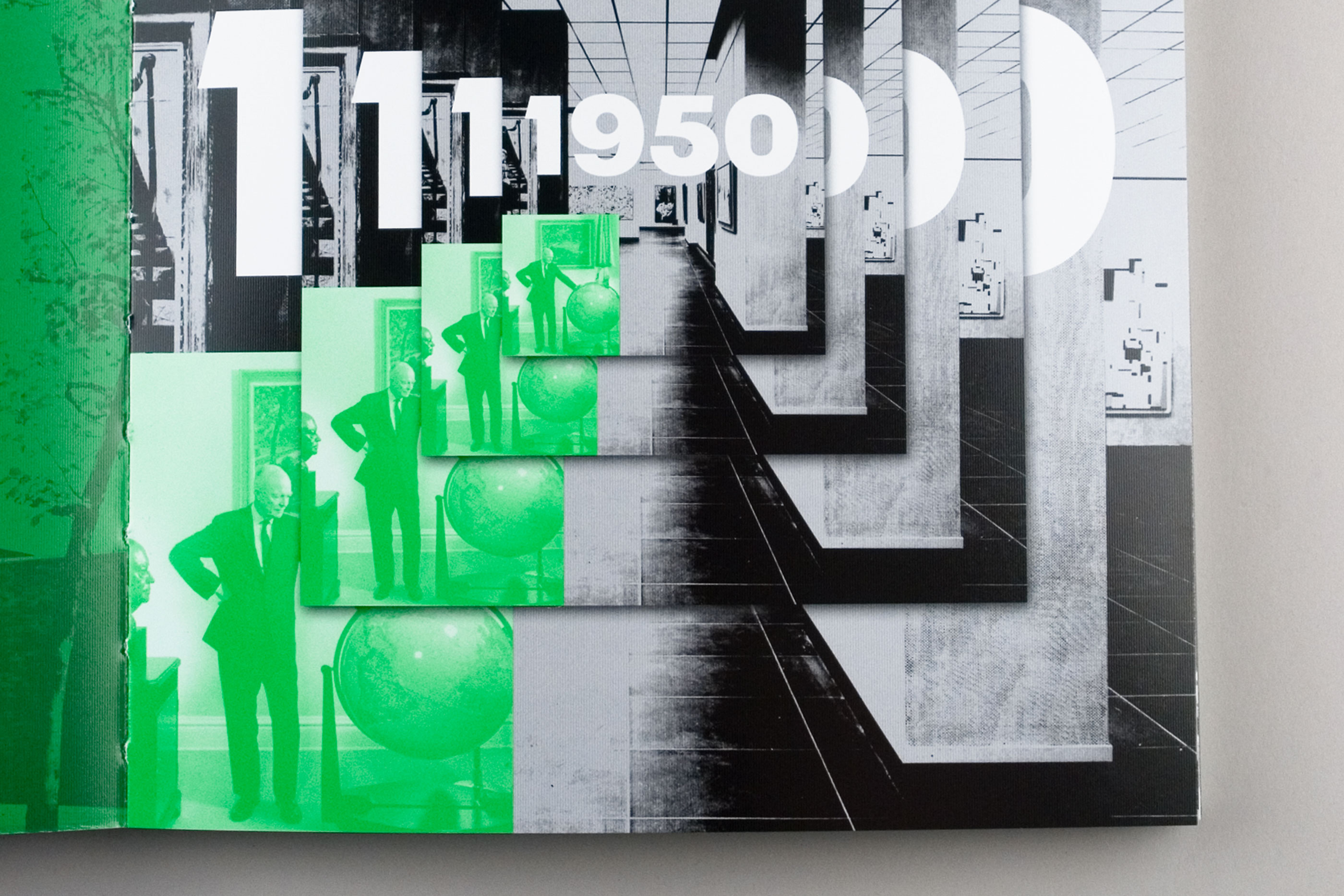 Both transitioning between and complicating access between past and present, a series of textured, glossy, awkwardly heavy pages layer archival photographs of the Whitney’s modern buildings with odd photographs of American presidents per decade. While providing the visceral sense of a paper-and-ink time machine, complete with the effect of vertigo, the section (and the book’s cover) acknowledge the weight of American political realities as pervading the privileged space of exhibition.