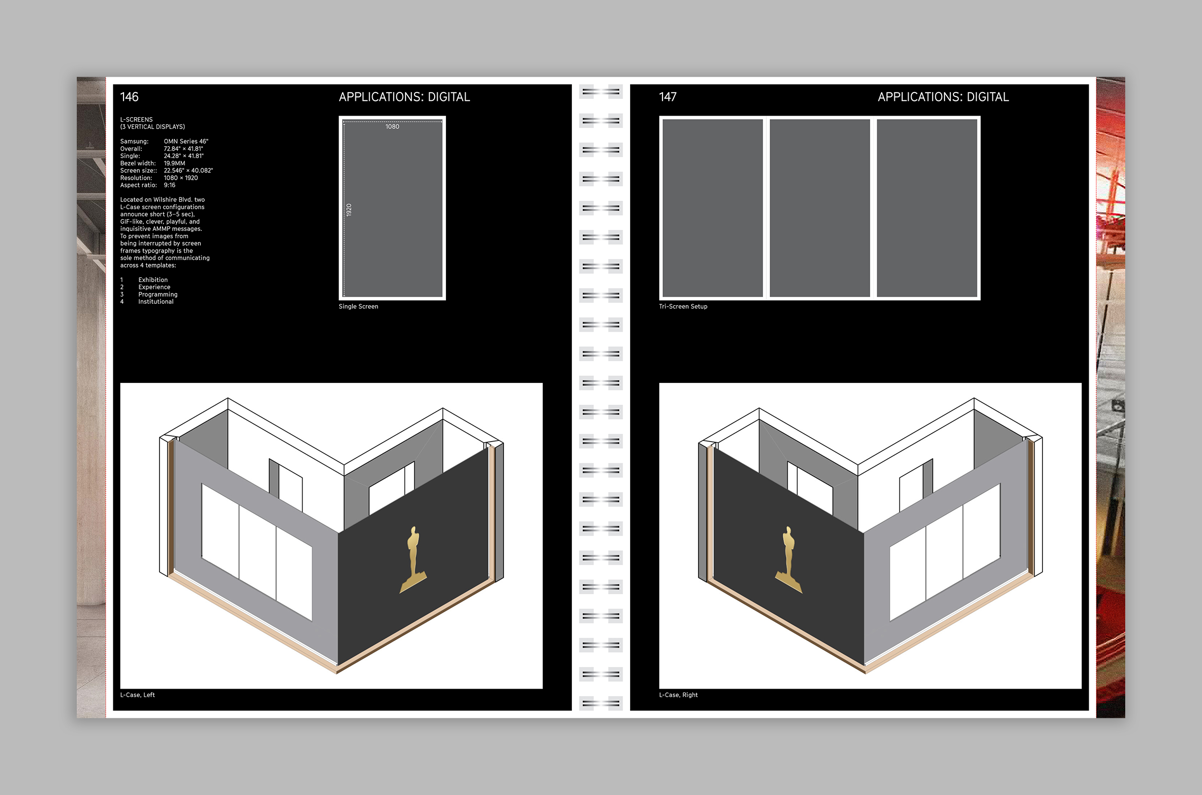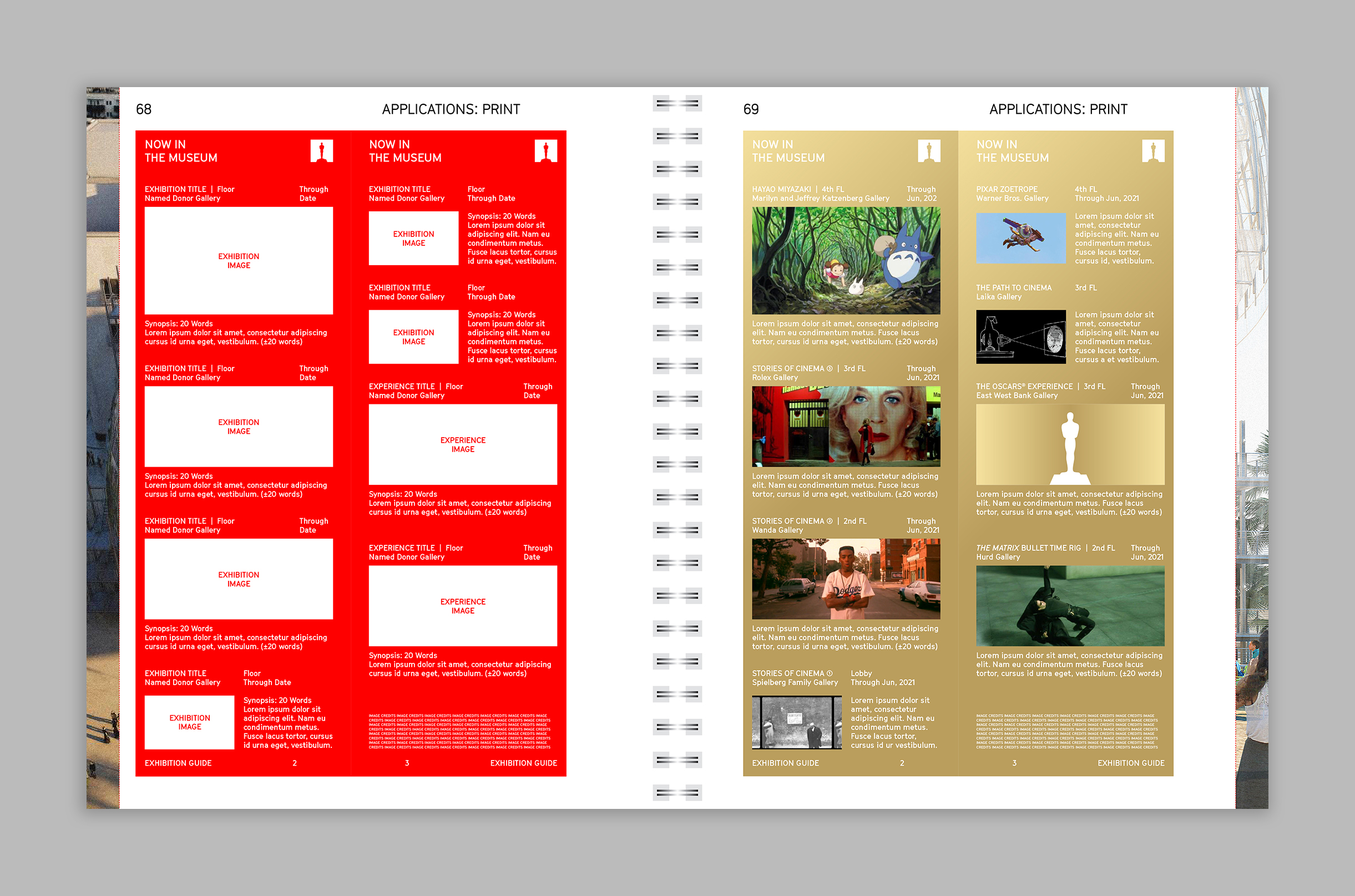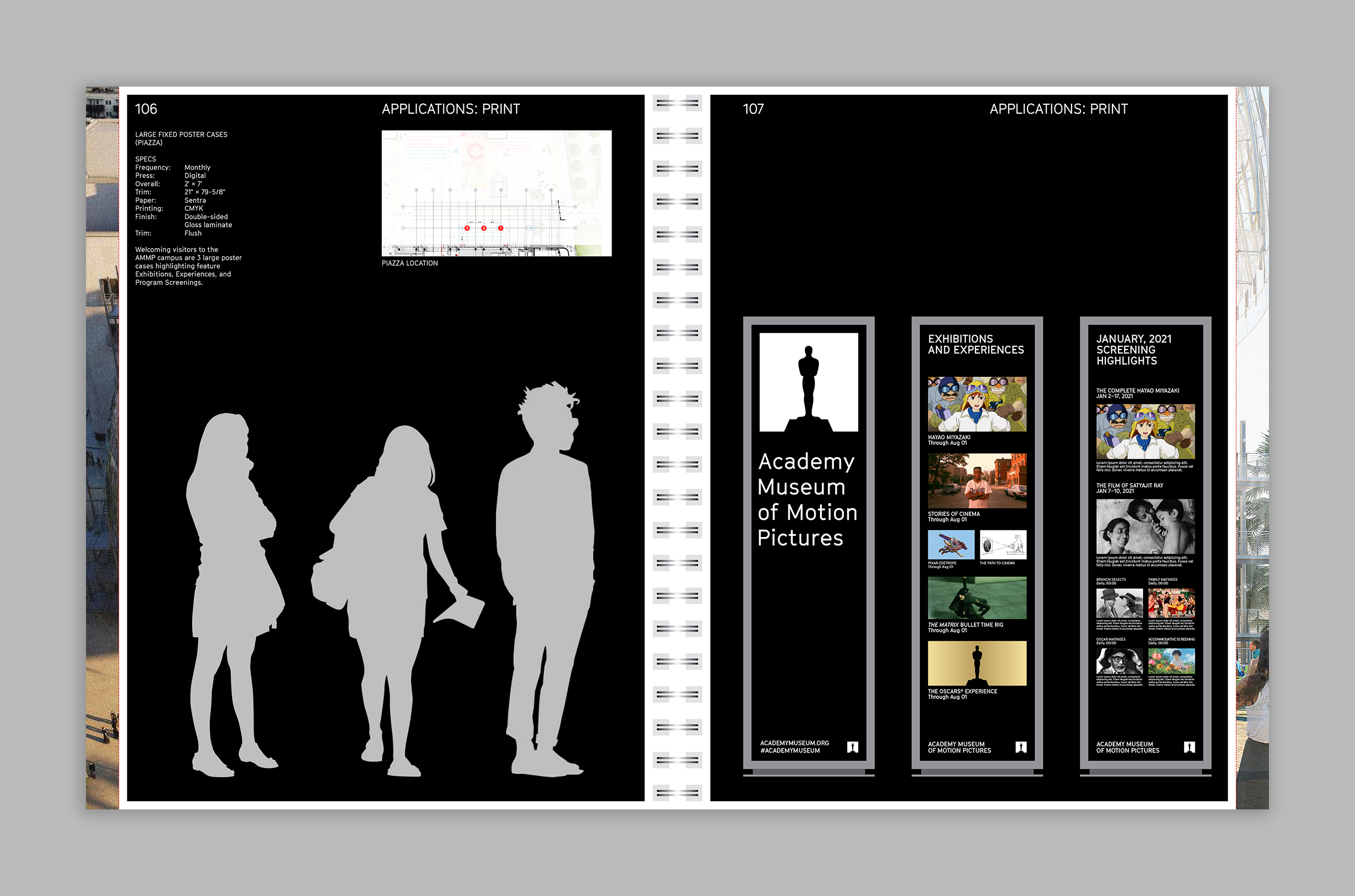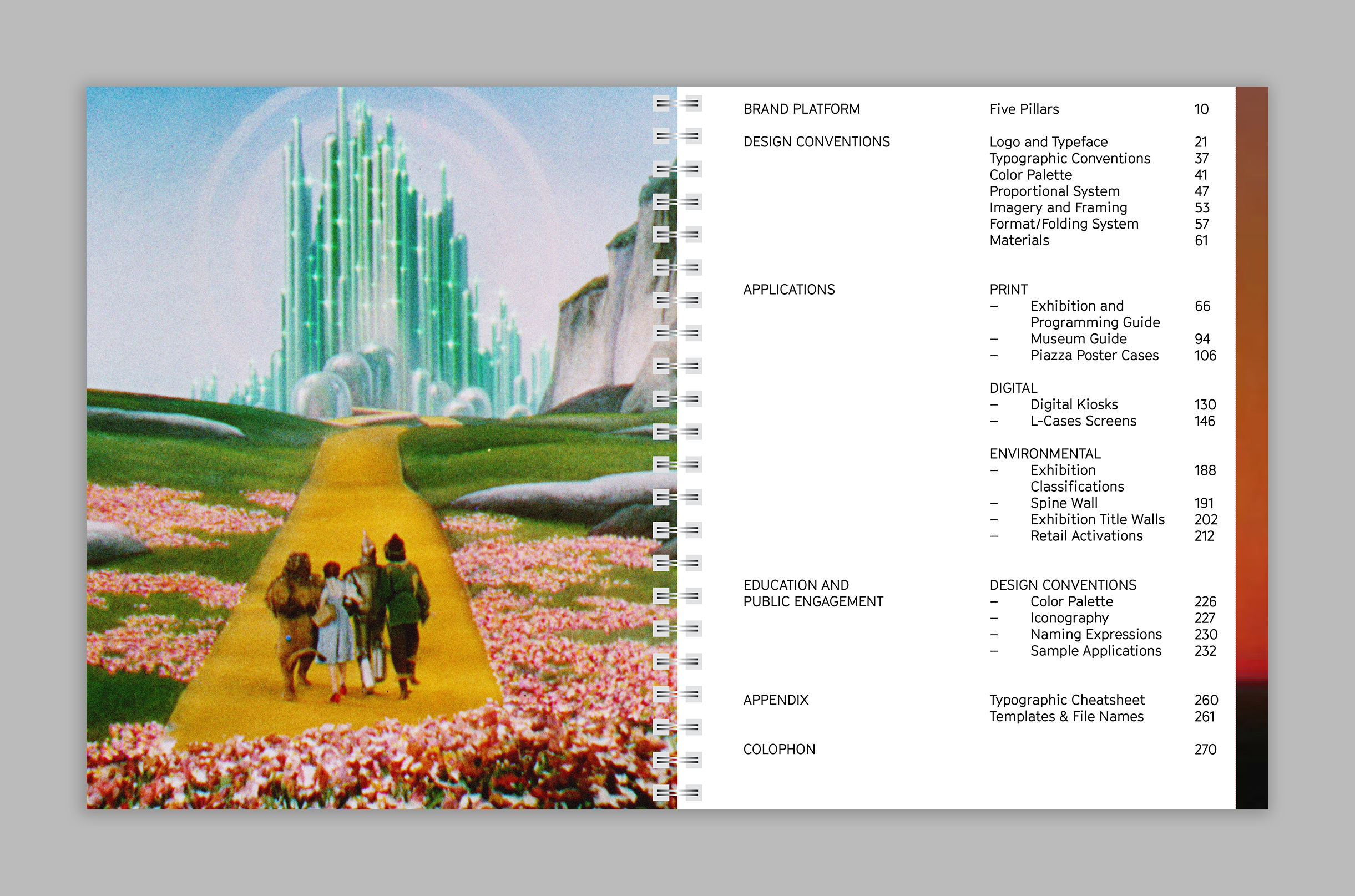 IN-FO.CO developed a comprehensive set of brand guidelines for the new Academy Museum of Motion Pictures in Los Angeles. Covering print collateral, environmental graphics, posters, motion graphics, maps, and digital signage, the extensive suite of applications, templates, and refreshed color palette embraces the bold new role of the first-ever museum dedicated to the art and science of movies. The uniquely faceted typeface GT Cinetype—based on a historical design for early cinema subtitling machines—is used throughout, in a subtle nod to the technical underpinnings that enable movie magic.
