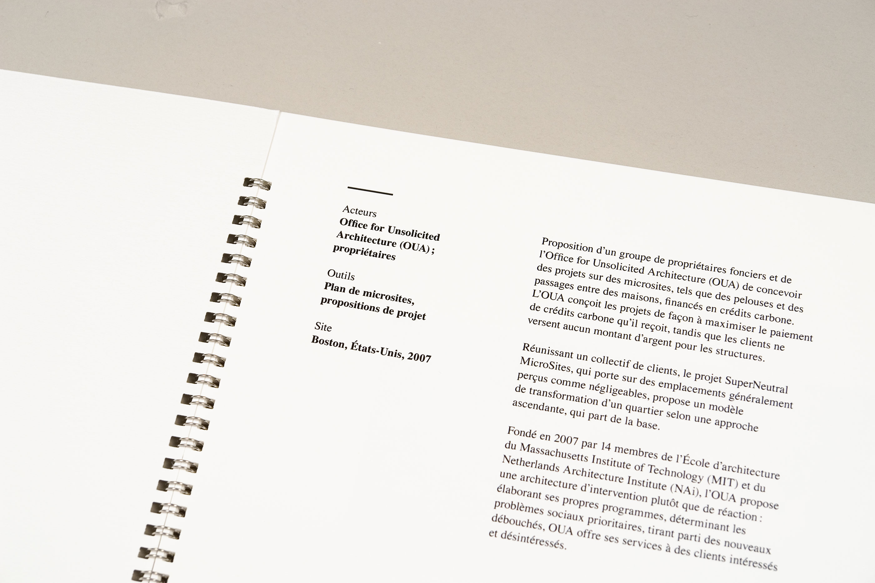 Actions, an exhibition at the Canadian Centre for Architecture in Montreal, explores how everyday human efforts can instigate positive change in contemporary cities. Activities such as gardening, recycling, playing, and walking are pushed beyond their usual definition by the 99 international architects, artists, and collectives featured in the exhibition. These experimental interactions with the urban environment show the potential for new forms of participation by city residents. The exhibition itself was designed in collaboration with the CCA, which includes a large number of print pieces intended to provide a material form for documentation of ephemeral urban activities. The exhibition travelled to the Graham Foundation in Chicago in 2009 and the X Bienal de Arquitetura de São Paulo in 2013.