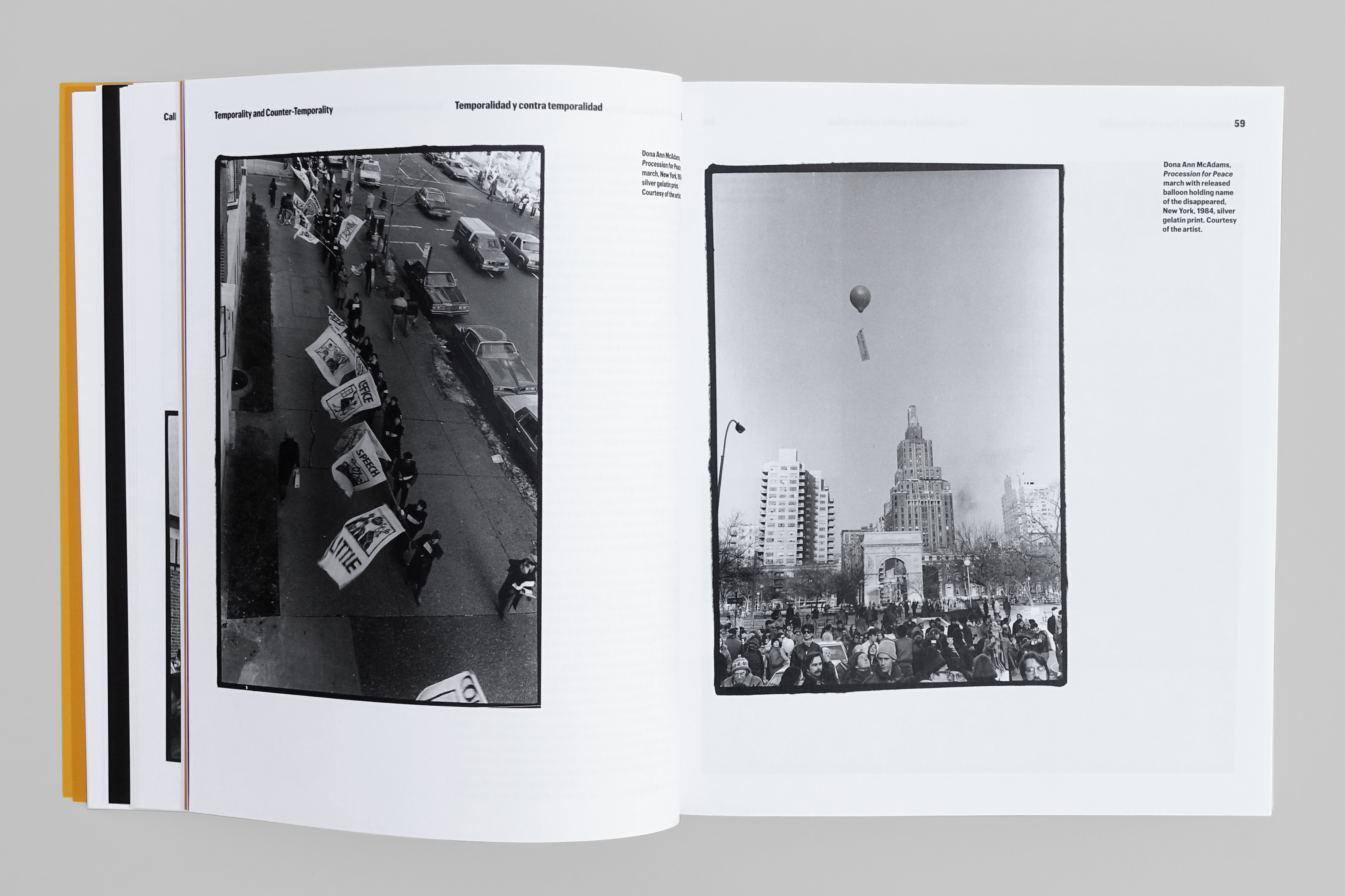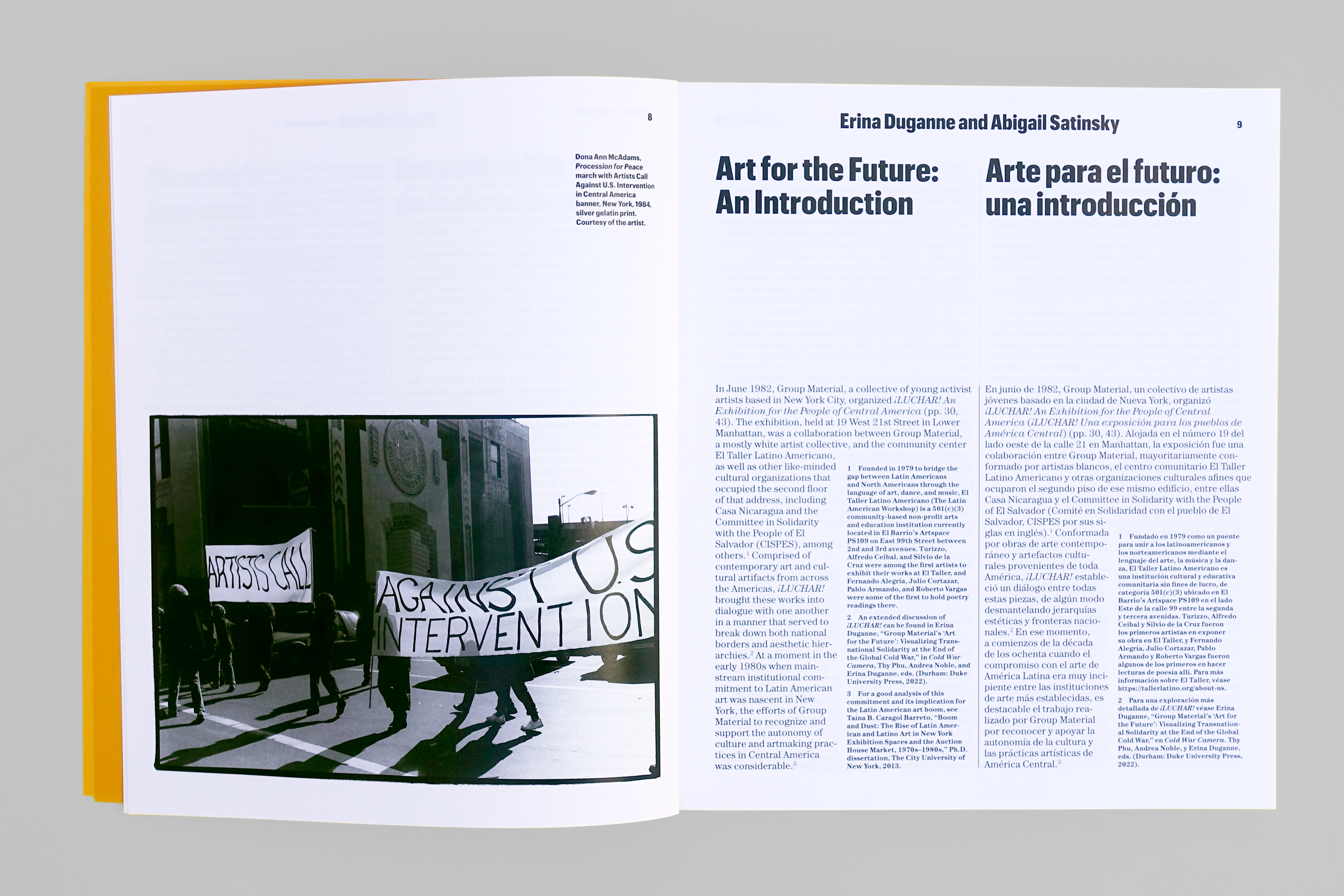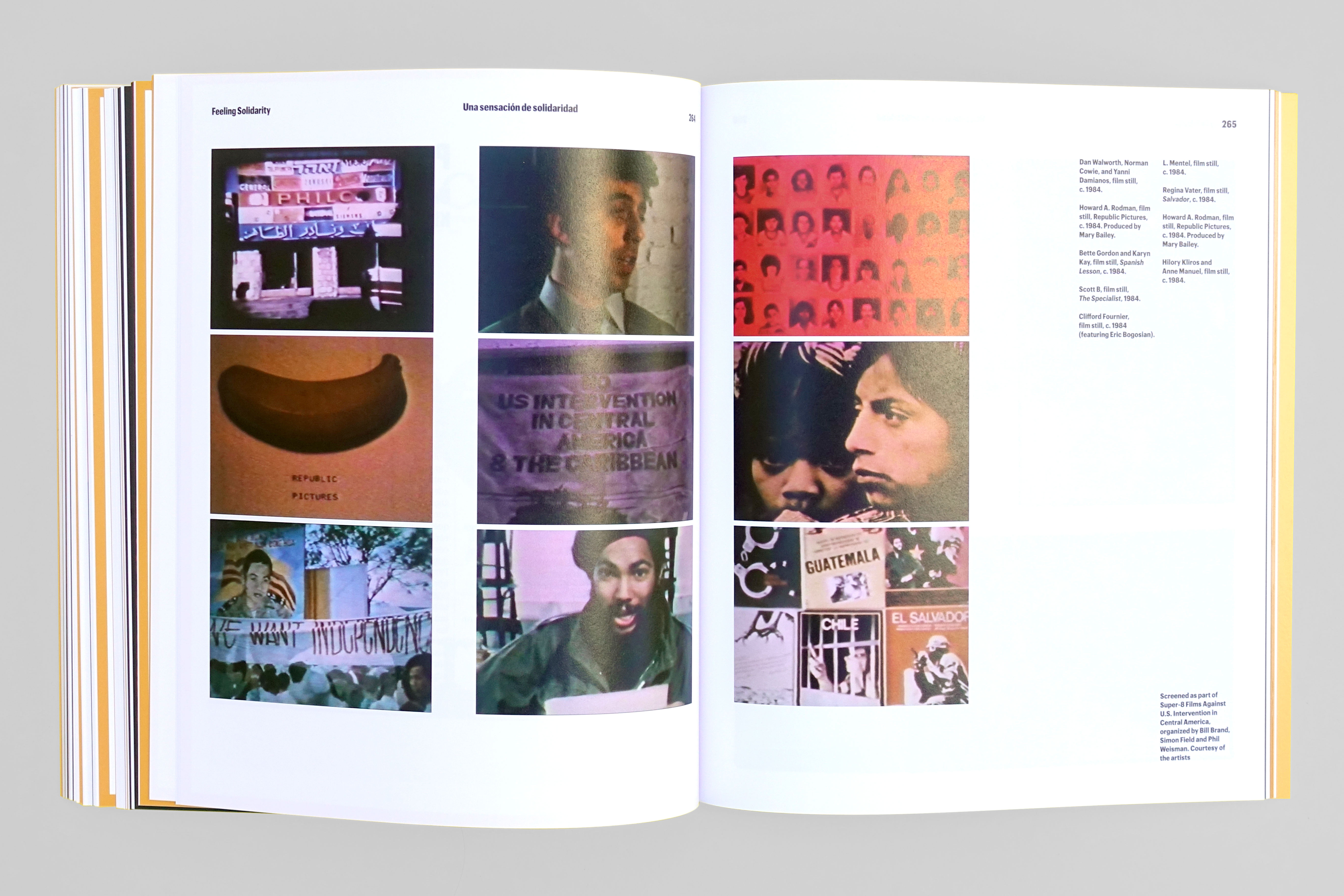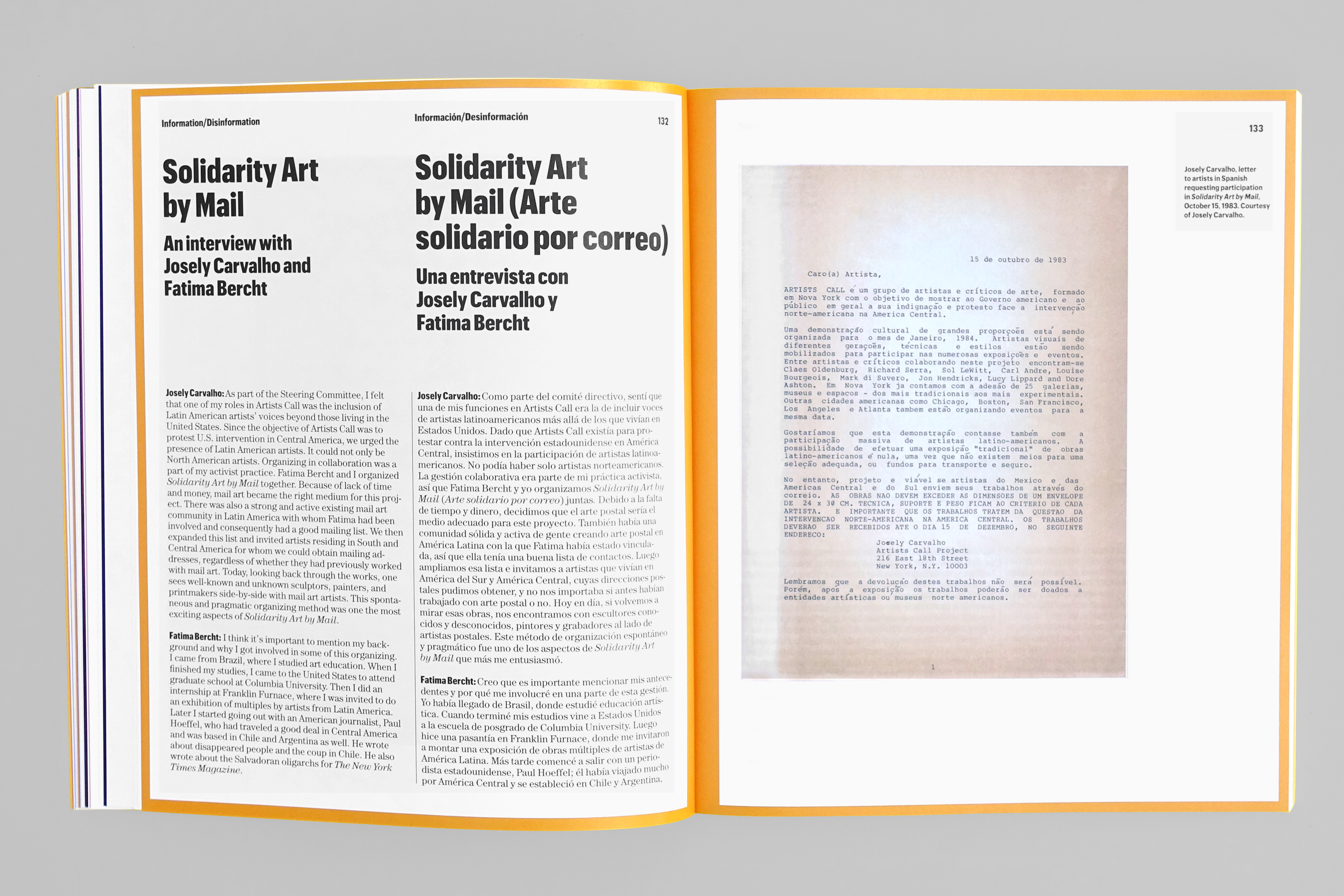 The bilingual catalogue has split text pages between English and Spanish translations, giving essays a mirroring-like quality. The book is divided into an accessible and identifiable framing system in which interviews are framed in gold and artists’ contributions in black. The cover also approaches this duality with an inversion of standard uncoated and coated paper that adds a softness to the uncoated front cover with an embossed bright yellow title.