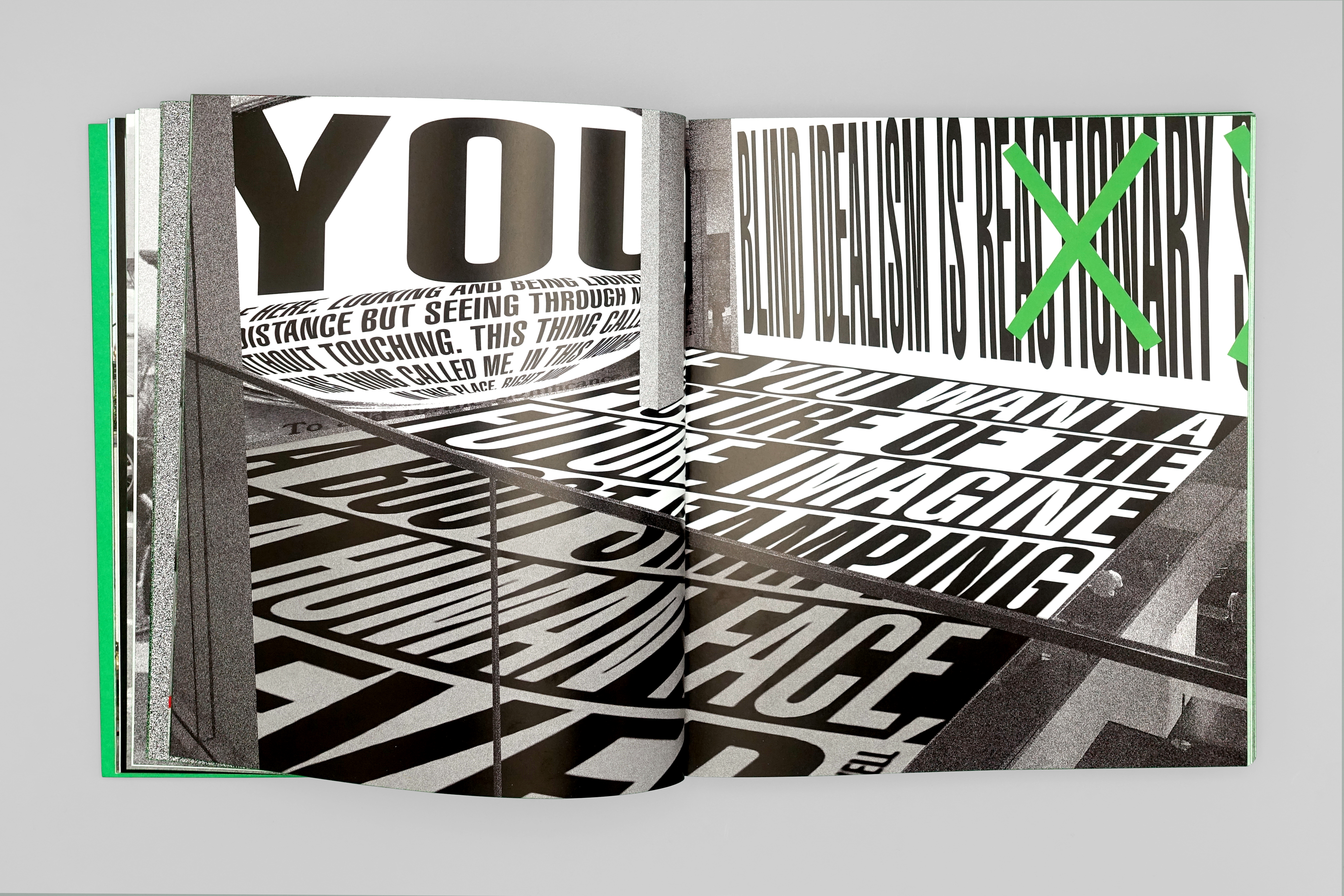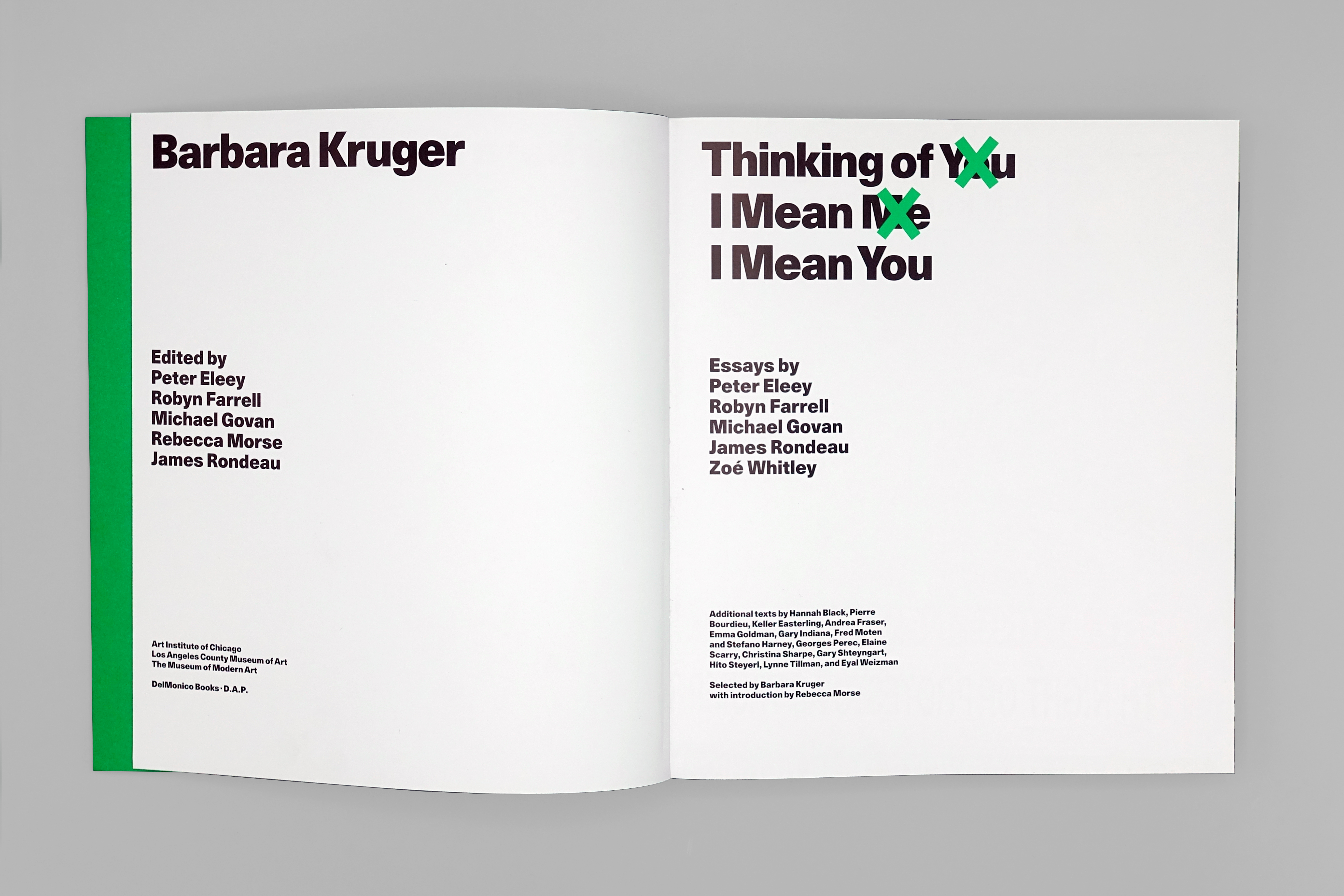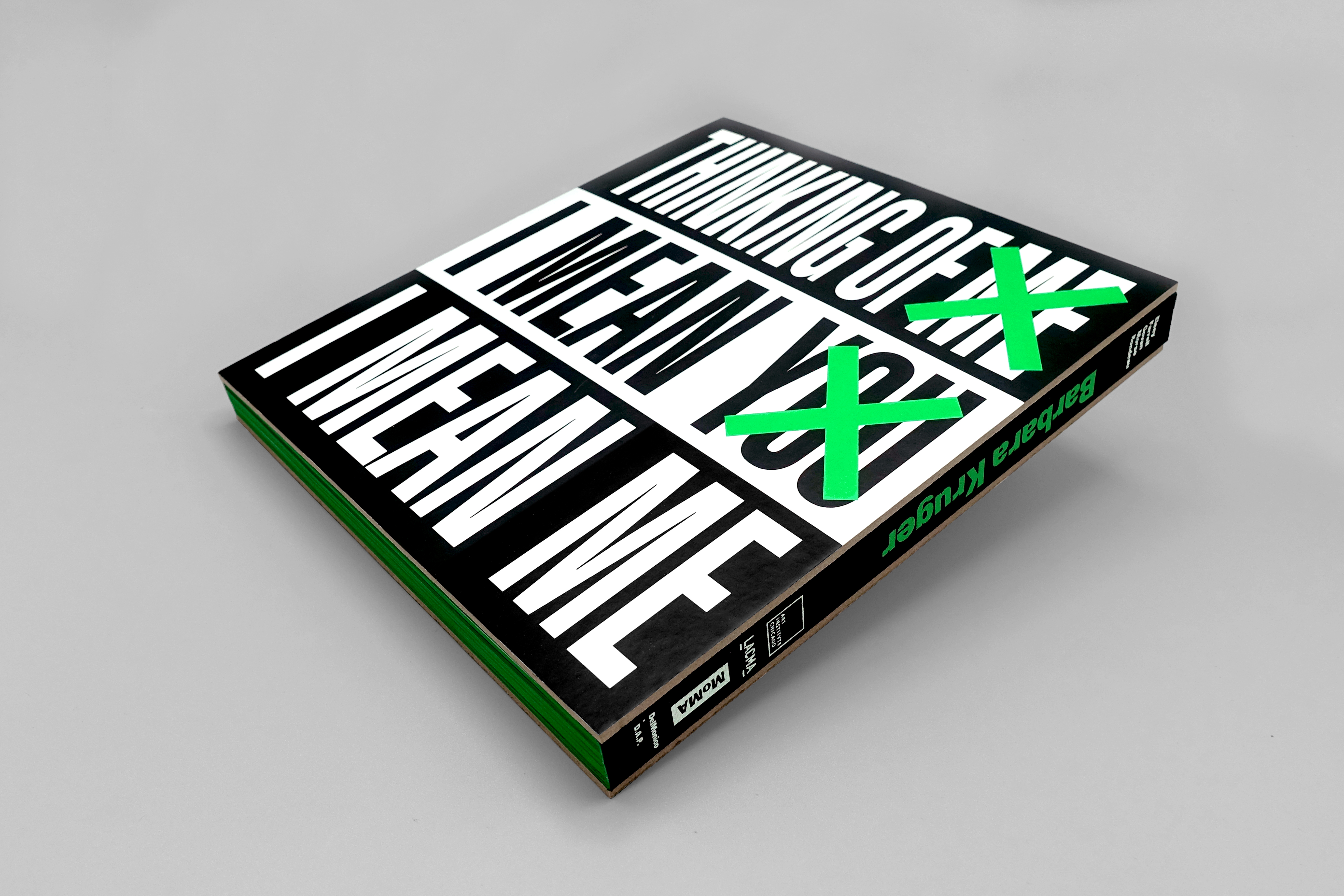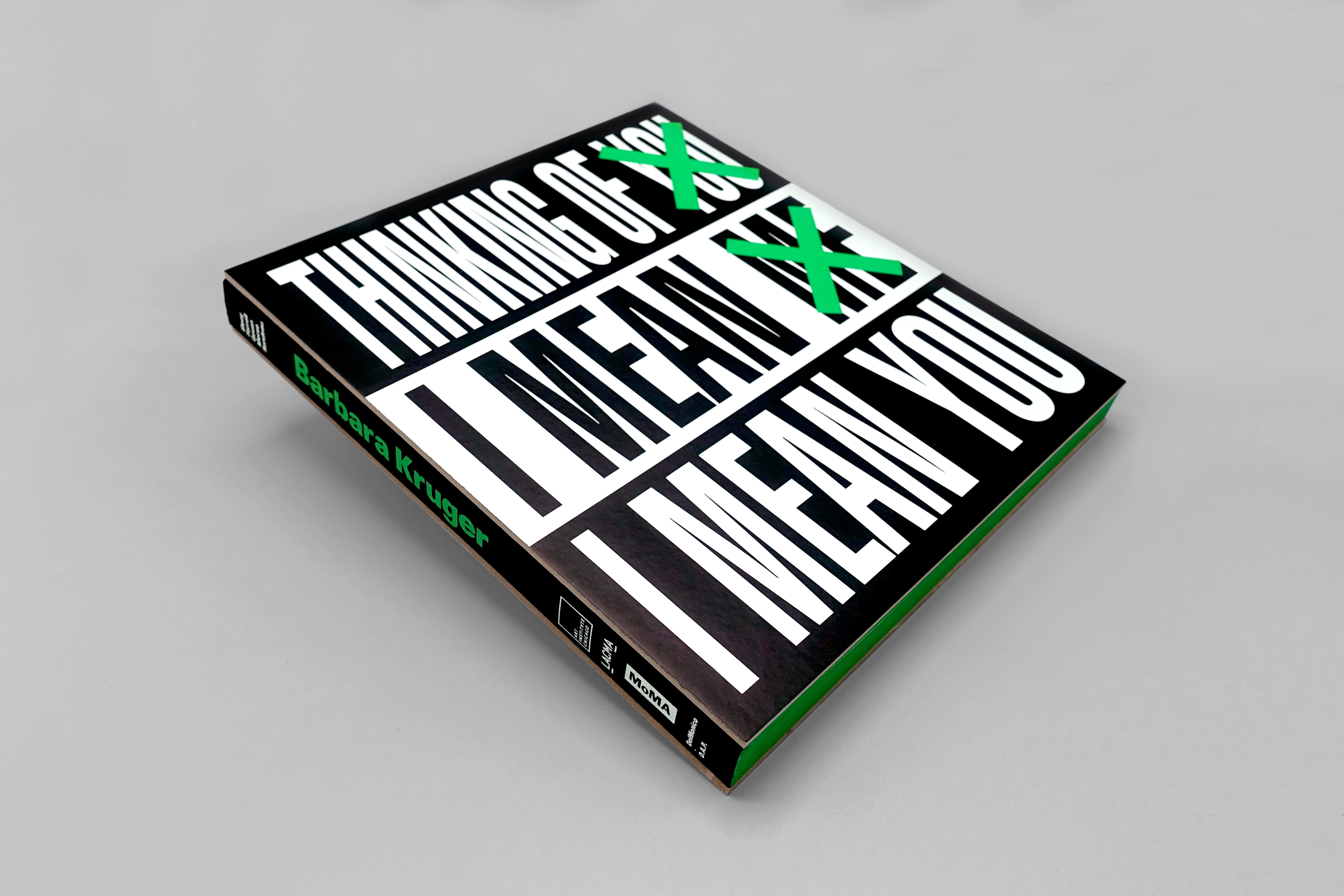 Thinking of You. I Mean Me. I Mean You. showcases Kruger’s site-specific works as reconceived for each venue, and includes a section of reprinted texts drawn from her teaching curriculum. Designed by IN-FO.CO in close communication with Kruger, the book’s flush-trimmed boards, green-tinted page edges, and bold typography extend the visceral impact of the work itself. Created in 2020 amidst a vast array of political and public health unknowns, the publication includes up-to-the-minute images of Kruger’s public work in the world alongside the year’s widespread protests, as well as renderings (designed by IN-FO.CO using Kruger’s vector art and venue snapshots) that show future museum installations, framing the book and work within and beyond institutional settings.