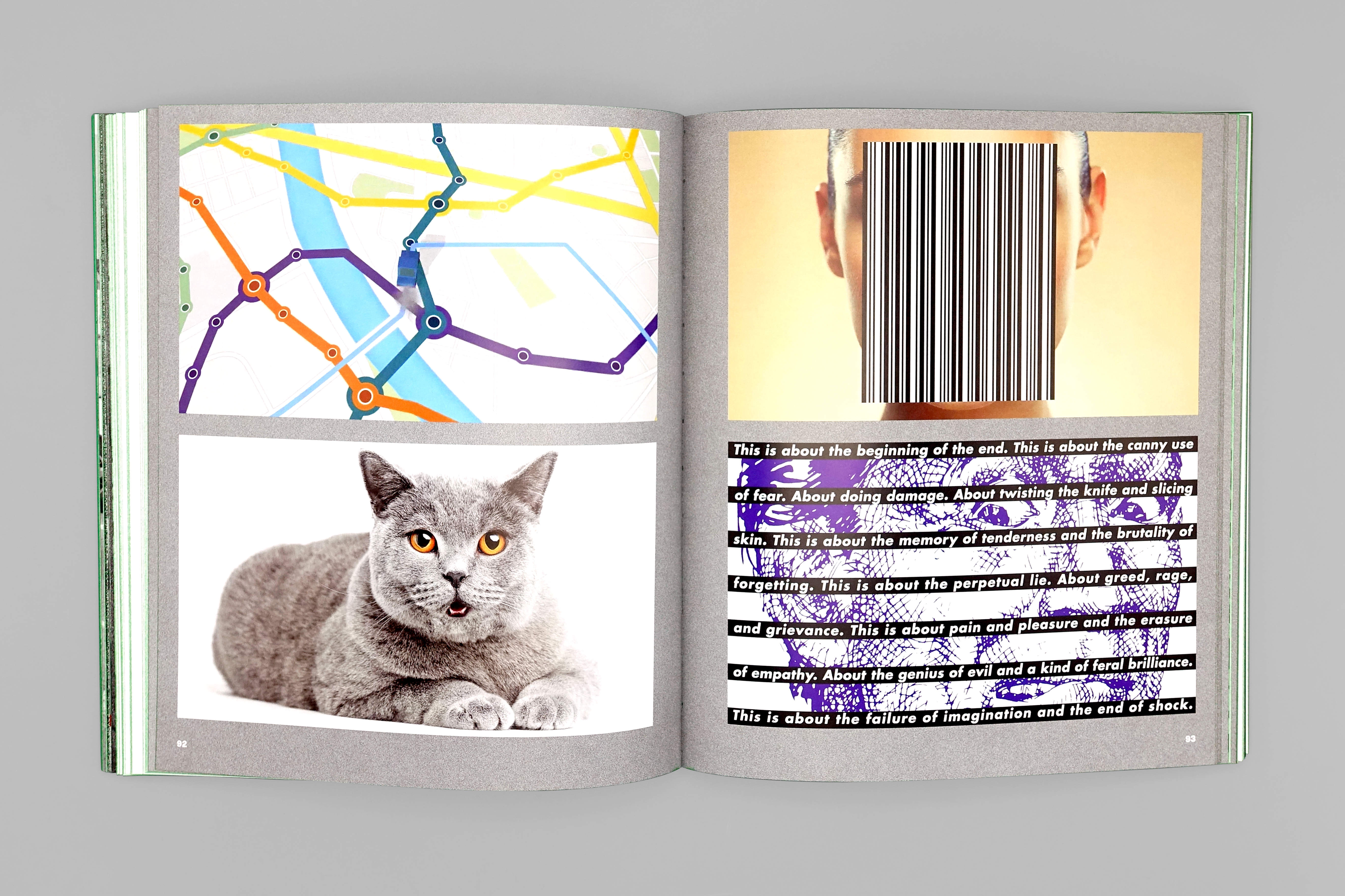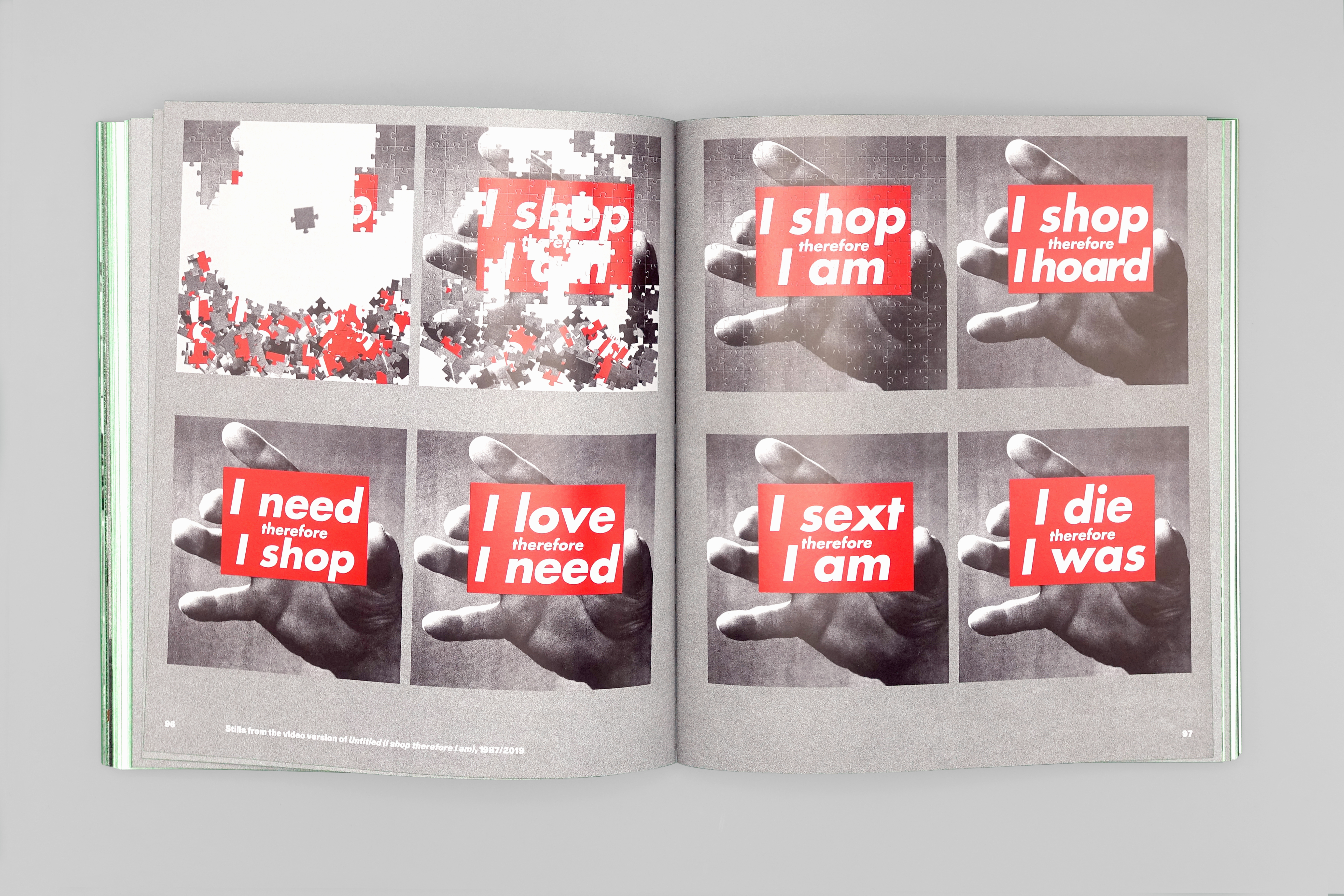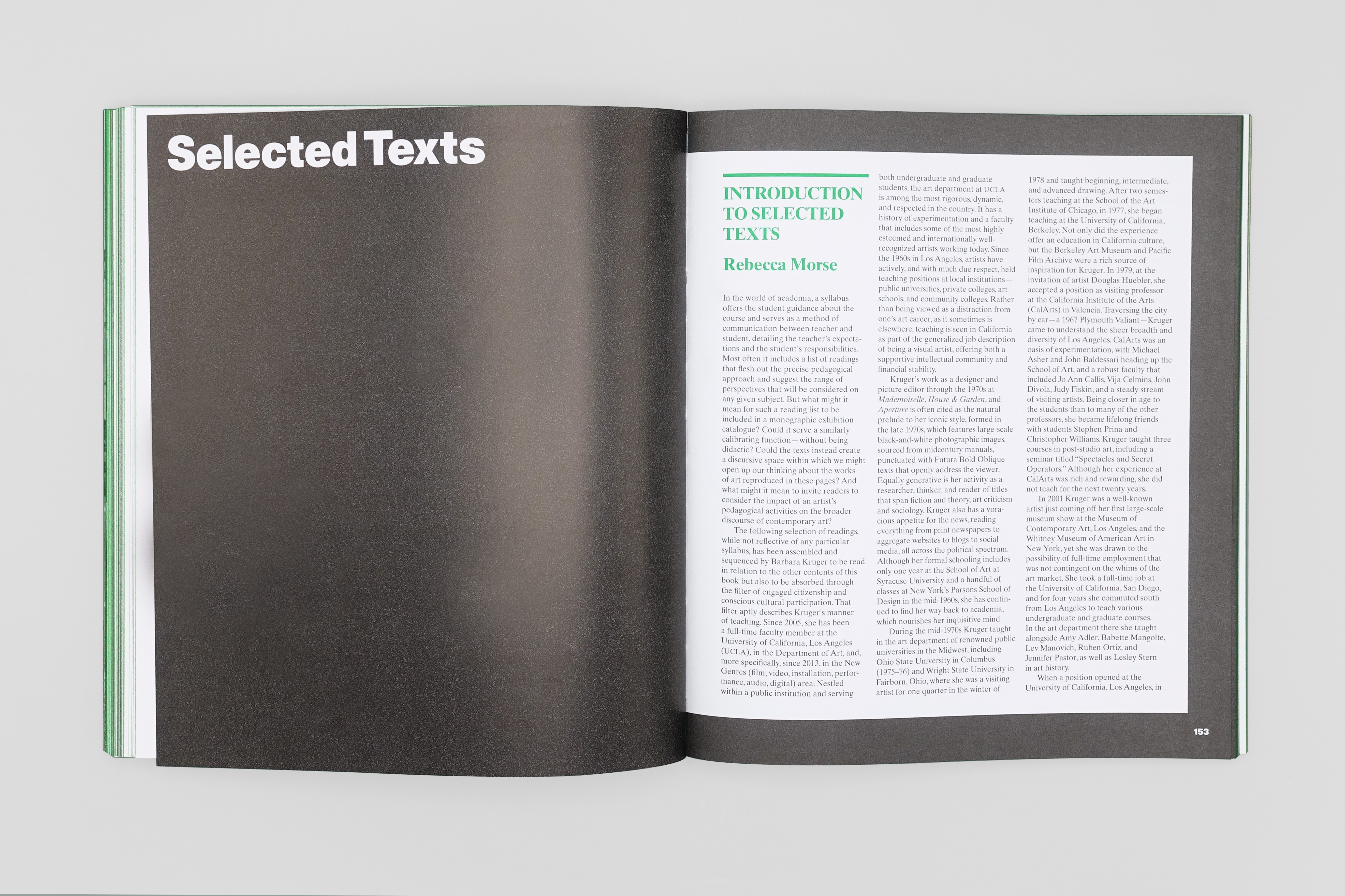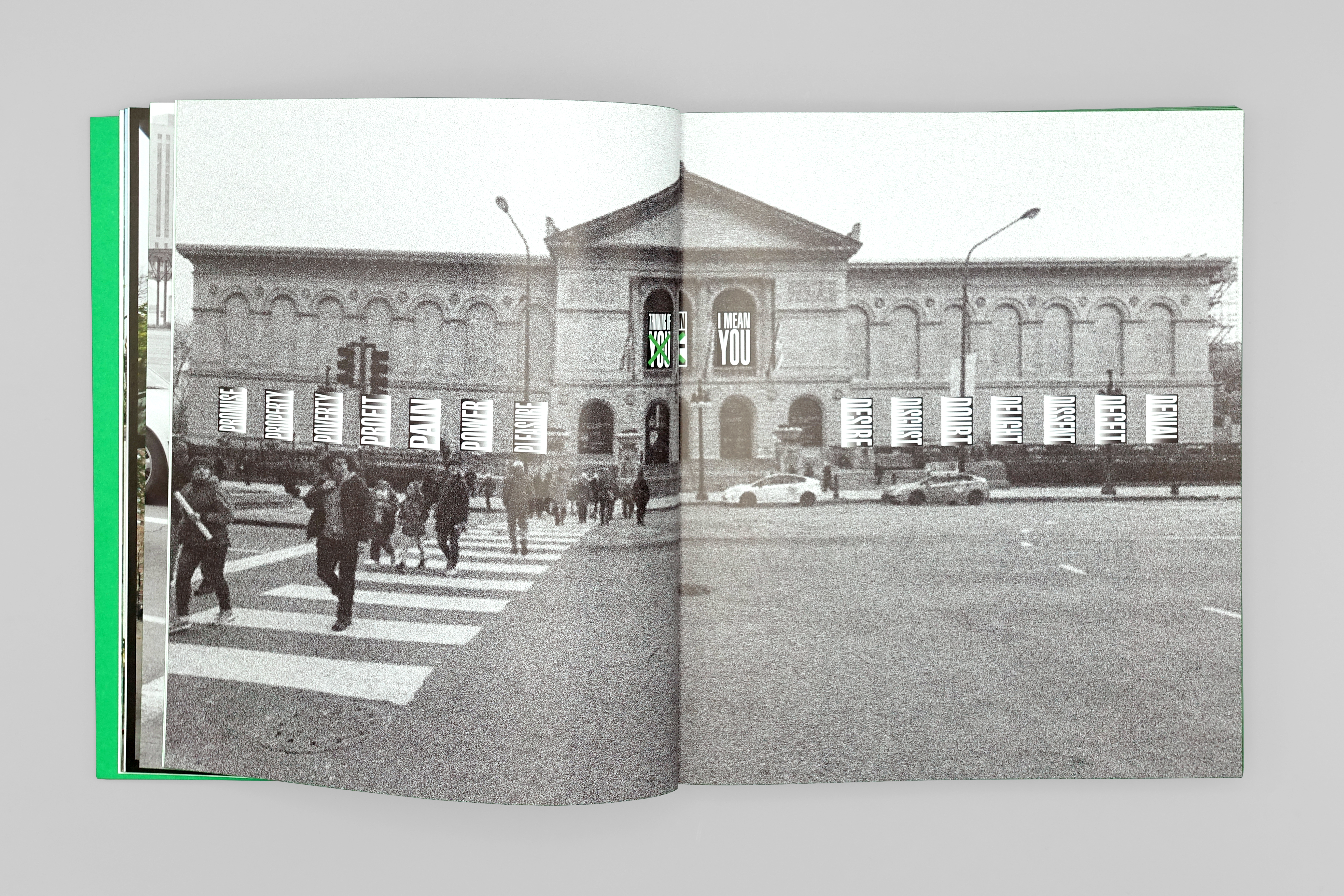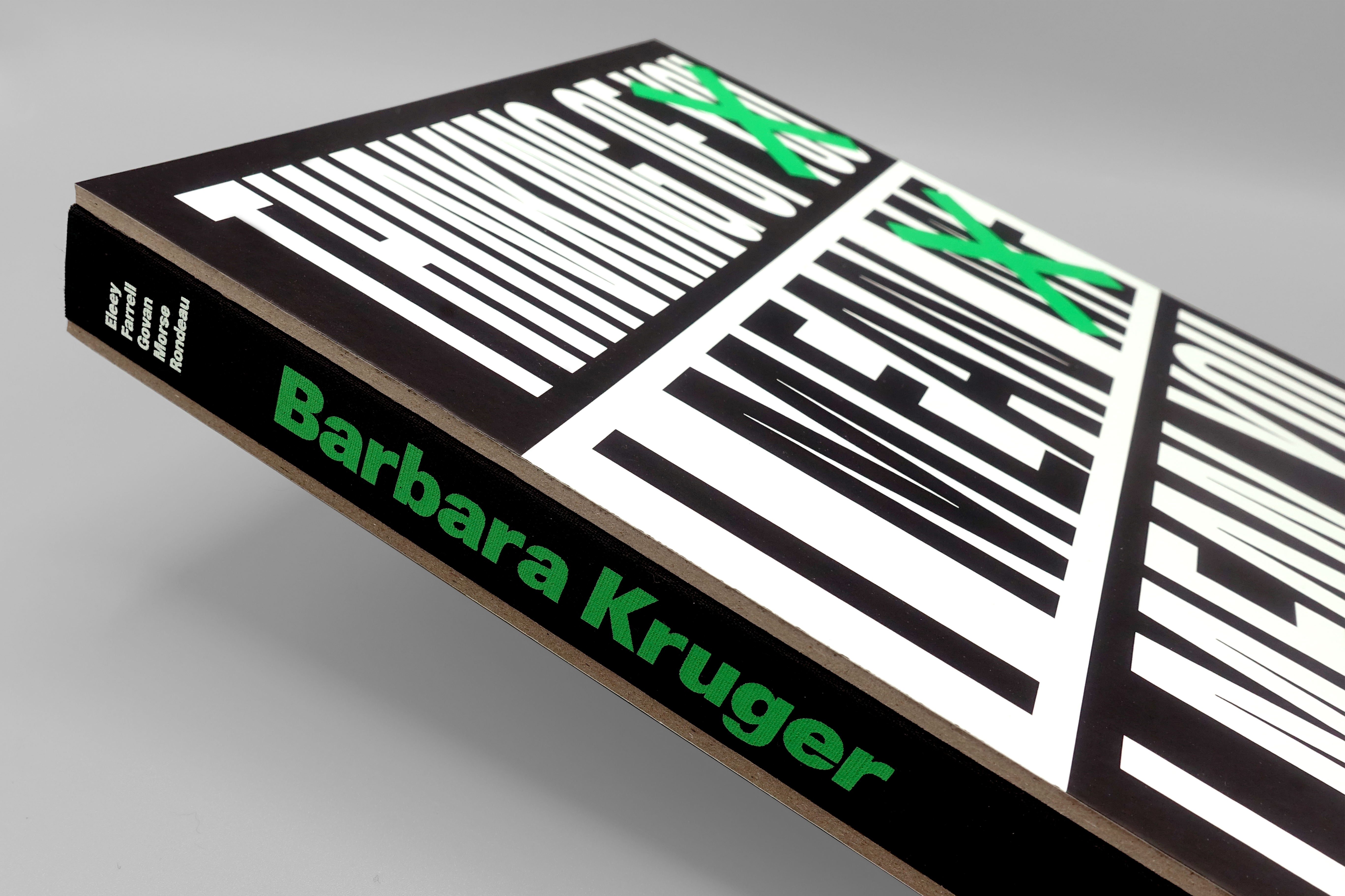 Thinking of You. I Mean Me. I Mean You. showcases Kruger’s site-specific works as reconceived for each venue, and includes a section of reprinted texts drawn from her teaching curriculum. Designed by IN-FO.CO in close communication with Kruger, the book’s flush-trimmed boards, green-tinted page edges, and bold typography extend the visceral impact of the work itself. Created in 2020 amidst a vast array of political and public health unknowns, the publication includes up-to-the-minute images of Kruger’s public work in the world alongside the year’s widespread protests, as well as renderings (designed by IN-FO.CO using Kruger’s vector art and venue snapshots) that show future museum installations, framing the book and work within and beyond institutional settings.