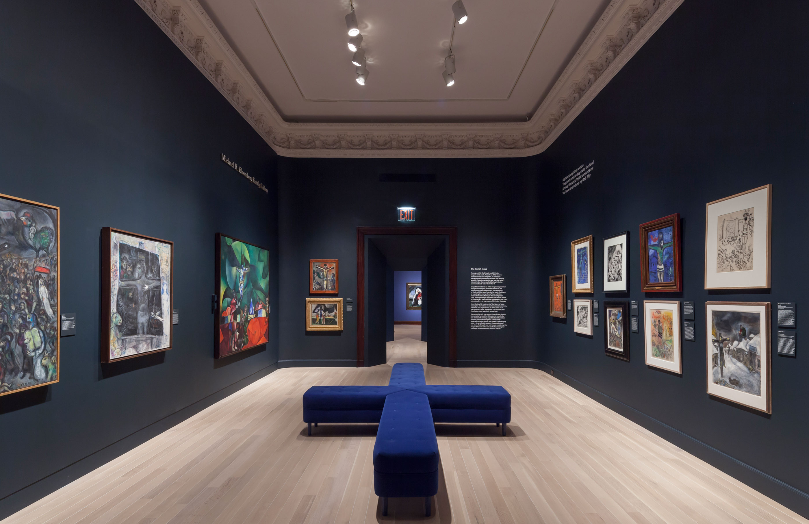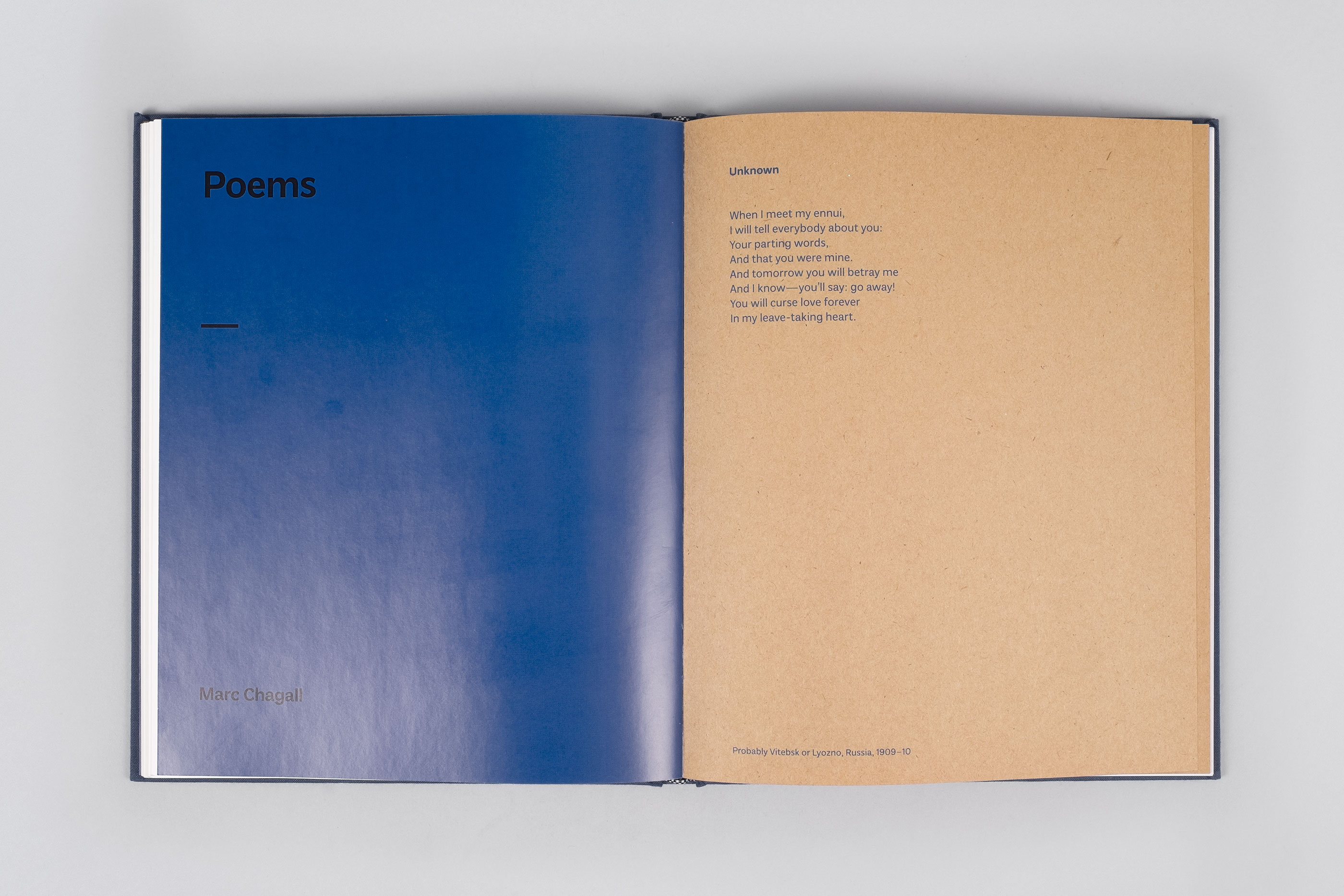 Chagall: Love, War and Exile, organized by Susan Tumarkin Goodman at The Jewish Museum, New York, examined Chagall’s work produced during his exile in Paris. The exhibition (with exhibition design by Galia Solomonoff) provided a fresh look at an underexamined period of his career. Fragments of Chagall’s poetry accompanied the artworks, which were hung in galleries each painted a different shade of blue, creating a new textual lens through which to read the paintings’ development over time. In the catalogue this rarely seen poetry by Chagall is printed on kraft paper and interspersed throughout the book, providing a warmth that complements the bold color of the work.