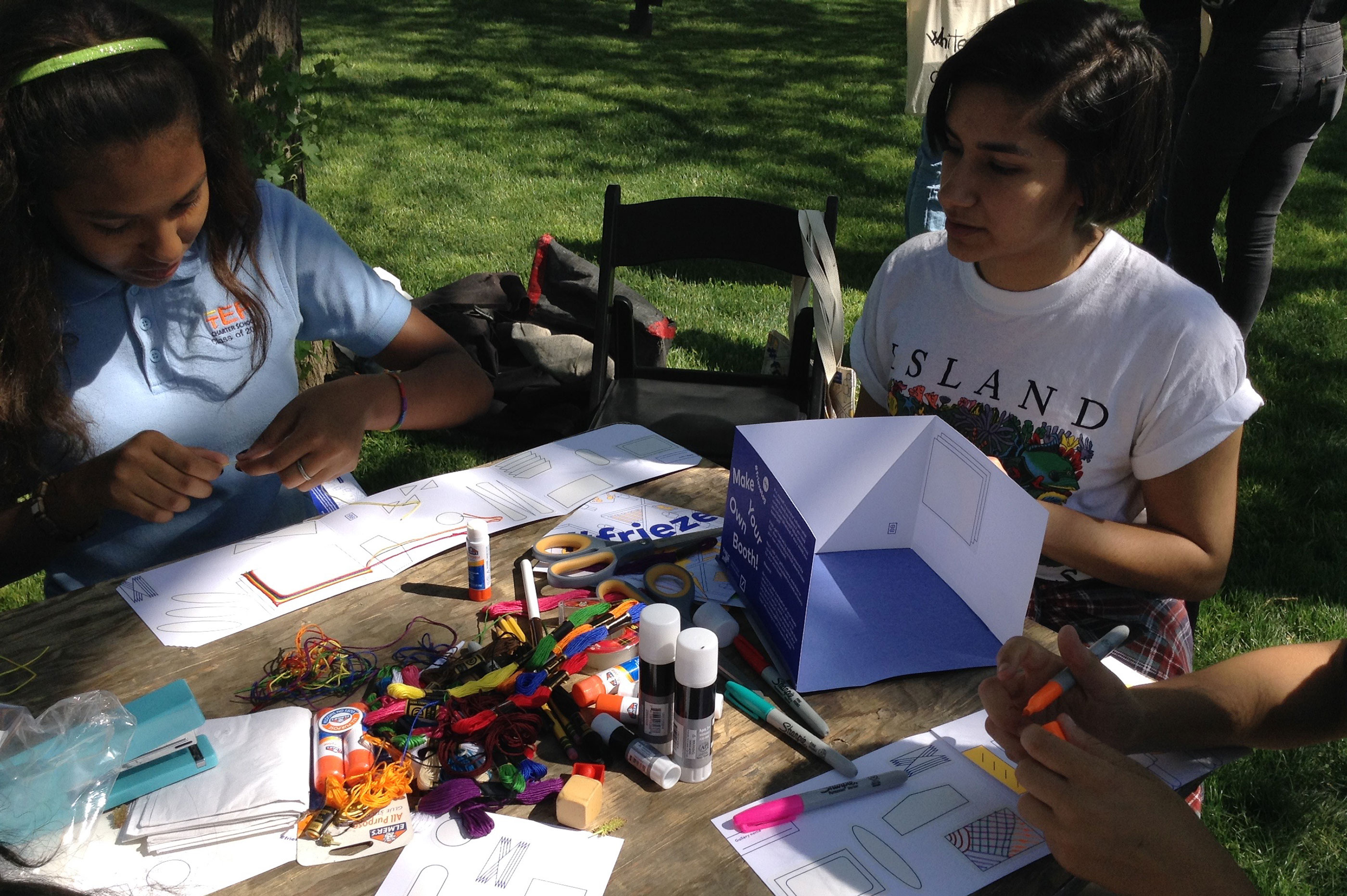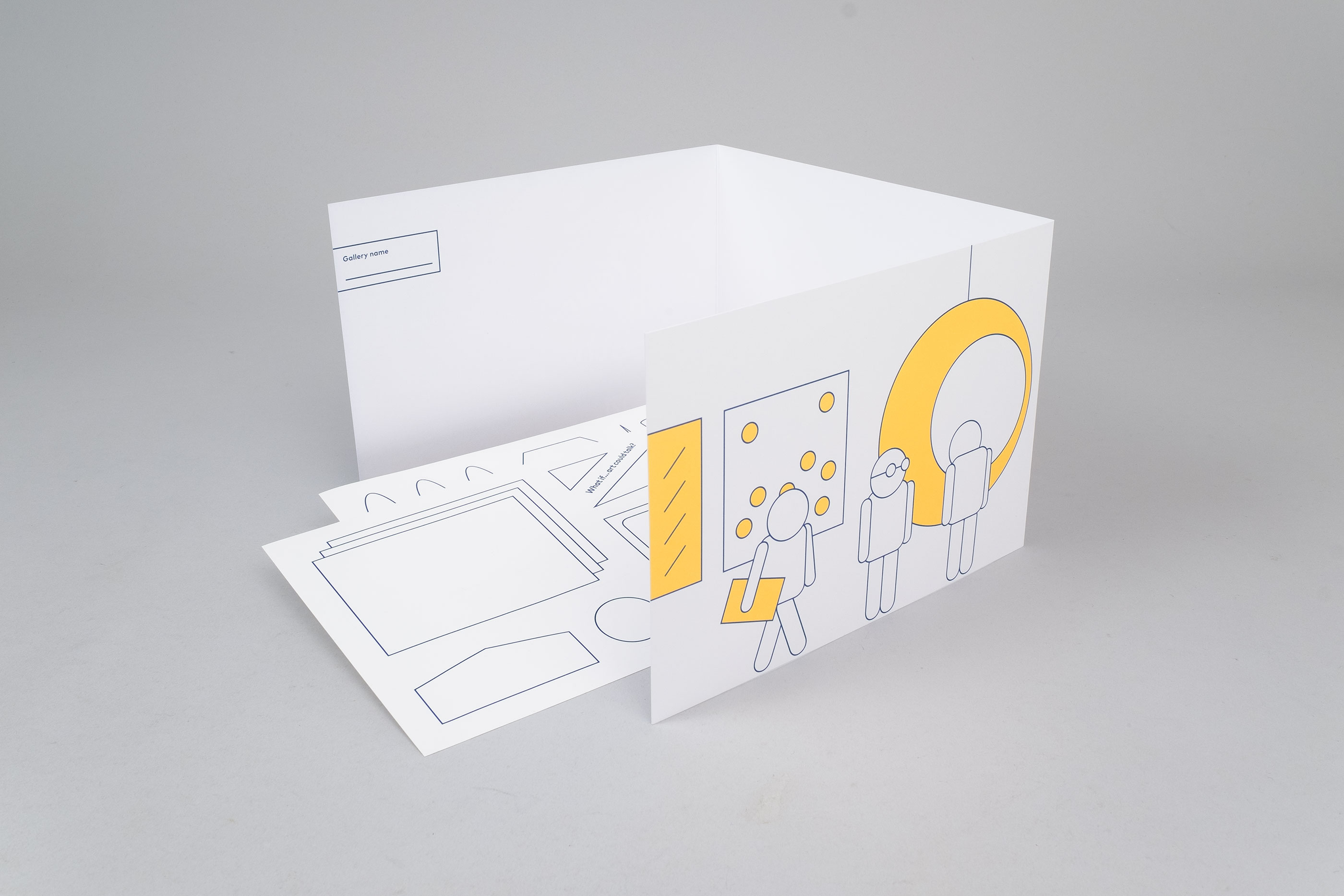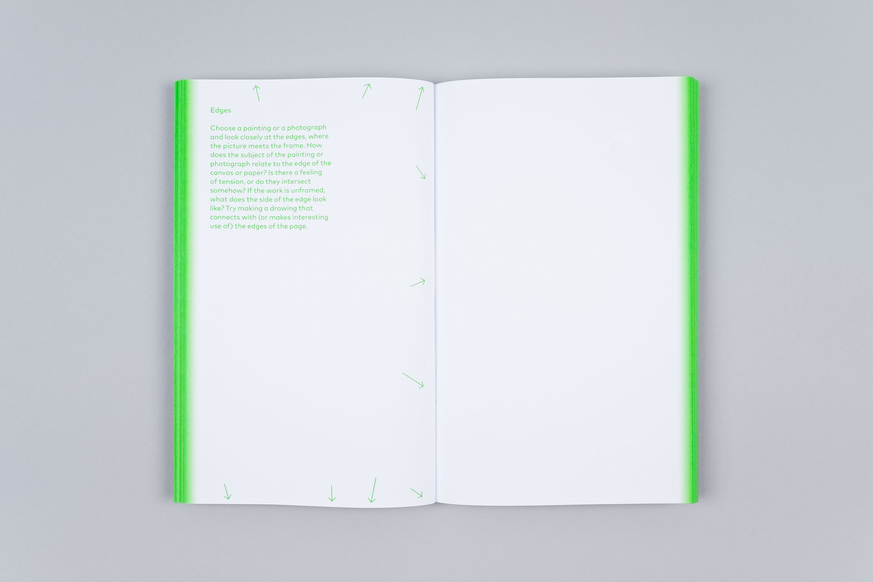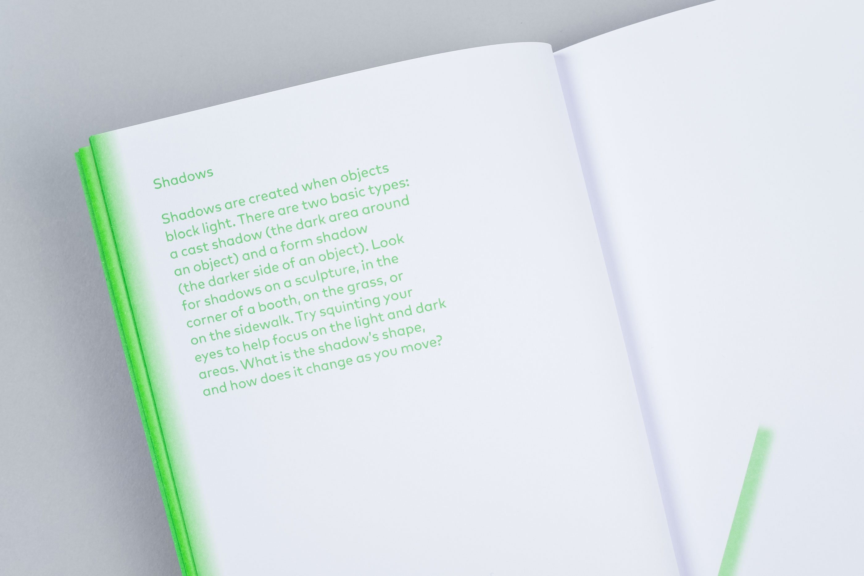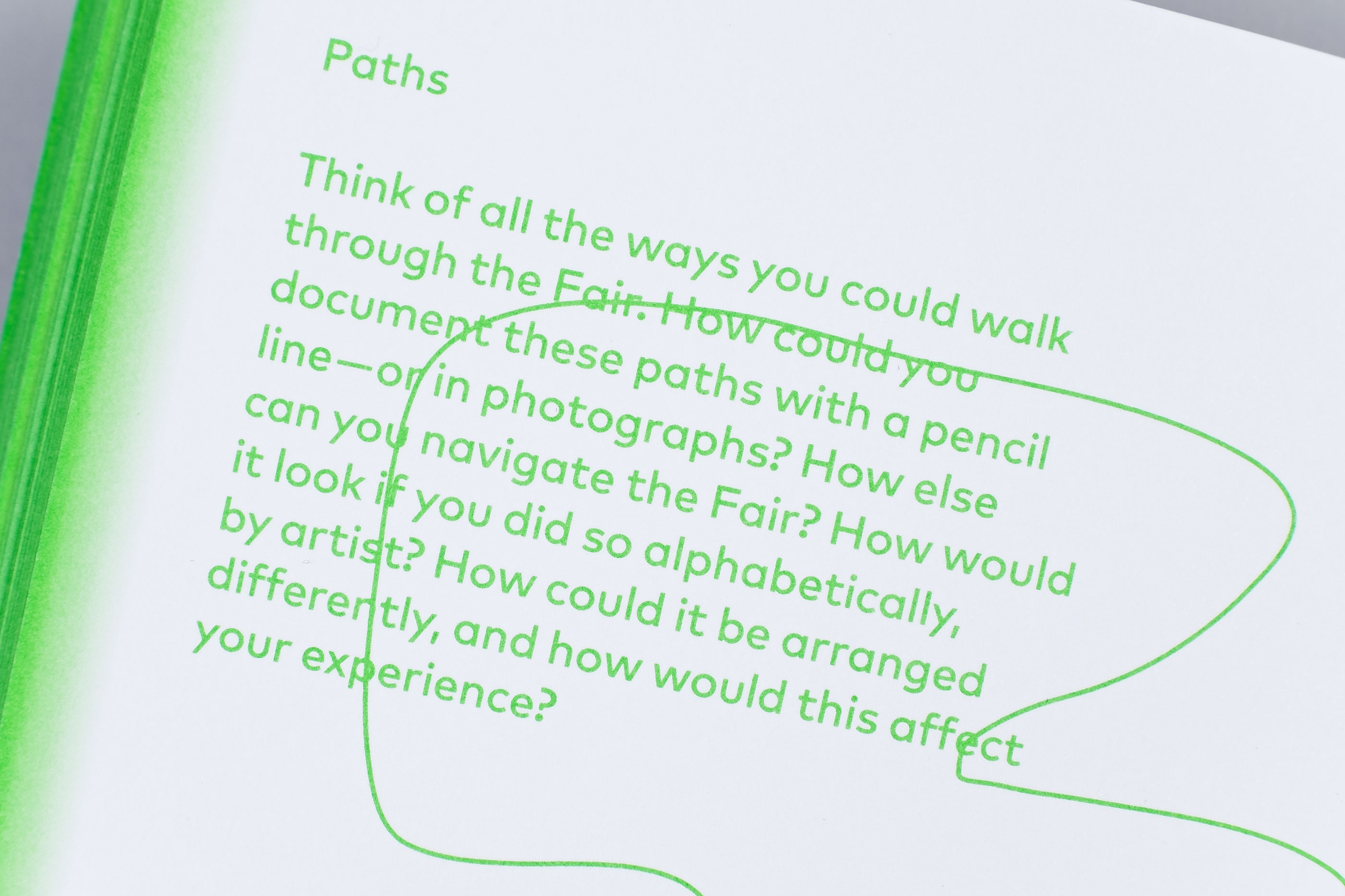 The 2016 guide functions as a notebook that can be used by young people during and after the art fair. It comprises fifteen exercises that encourage fair participants to engage their “seeing muscles” by prompting them to consider negative space, framing, reflection, and shadows, both at the fair and beyond. The Guide also includes a “viewfinder,” expressed as die-cut holes on the book’s front and back covers, suggestions for further reading; a map of other youth-friendly cultural institutions in New York; and coloring book pages with designs by artists Jonas Wood, Kenny Scharf, and Saya Woolfalk.