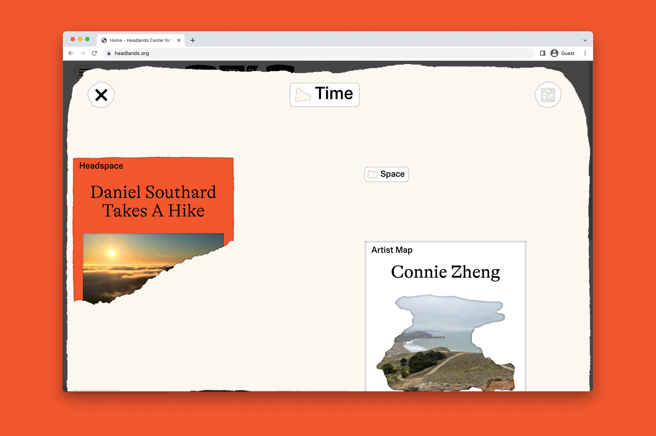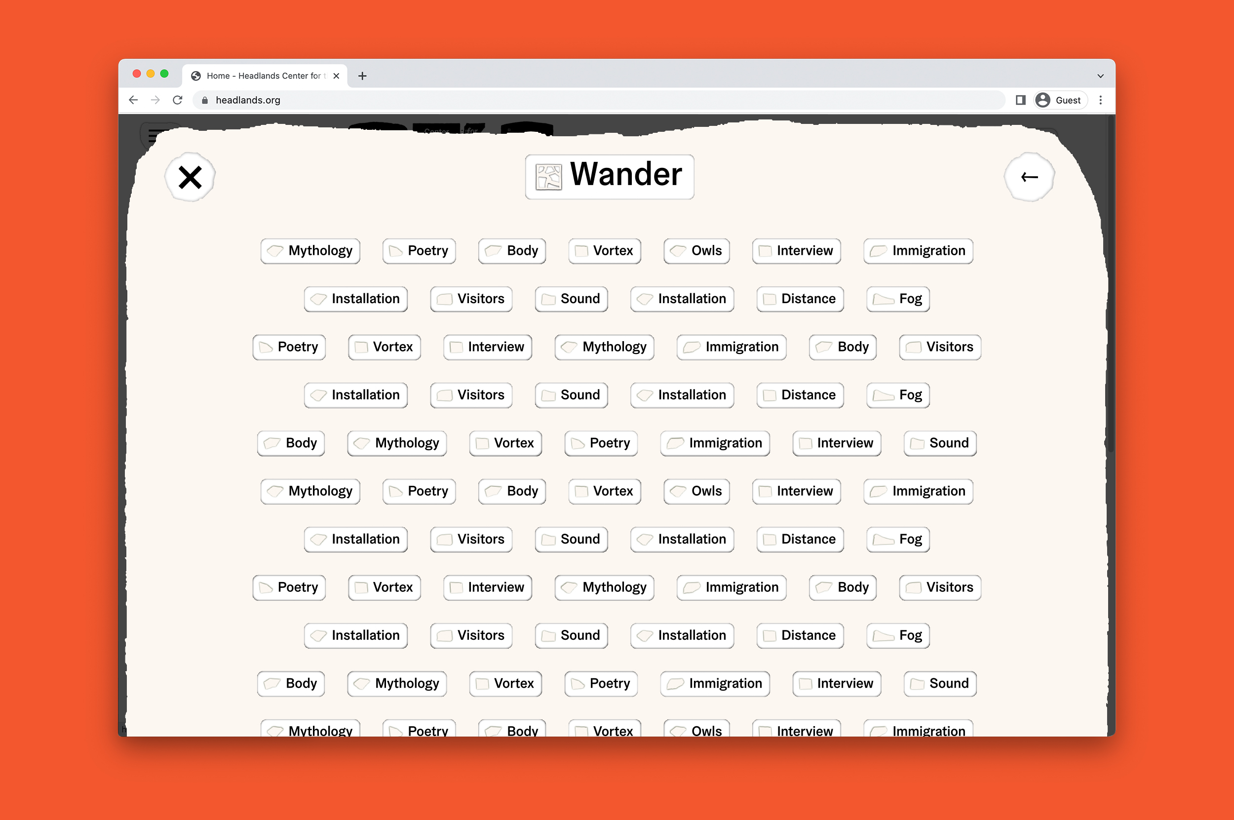 The new website presents Headlands as a hub for creativity. Designed as both an archive and growing resource for past, current, and future residents, it invites visitors to explore connections through the Wander tab, an interactive feature that allows visitors to meander the site via topics ranging from cooking to climate change, fog to mythology, owls to the color blue.
