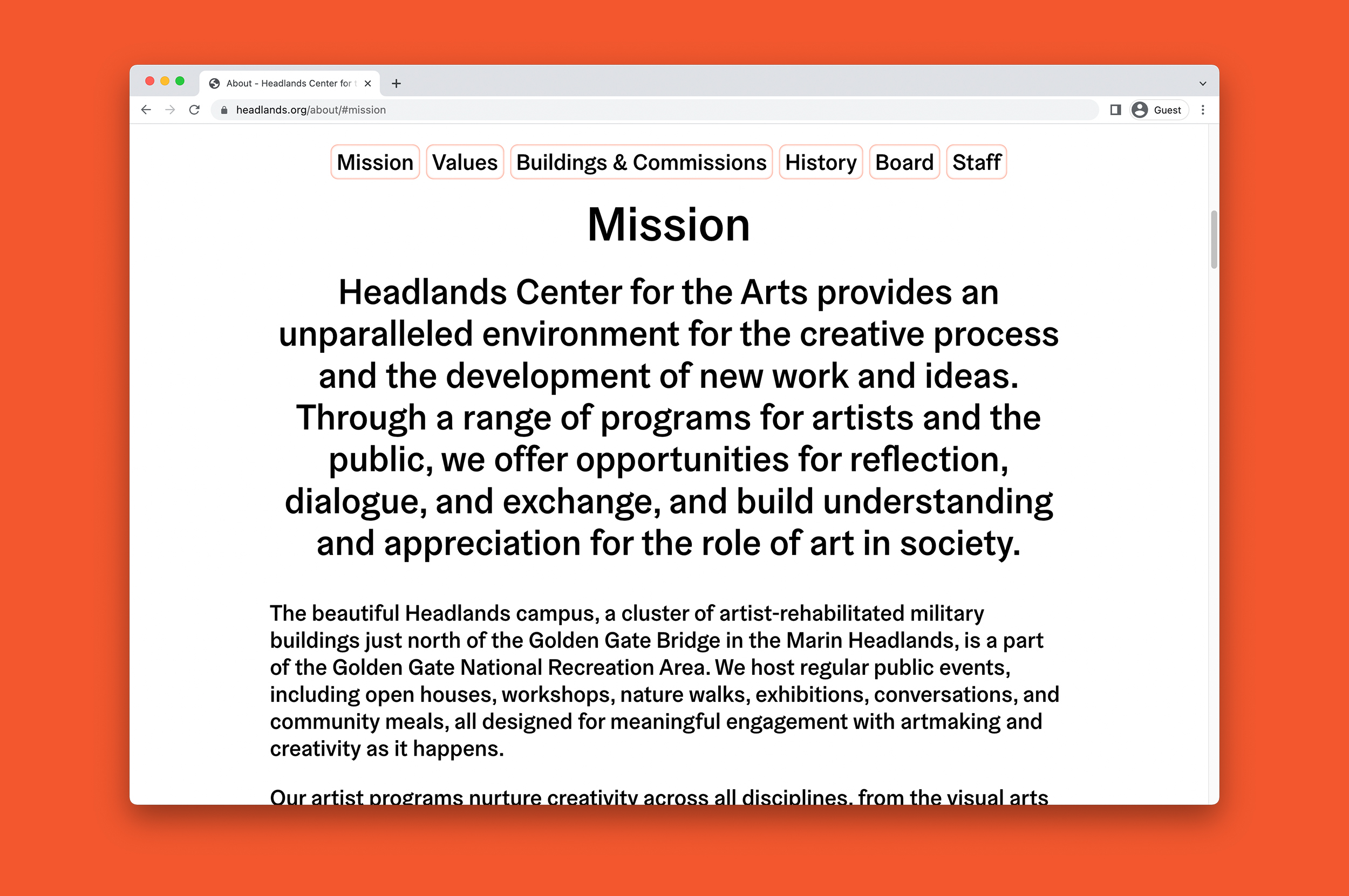 The new identity and website for Headlands Center for the Arts captures the uniquely immersive experience of visiting Headlands, an organization focused on fostering innovative contemporary art and artists, sited within Marin County.