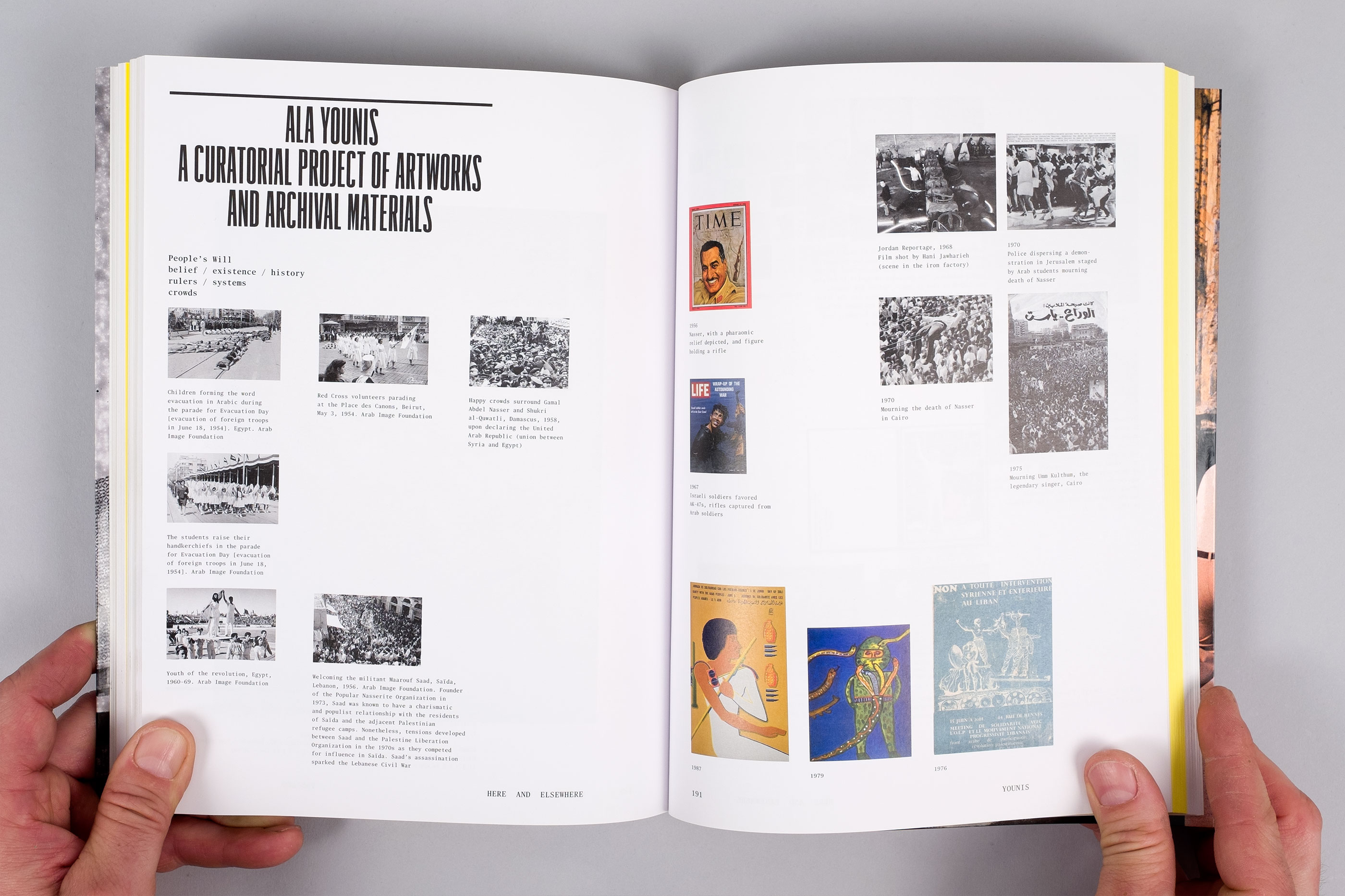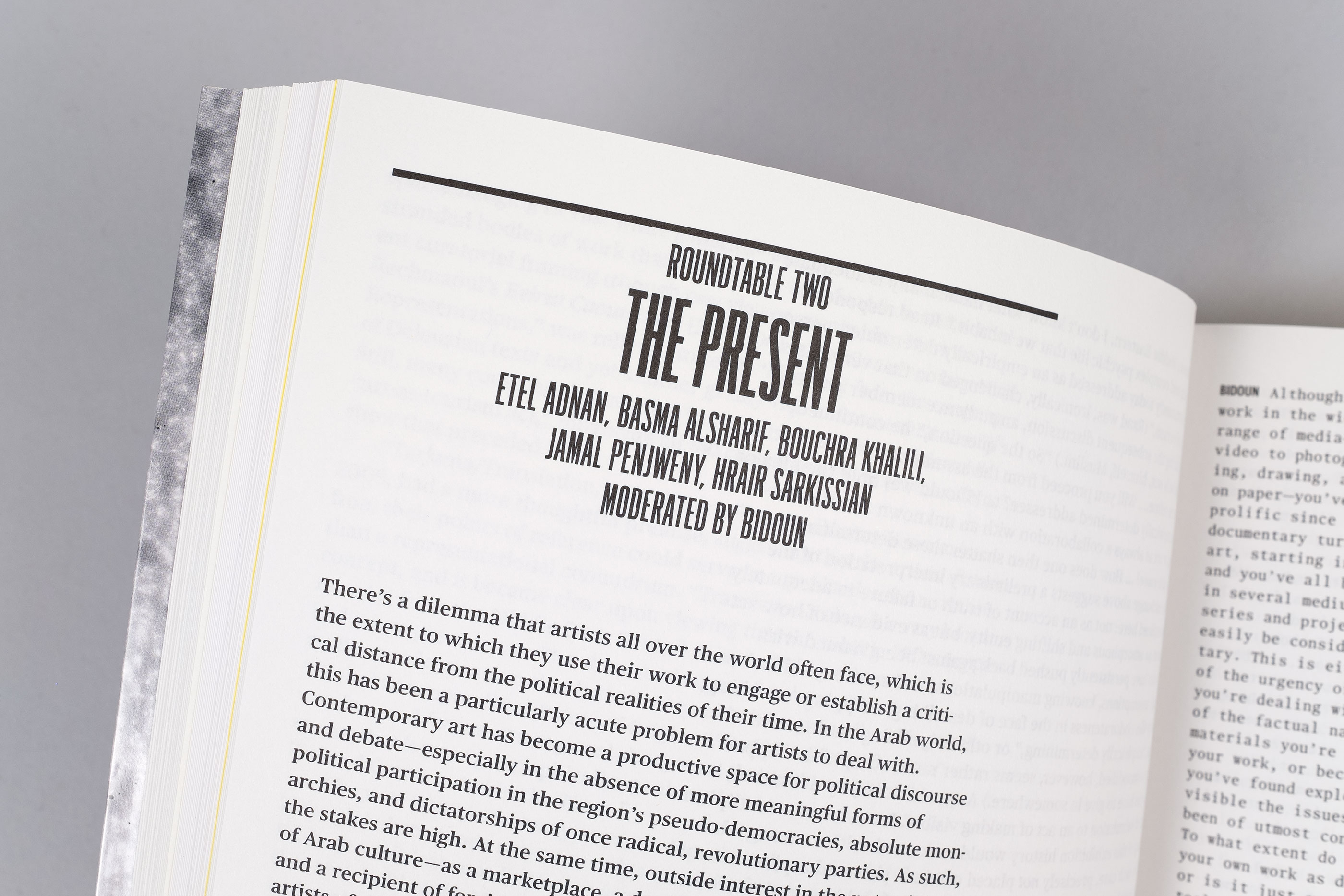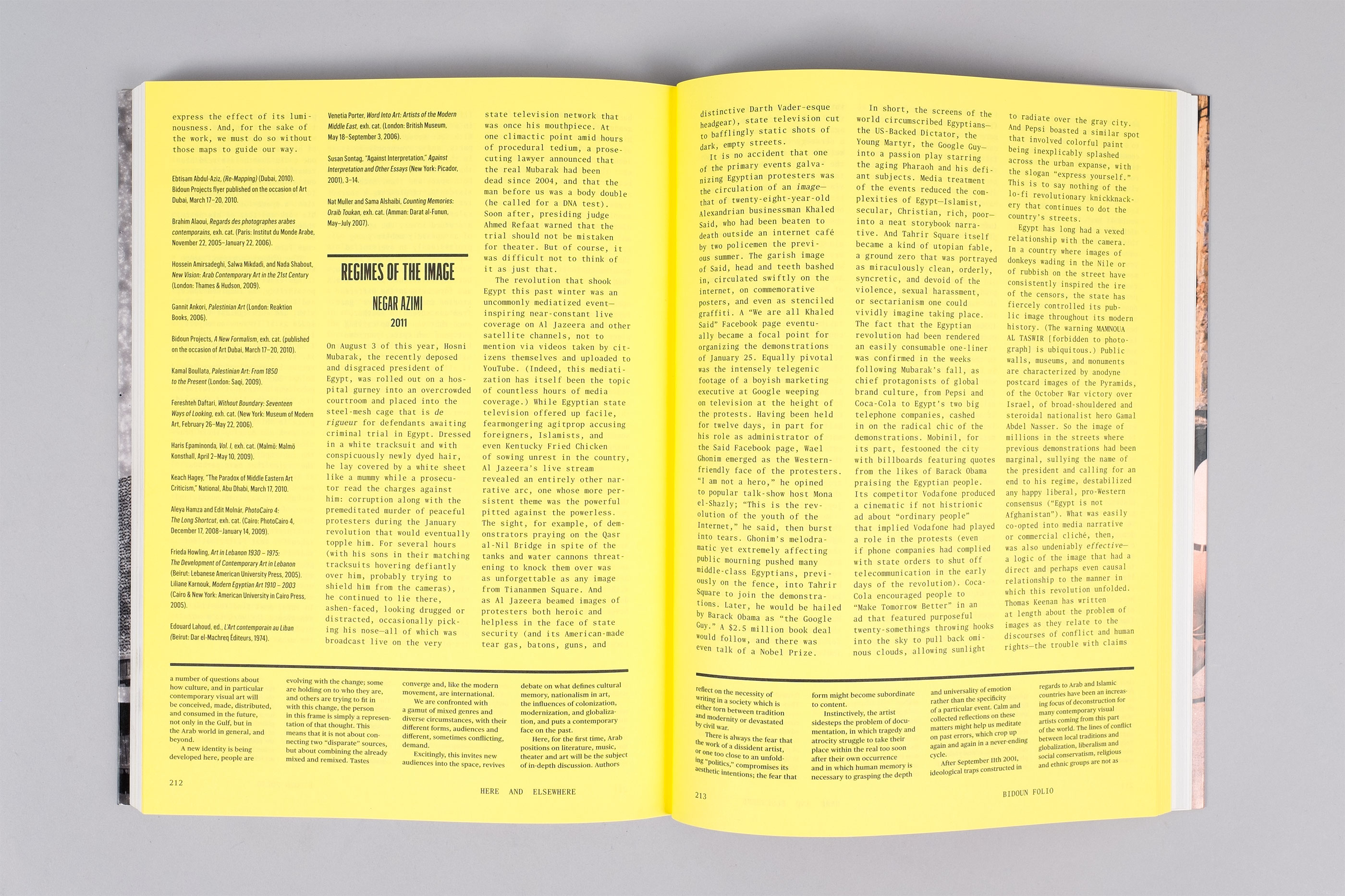 A major 2014 exhibition at the New Museum surveying contemporary art from the Arab world, Here and Elsewhere focused on the role of the artist in the face of the region’s social and political upheaval. The design conveys this sense of urgency and directness through bold typography and dynamic layouts. In addition to image spreads, the catalogue features a special section edited by Arab-world arts publication Bidoun, providing contextualizing resources for the exhibited work, including reference texts and transcripts of roundtable discussions.
