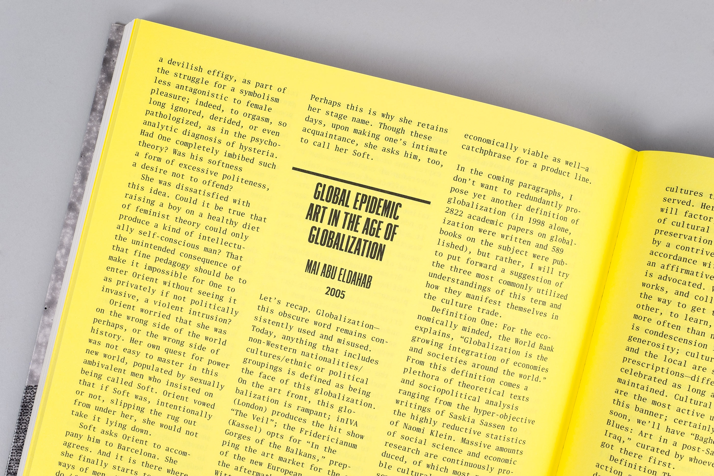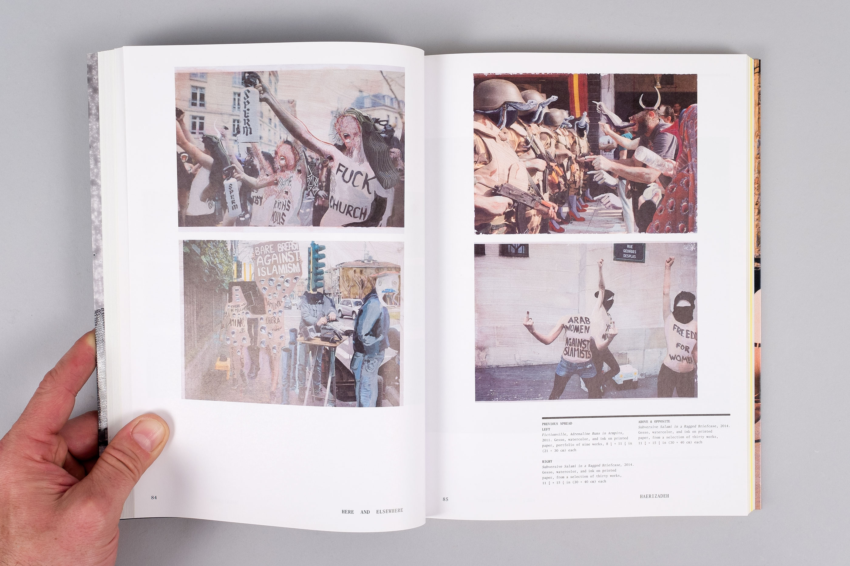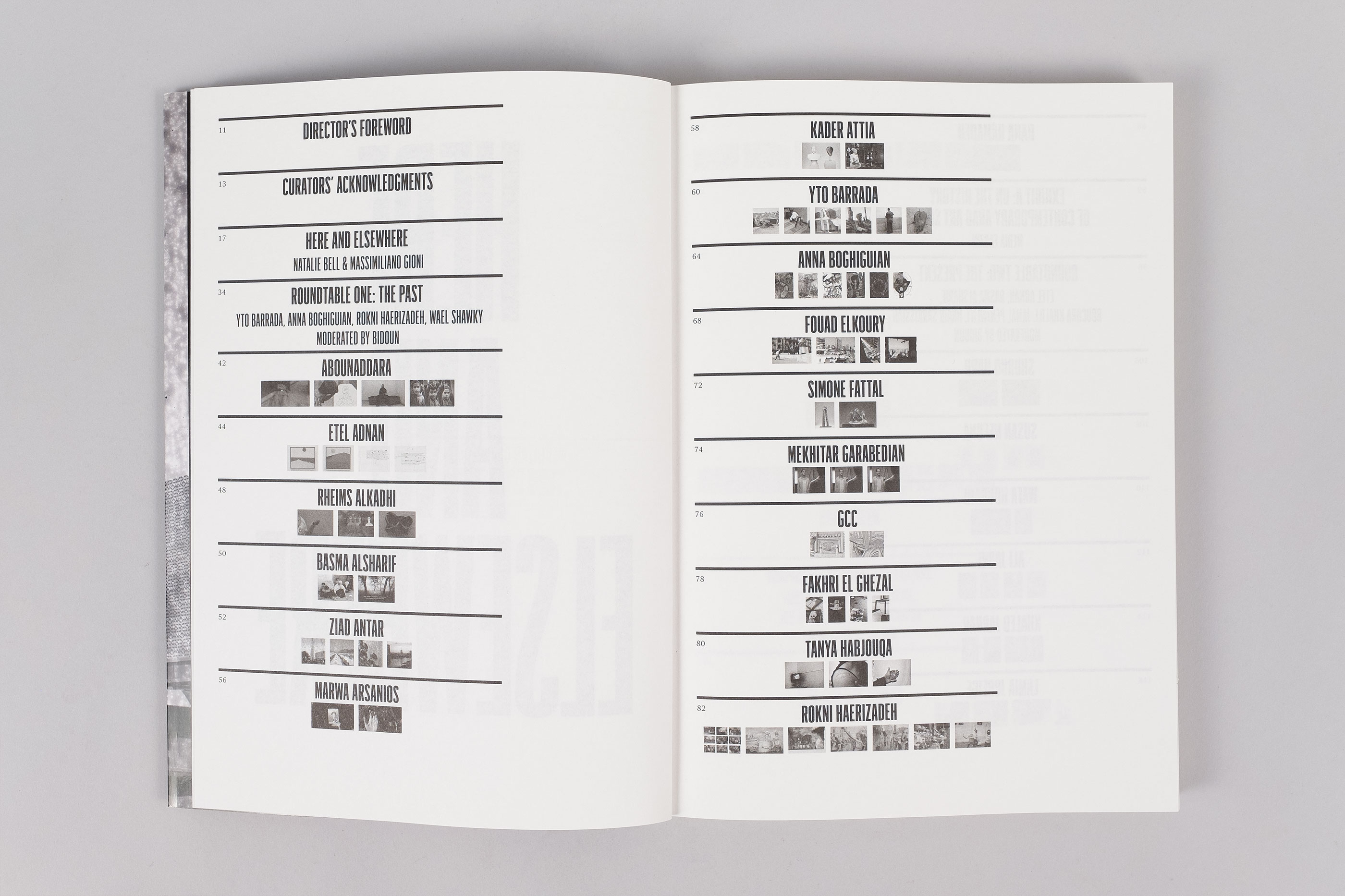 A major 2014 exhibition at the New Museum surveying contemporary art from the Arab world, Here and Elsewhere focused on the role of the artist in the face of the region’s social and political upheaval. The design conveys this sense of urgency and directness through bold typography and dynamic layouts. In addition to image spreads, the catalogue features a special section edited by Arab-world arts publication Bidoun, providing contextualizing resources for the exhibited work, including reference texts and transcripts of roundtable discussions.