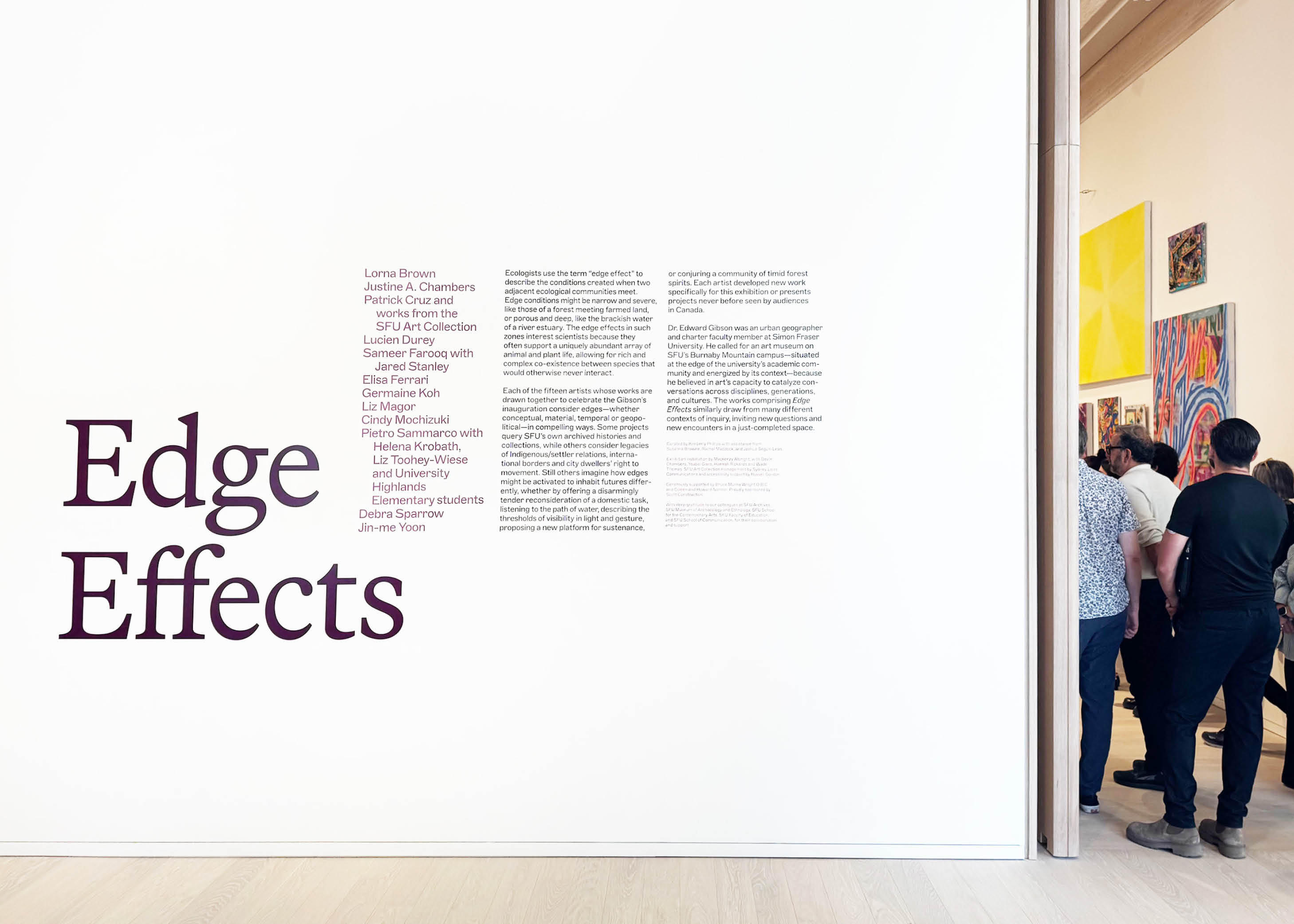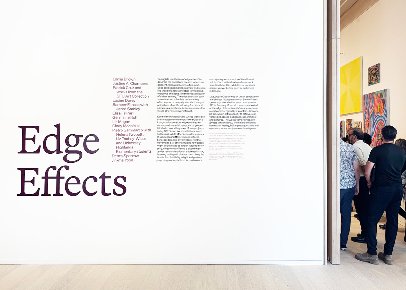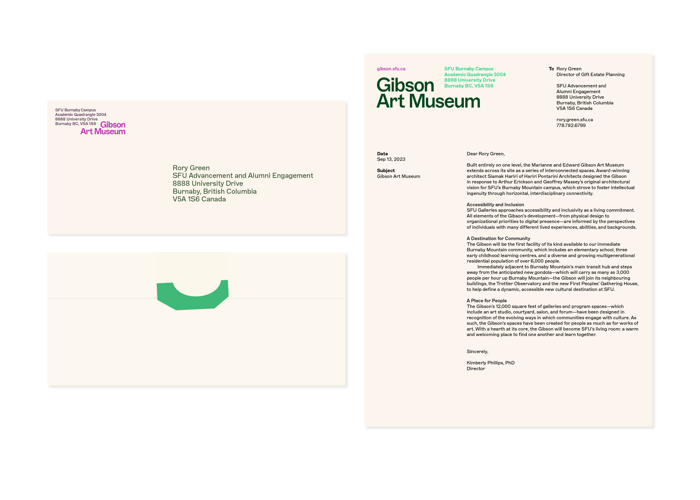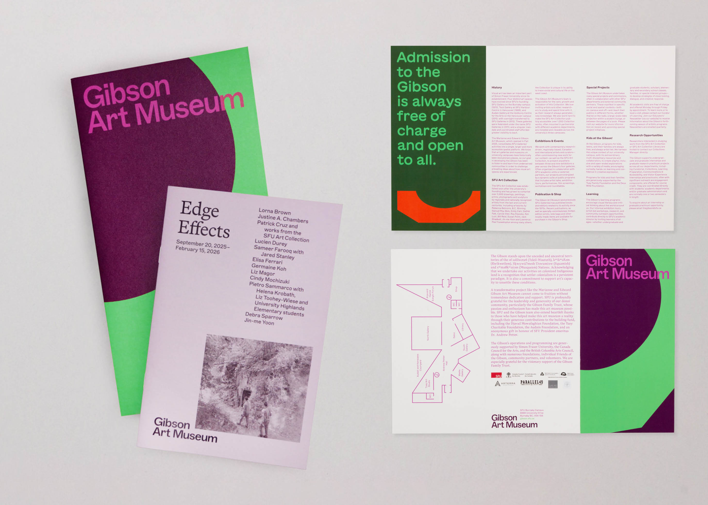The Marianne and Edward Gibson Art Museum is a new cultural space dedicated to inclusive learning and critical inquiry through the visual arts at Simon Fraser University. The Gibson Art Museum wordmark is typeset in Marfa by Dinamo, and set in a bottom-aligned configuration, providing a rooted stability, while texts, images, and other messaging are dynamically placed above the mark in a gesture of support and embrace. A secondary mark inspired by the building’s plan forms a bowl, an outstretched hand, or a water droplet, invites further interpretation. The overall inversion of typical institutional alignments—putting collaborators, images, and other messaging first—embodies the concept of making space for ideas, and holds space for collaboration and partnership above all.