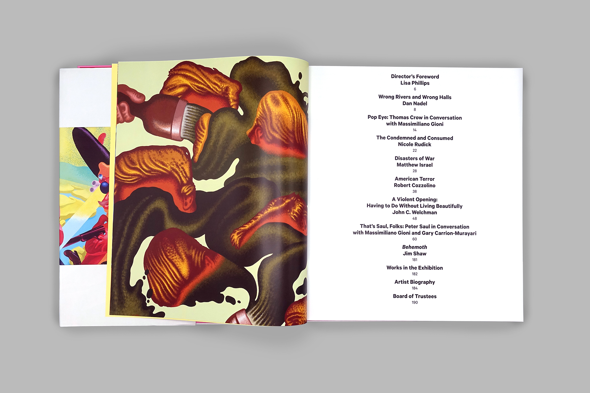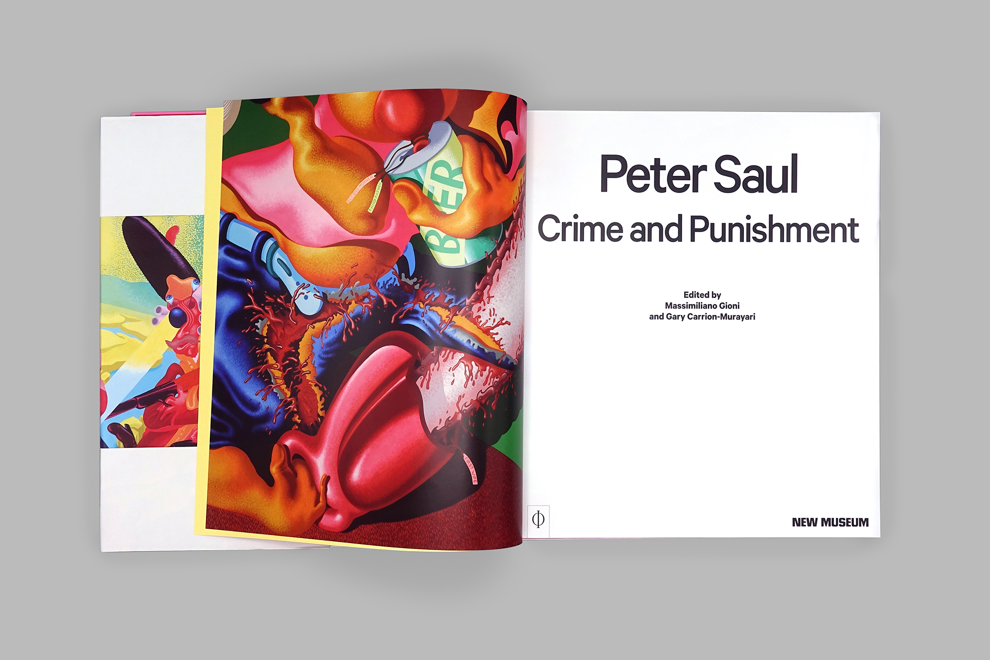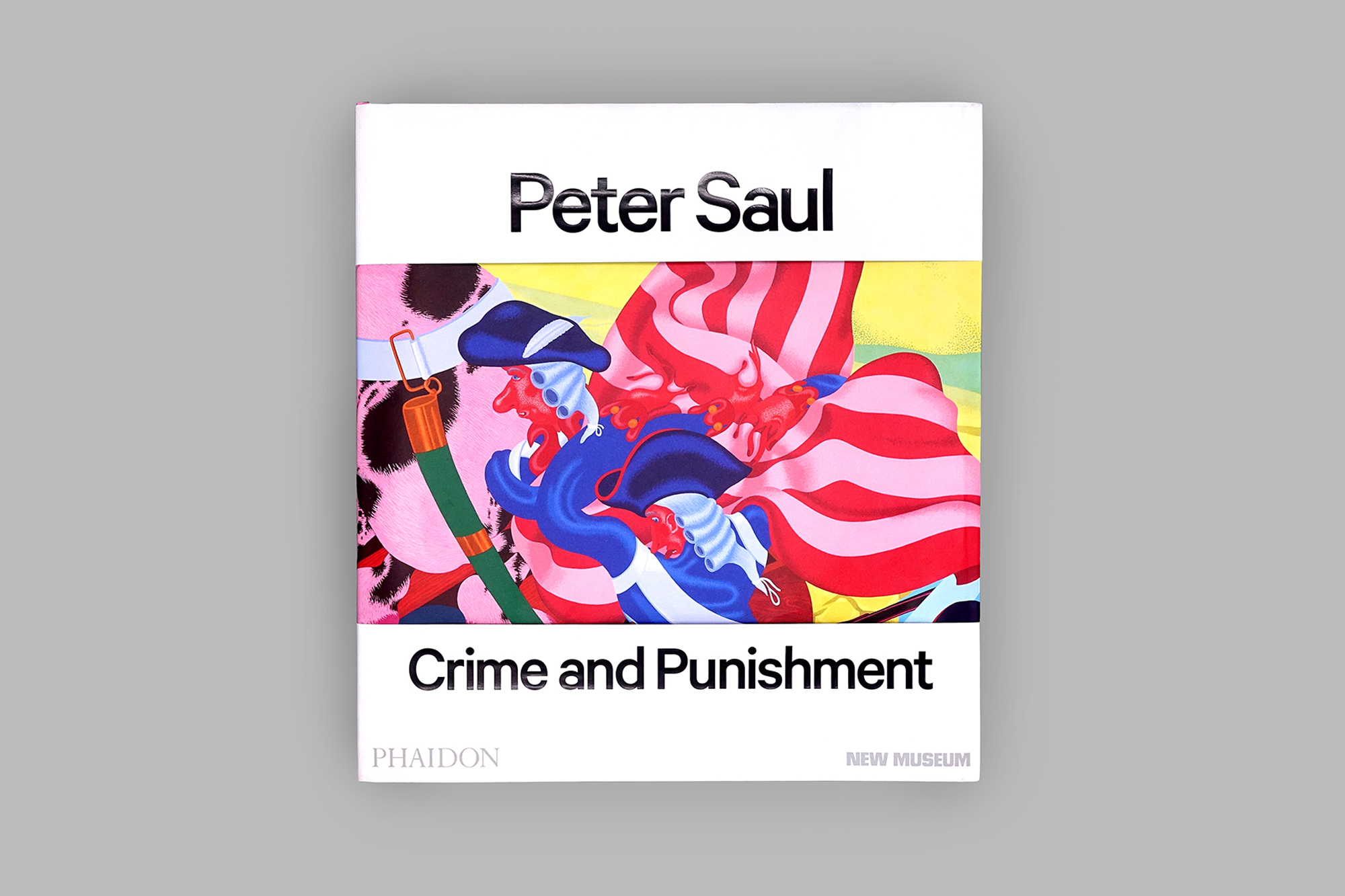Peter Saul: Crime and Punishment is a comprehensive monograph accompanying the artist’s first New York museum survey at the New Museum. The large format catalog is housed in a jacket that folds out to poster scale. Designed by IN-FO.CO, published by Phaidon and the New Museum, and edited by Massimiliano Gioni and Gary Carrion-Murayari, the volume also includes new written contributions from Robert Cozzolino, Matthew Israel, Dan Nadel, Nicole Rudick, and John C. Welchman, and interviews with Peter Saul and Thomas Crow.