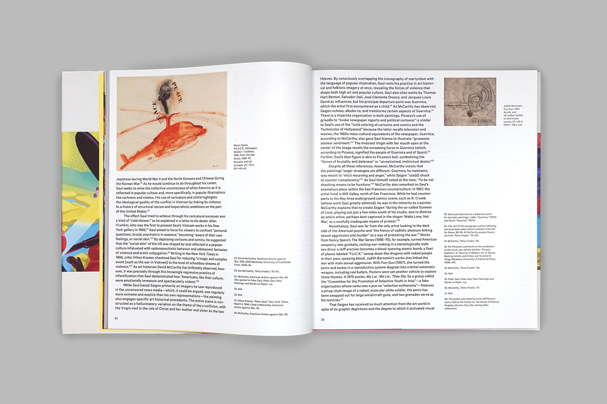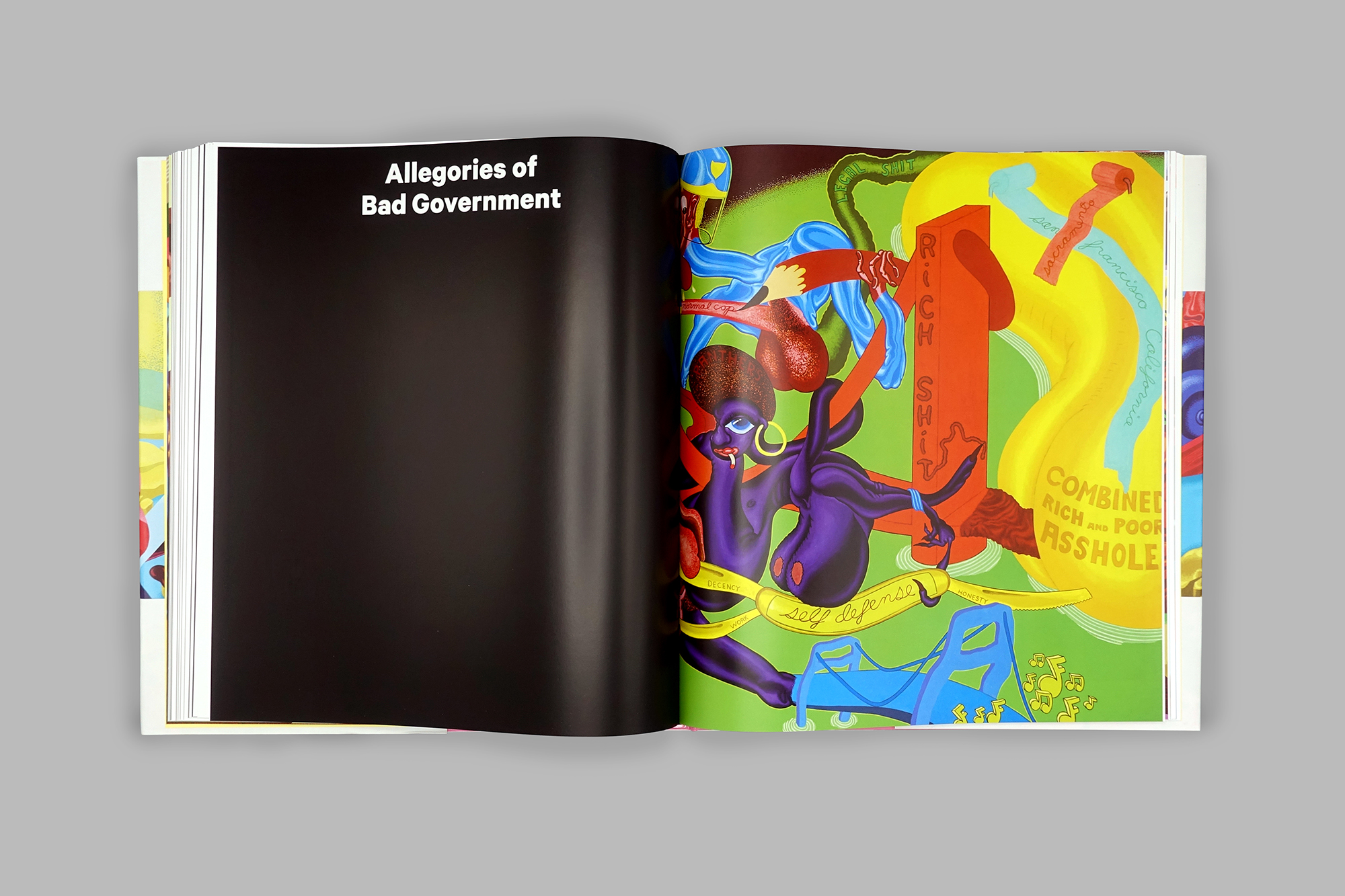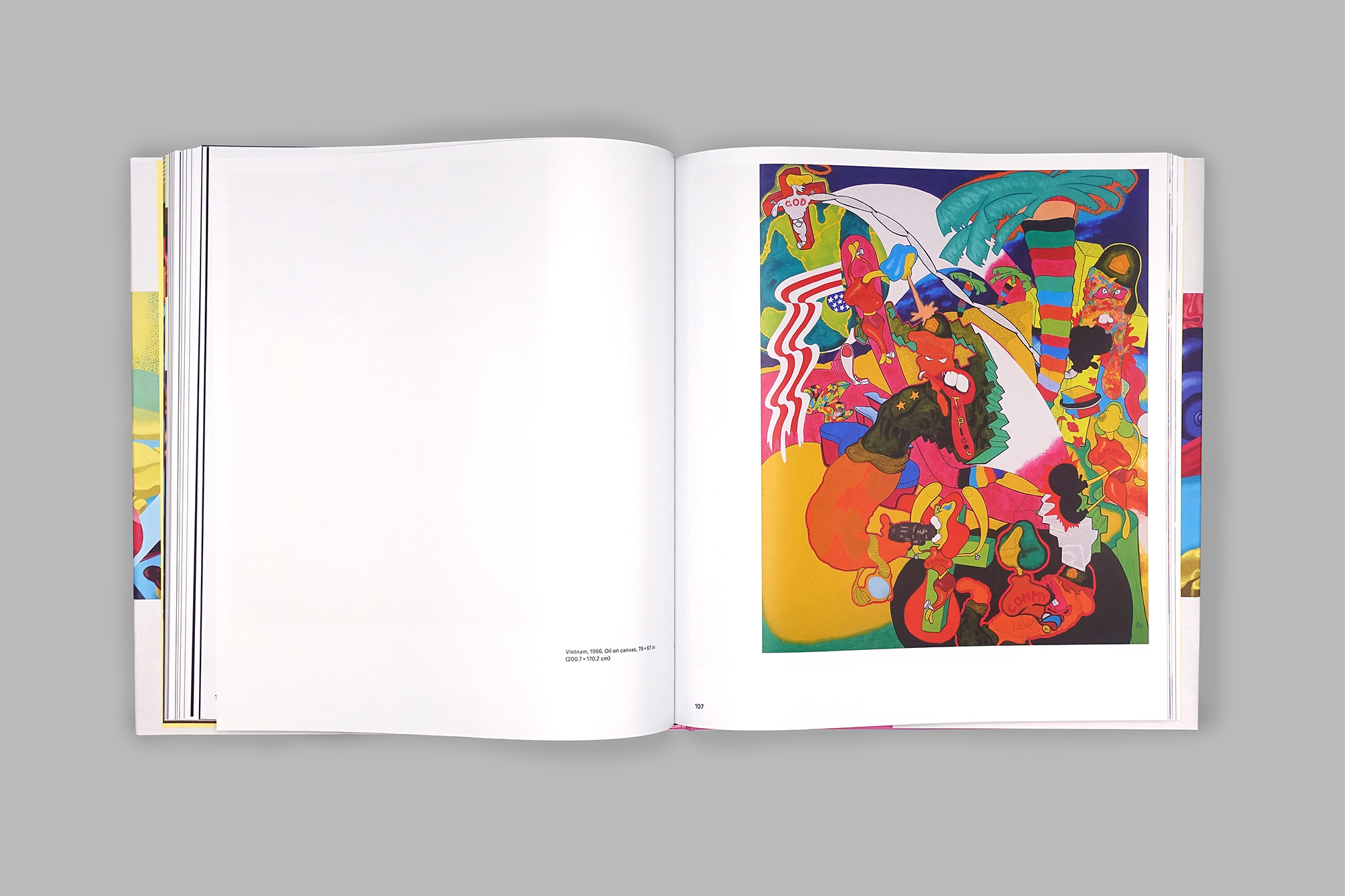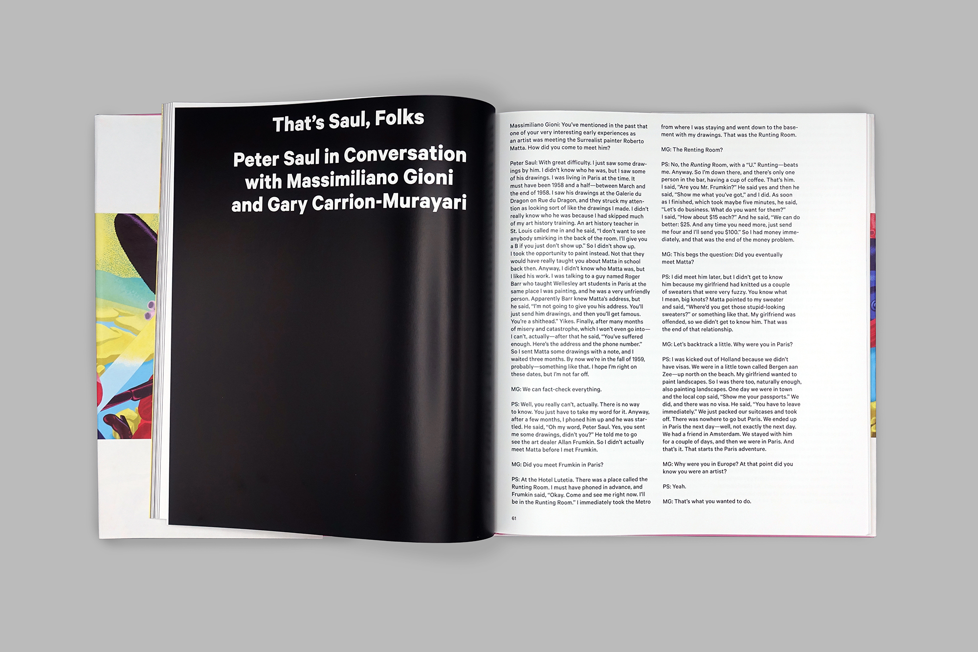 Peter Saul: Crime and Punishment is a comprehensive monograph accompanying the artist’s first New York museum survey at the New Museum. The large format catalog is housed in a jacket that folds out to poster scale. Designed by IN-FO.CO, published by Phaidon and the New Museum, and edited by Massimiliano Gioni and Gary Carrion-Murayari, the volume also includes new written contributions from Robert Cozzolino, Matthew Israel, Dan Nadel, Nicole Rudick, and John C. Welchman, and interviews with Peter Saul and Thomas Crow.