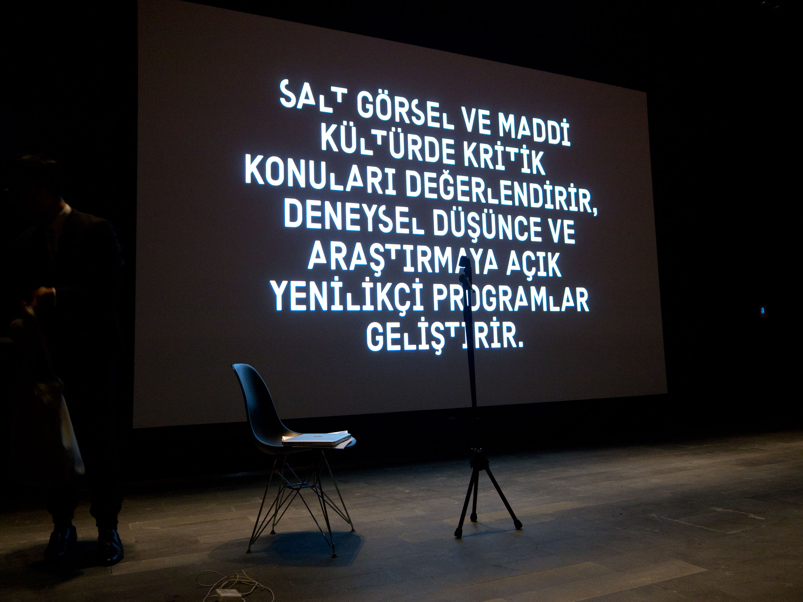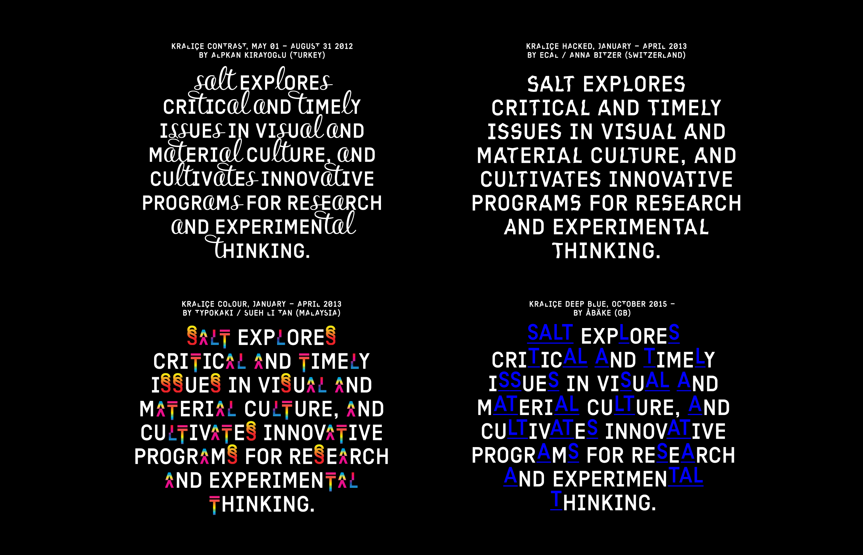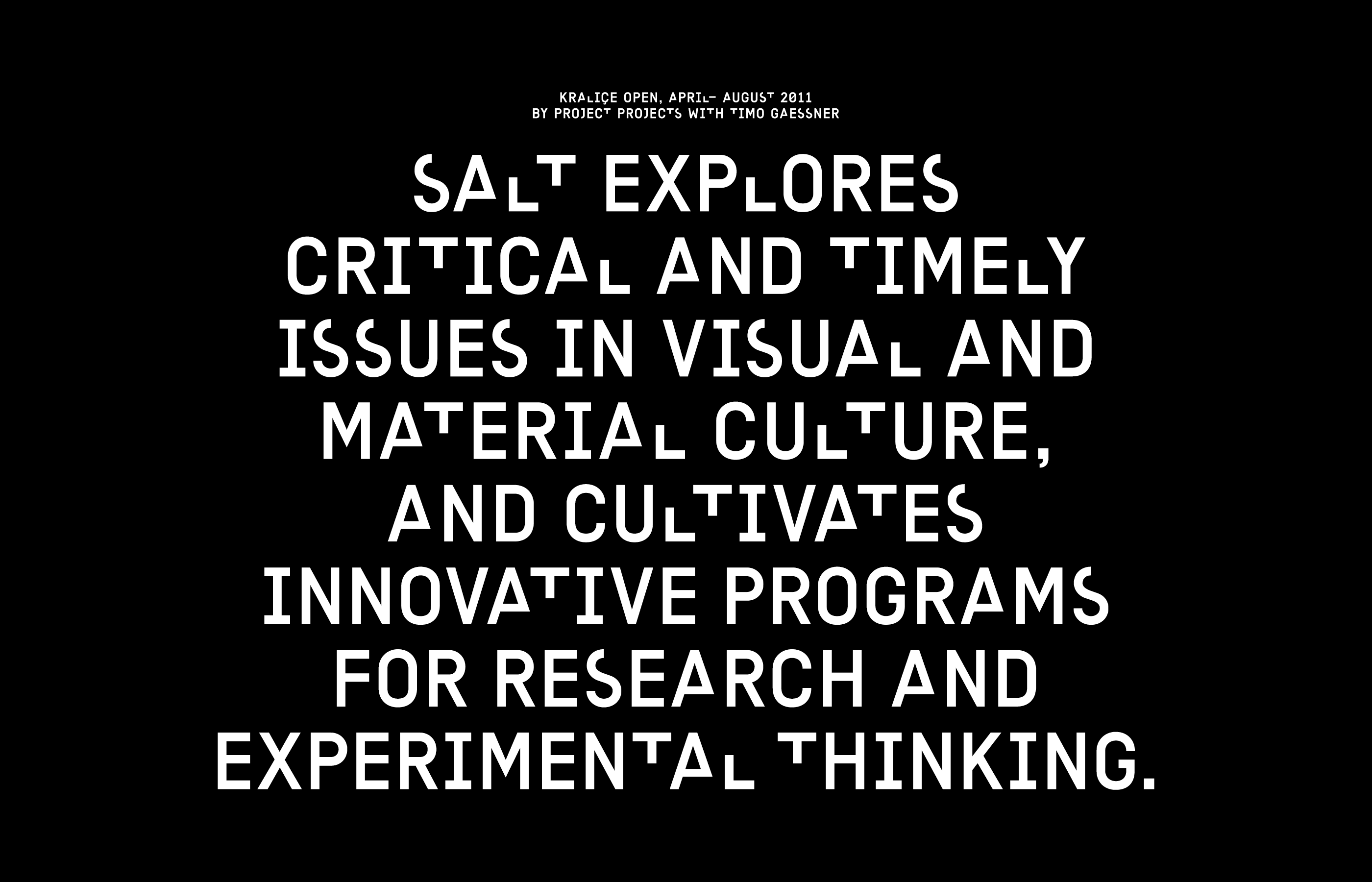 The institution’s name has a unique position within the identity system. The letters S-A-L-T are not represented as a formal logo mark; instead, they are embedded within a custom-designed typeface, Kraliçe, which was created by type designer Timo Gaessner for Project Projects. With this typeface, the institution strategically disperses its name within the language it uses everyday.