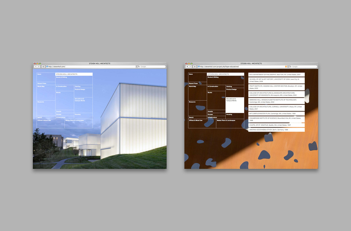The graphic identity and website for Steven Holl Architects features detailed typography and rich photography which draws focus to the phenomenological experience of Holl’s architecture.