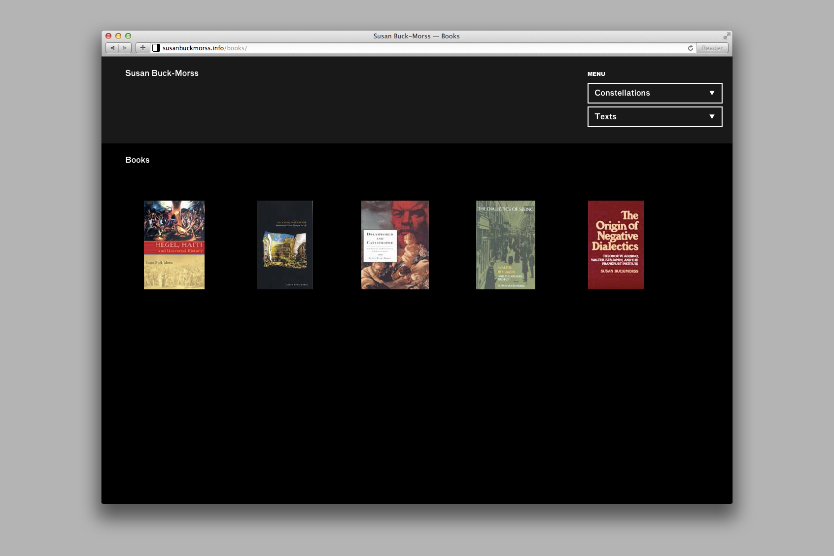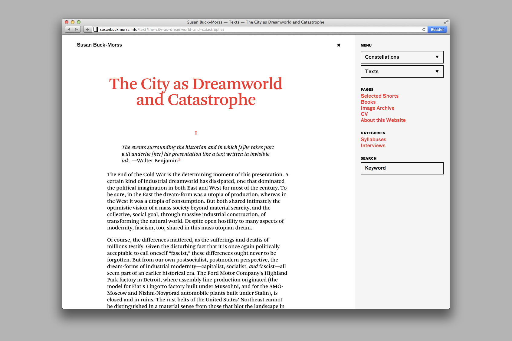 The work of professor and political philosopher Susan Buck-Morss employs Walter Benjamin’s broad theory of the image as a methodology of research and exploration. Taking these ideas as guiding principles, the website serves as a distinct archive and platform for the development of her ongoing work.