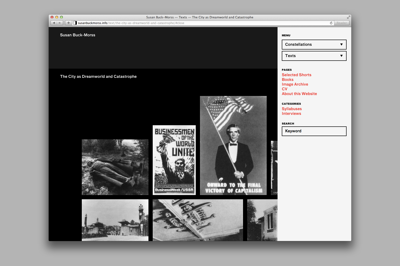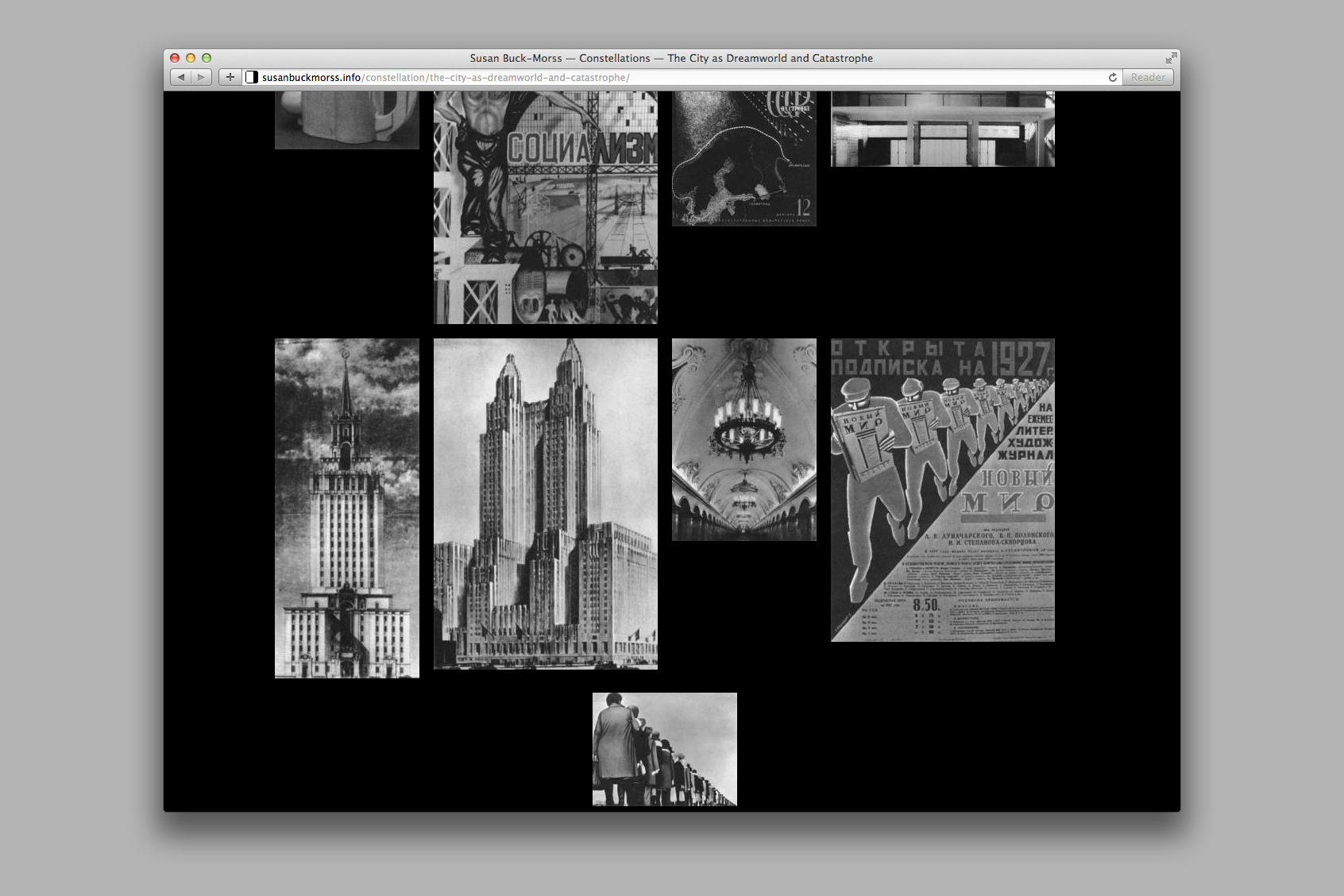Two main axes comprise the backbone of the site. Buck-Morss’ constellations of selected images frame a spatial and associative navigation, while her texts follow a more traditional, linear structure. These two axes are then hyperlinked: clicking an image within a constellation scrolls the page to its position within the corresponding text, and closing a text panel brings the corresponding constellation back to the fore.