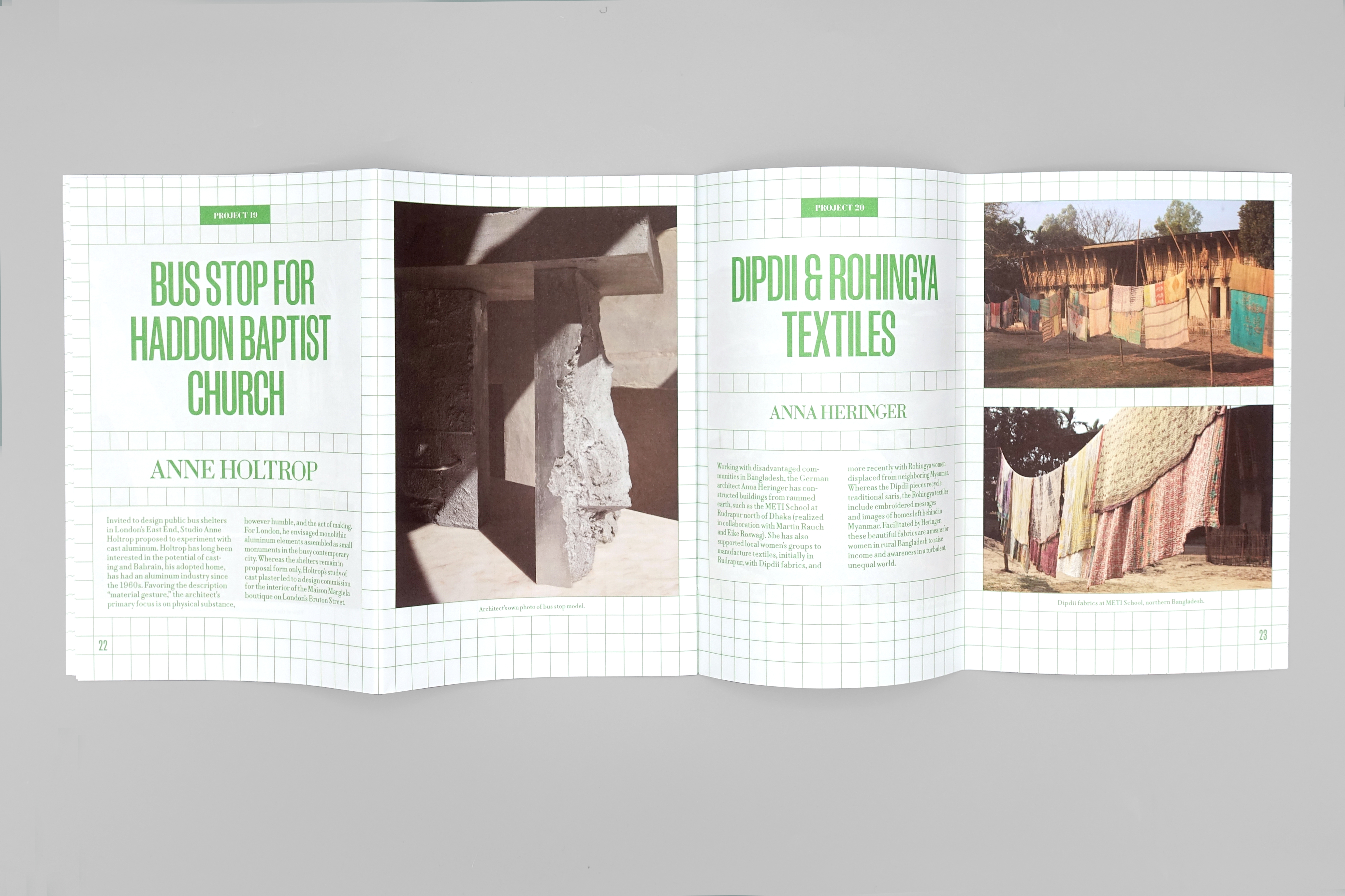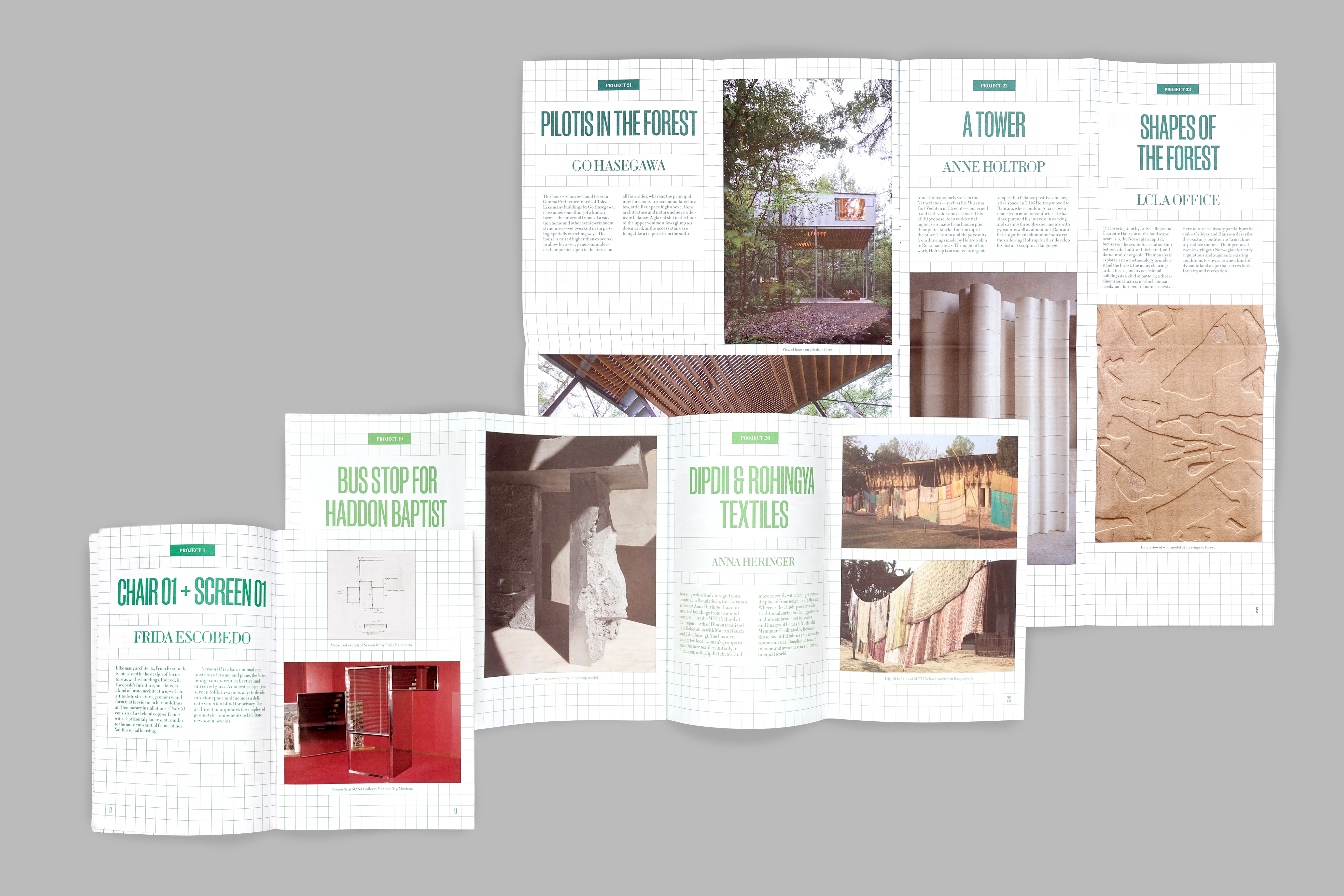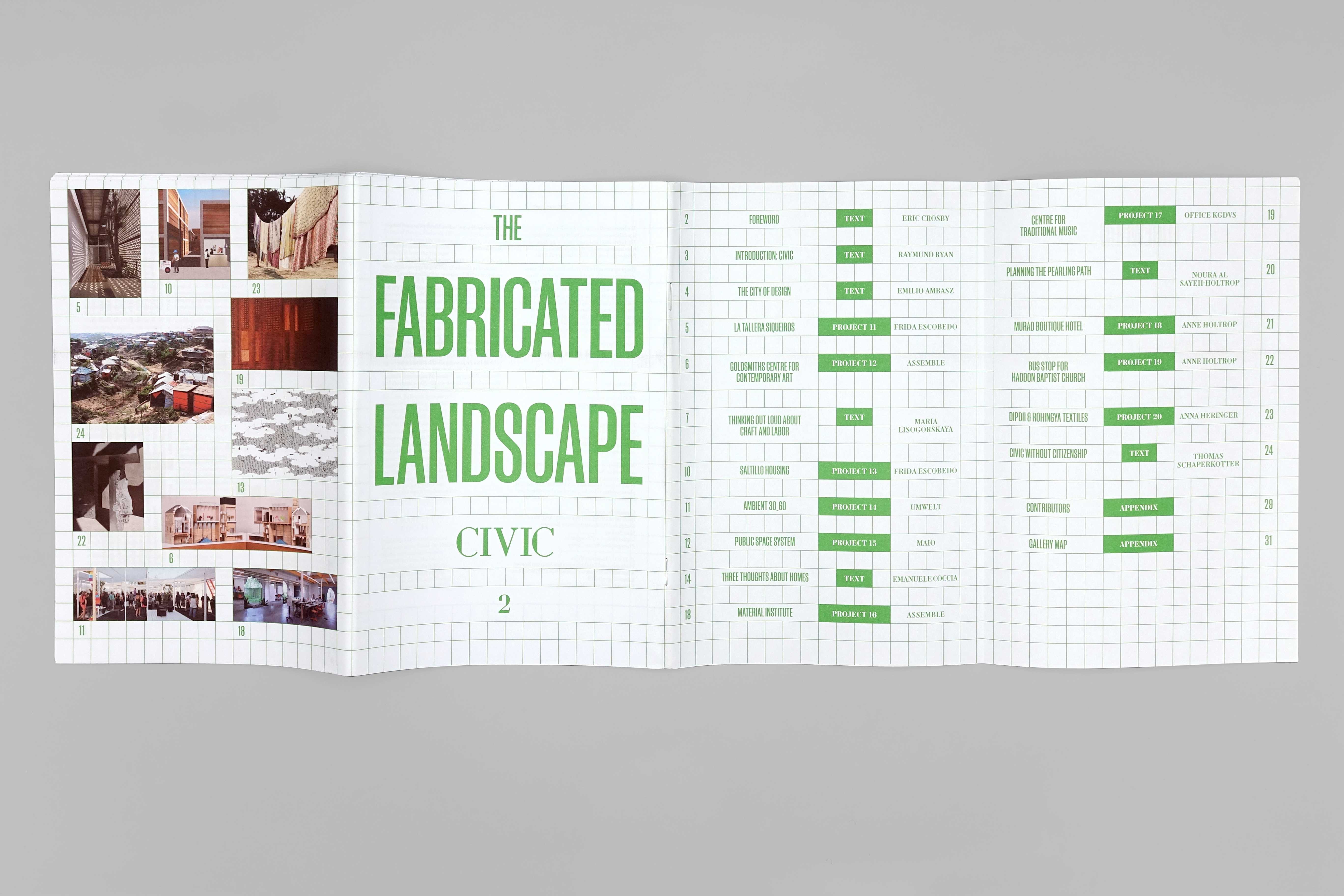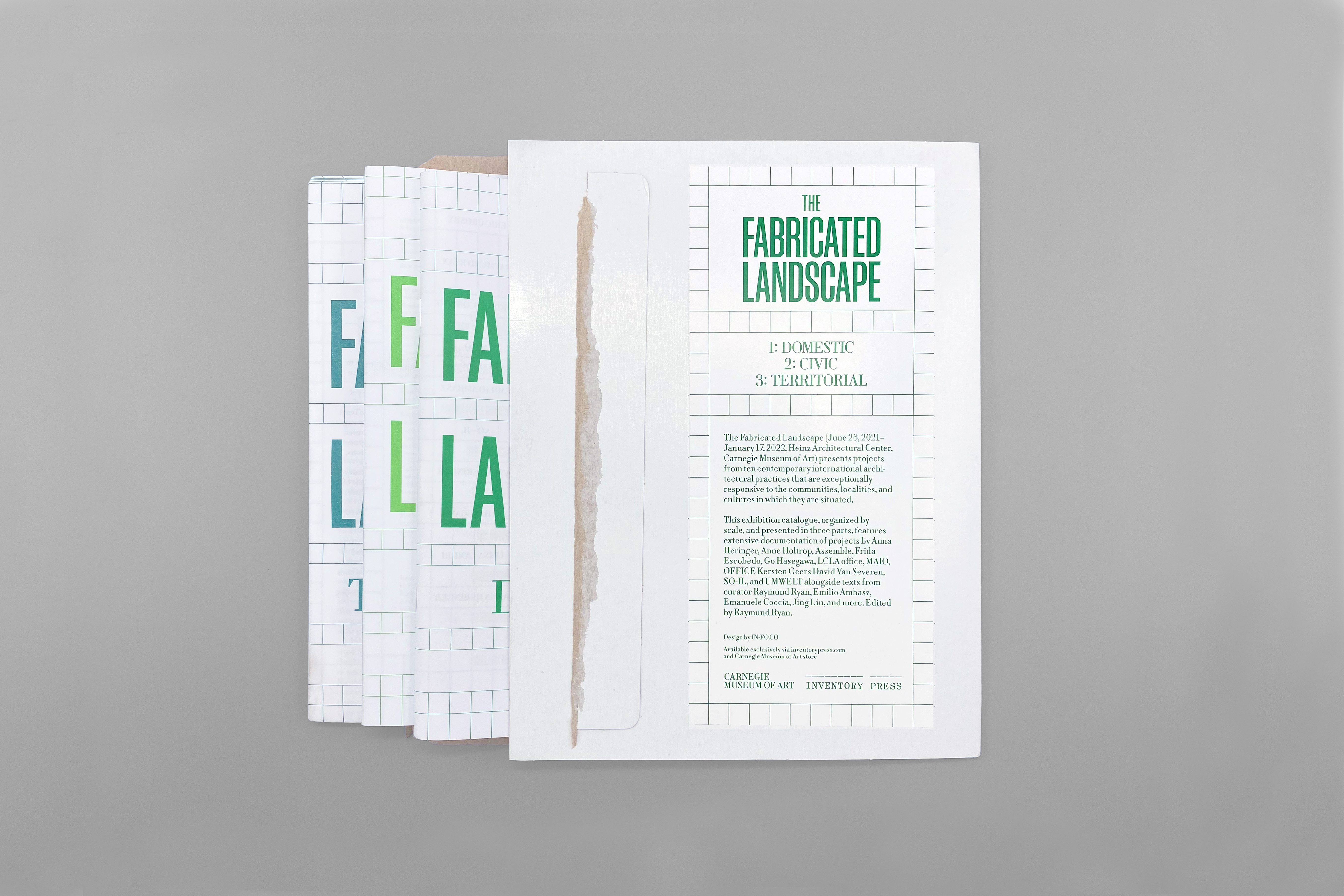 IN-FO.CO designed the exhibition graphics and exhibition guide. Based on a continuous grid system, the publication’s three volumes, each a different shade of Pantone green, are packaged in a 6 × 9 inch folder, but fold out to dramatically varied page sizes: 6 × 9 inches, 12 × 9 inches, and 12 × 18 inches.
